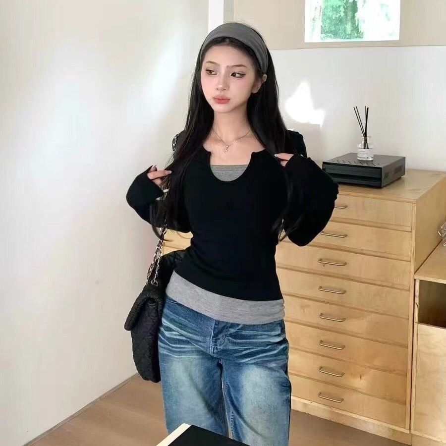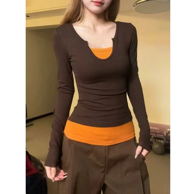 MY16837# 设计感小众撞色拼接假两件长袖t恤新款修身内搭打底衫上衣女裝貨源服裝批發