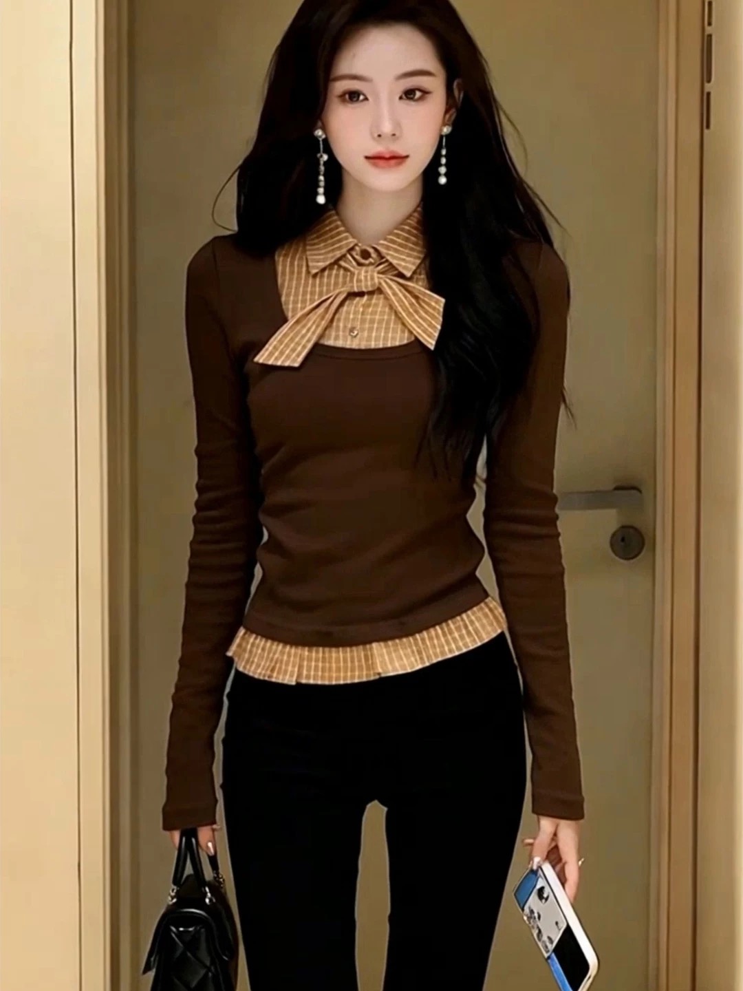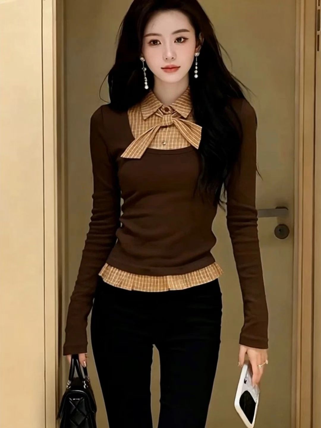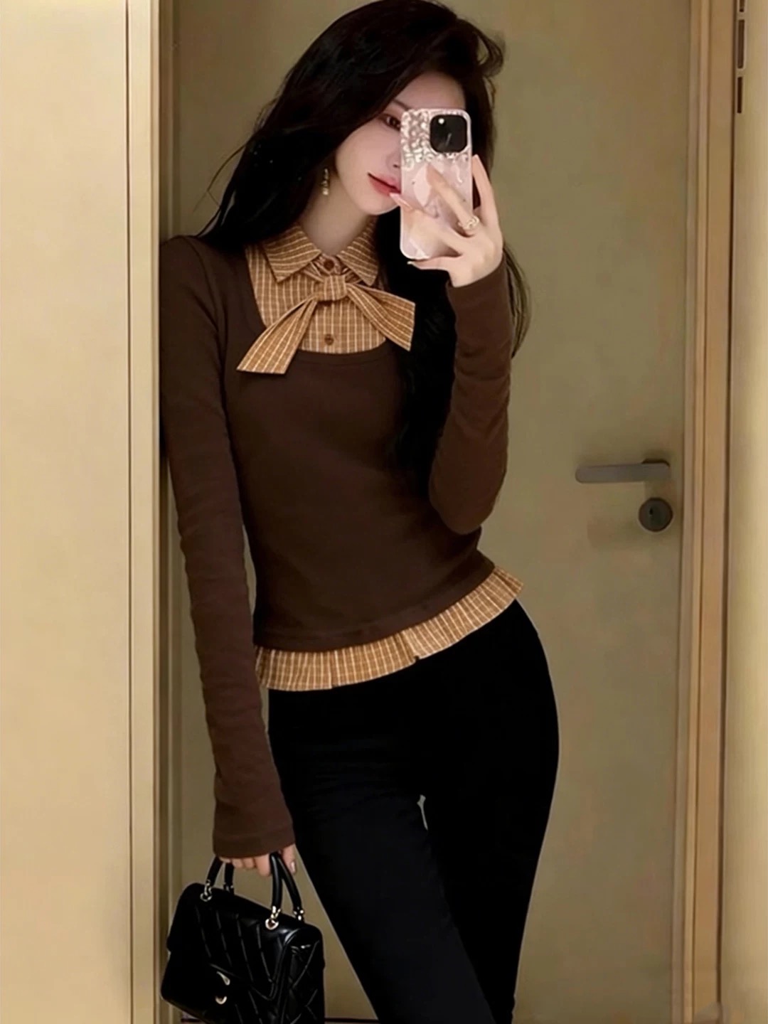 MY16839# 假两件拼接长袖T恤女新款绑带小衫小众设计修身格子上衣女裝貨源服裝批發