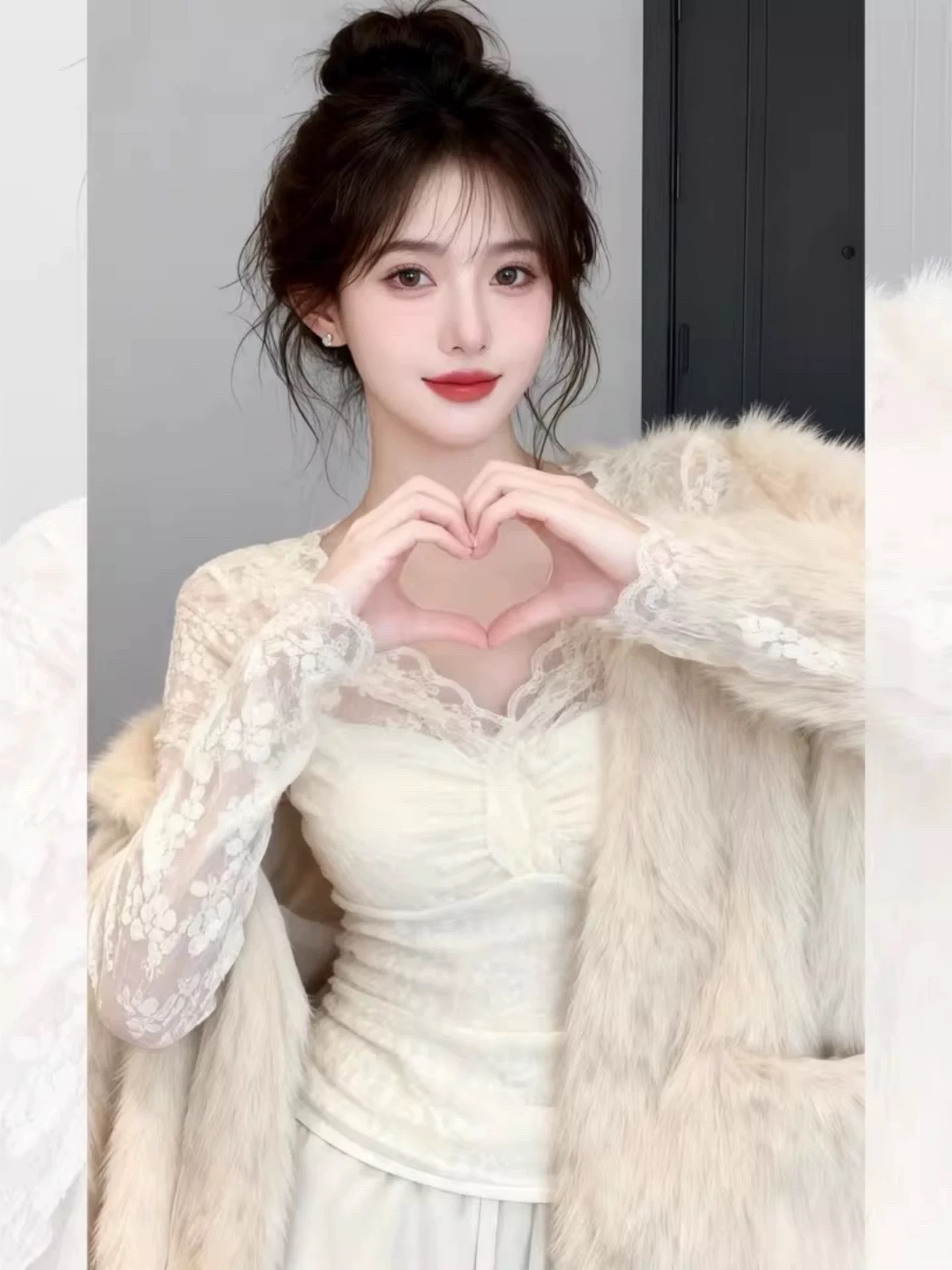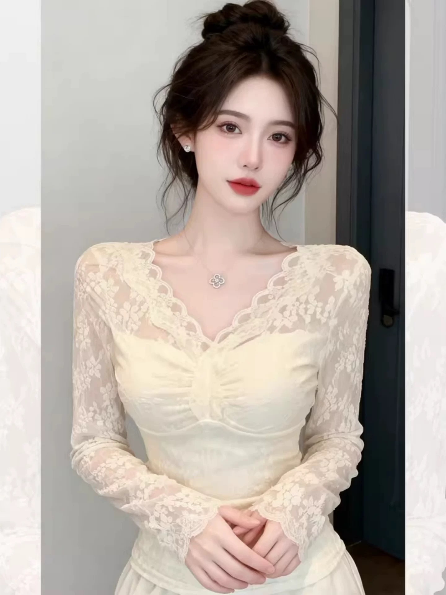 MY16841# 纯欲辣妹v领修身长袖上衣小香风显瘦内搭蕾丝打底衫新款女裝貨源服裝批發