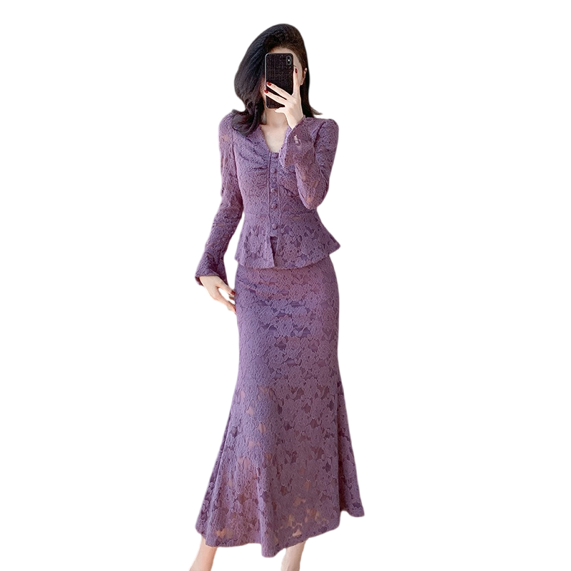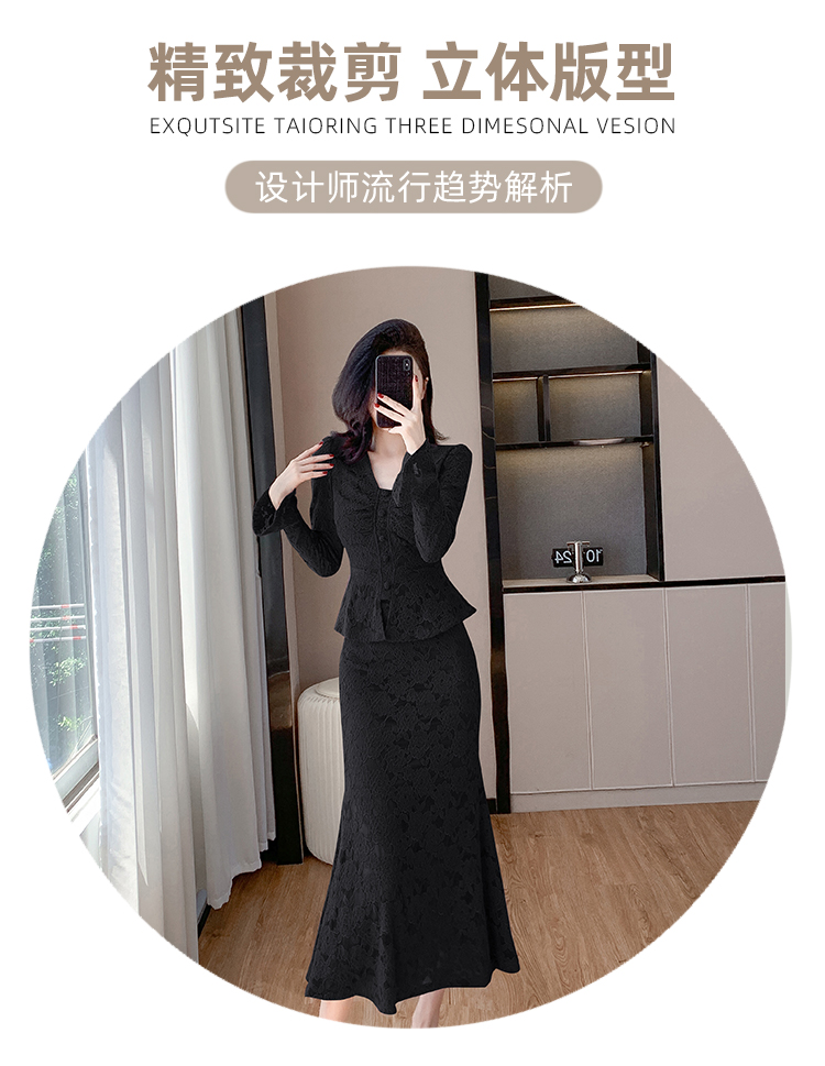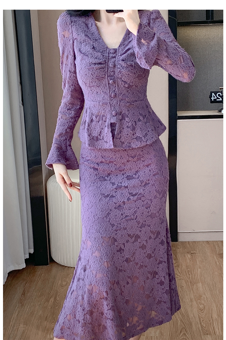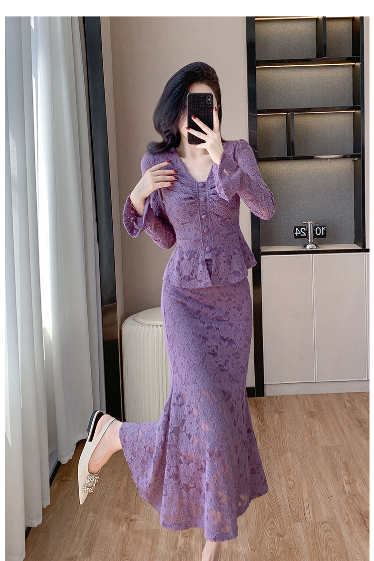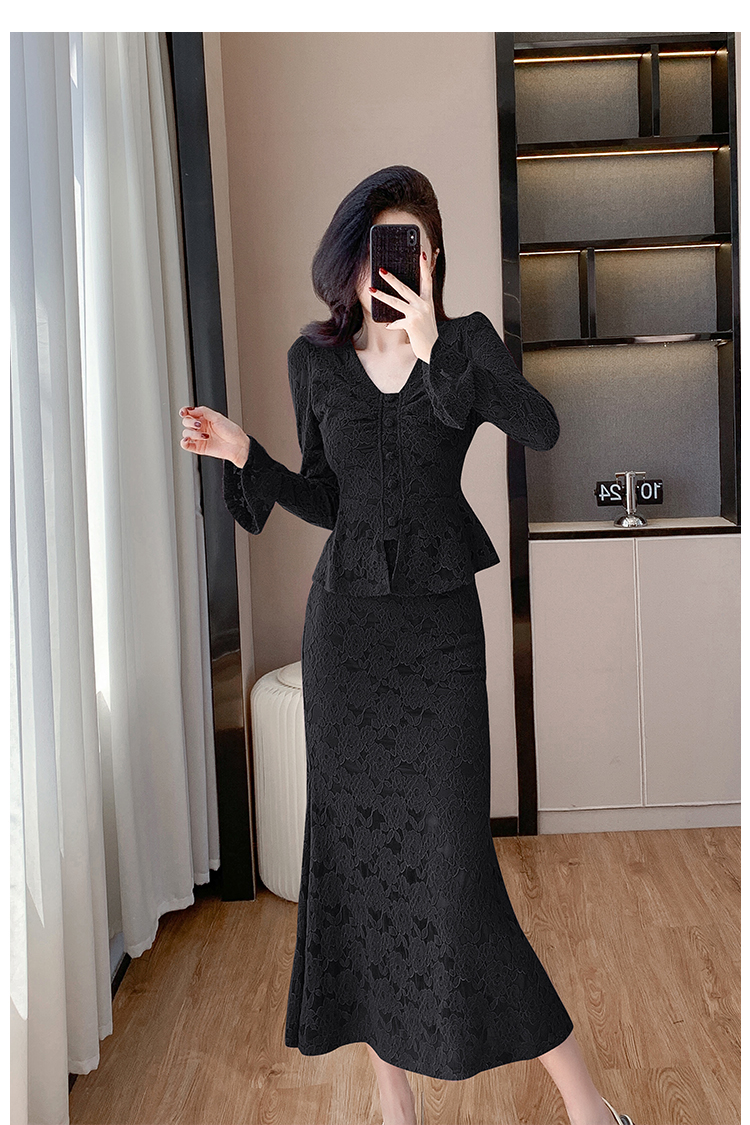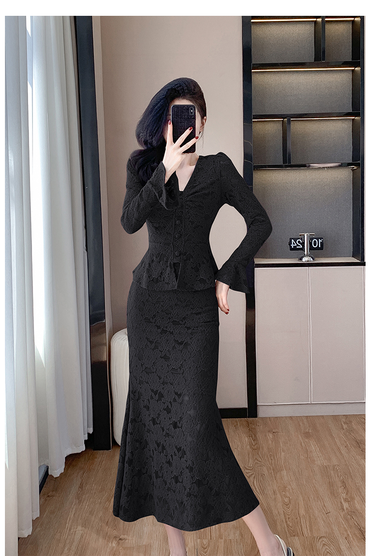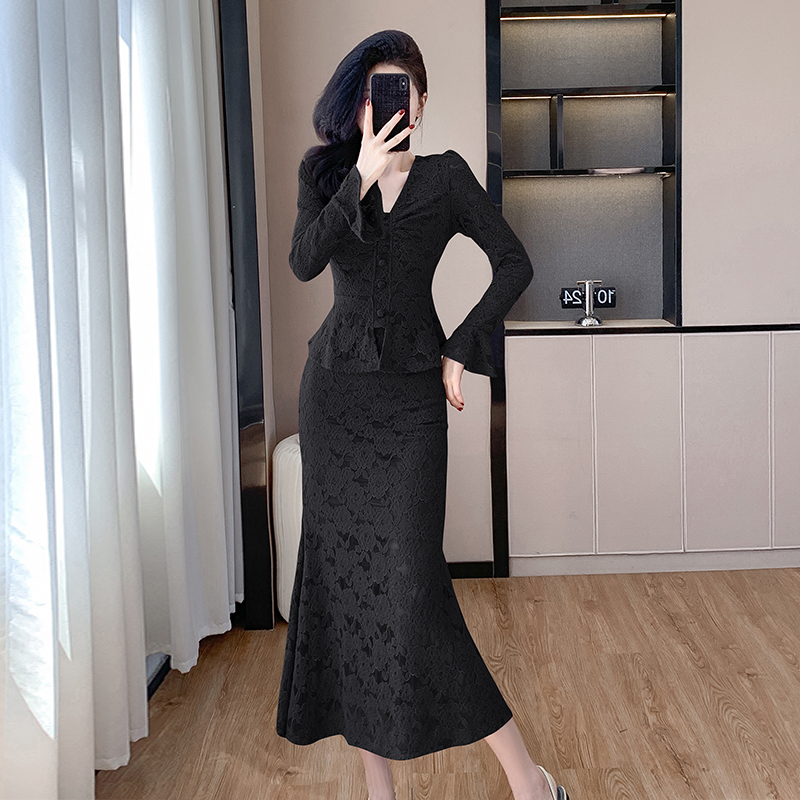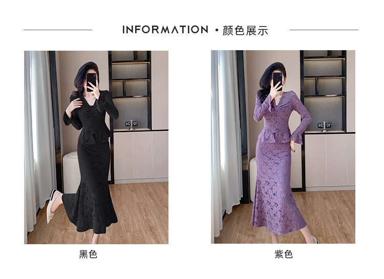 MY16844# V领喇叭袖时尚上衣鱼尾半身裙时髦两件套套装女裝貨源服裝批發
