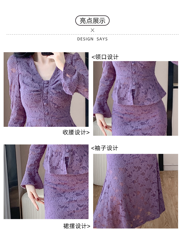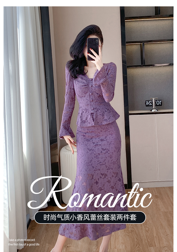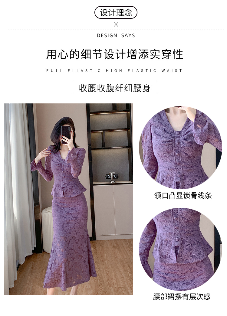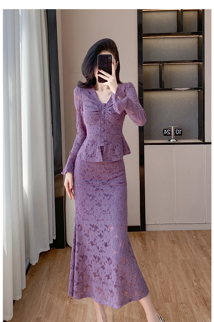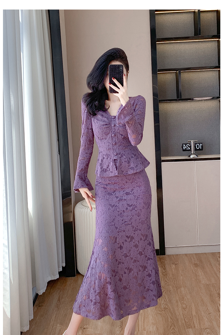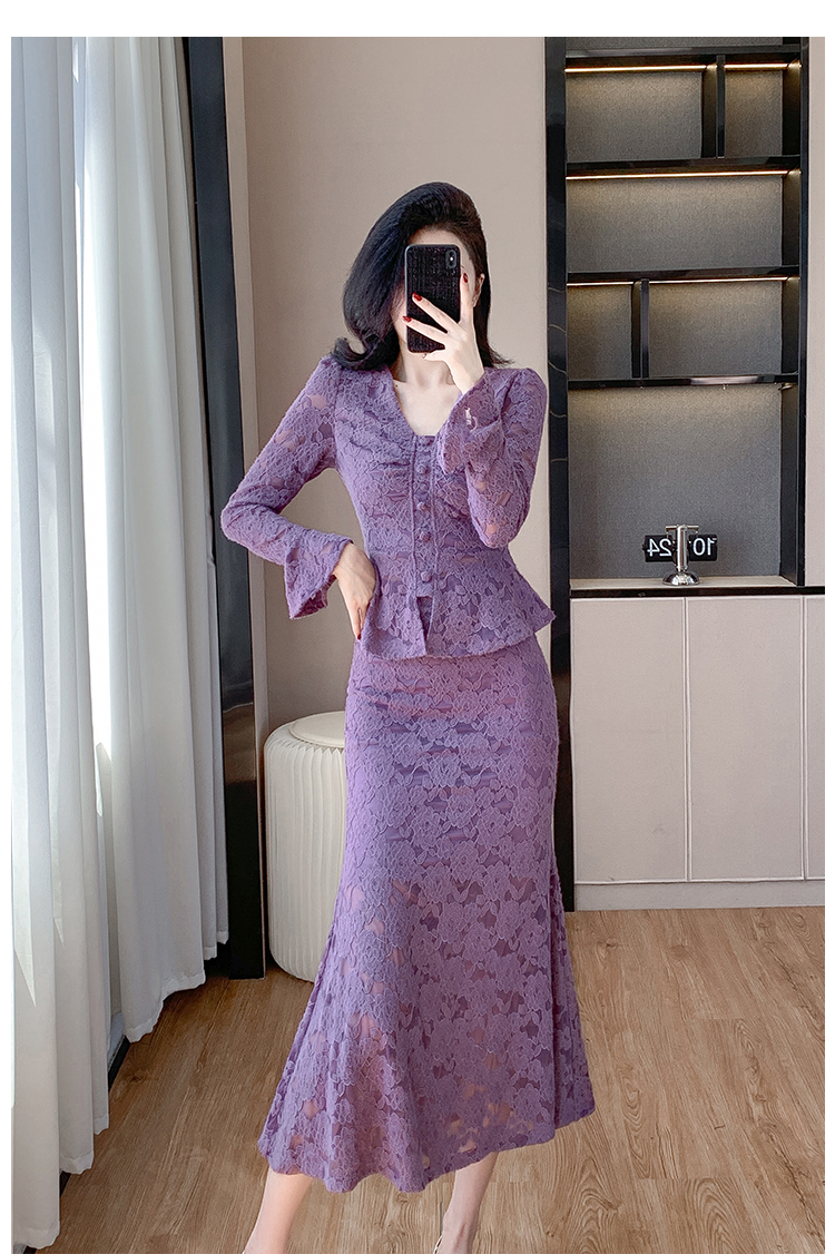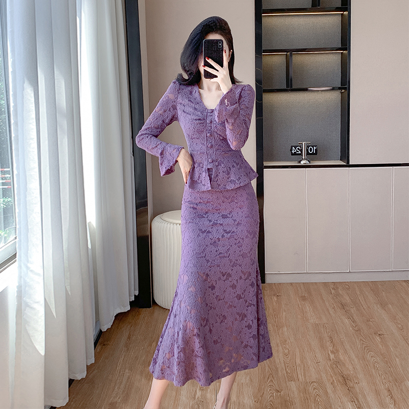 MY16844# V领喇叭袖时尚上衣鱼尾半身裙时髦两件套套装女裝貨源服裝批發