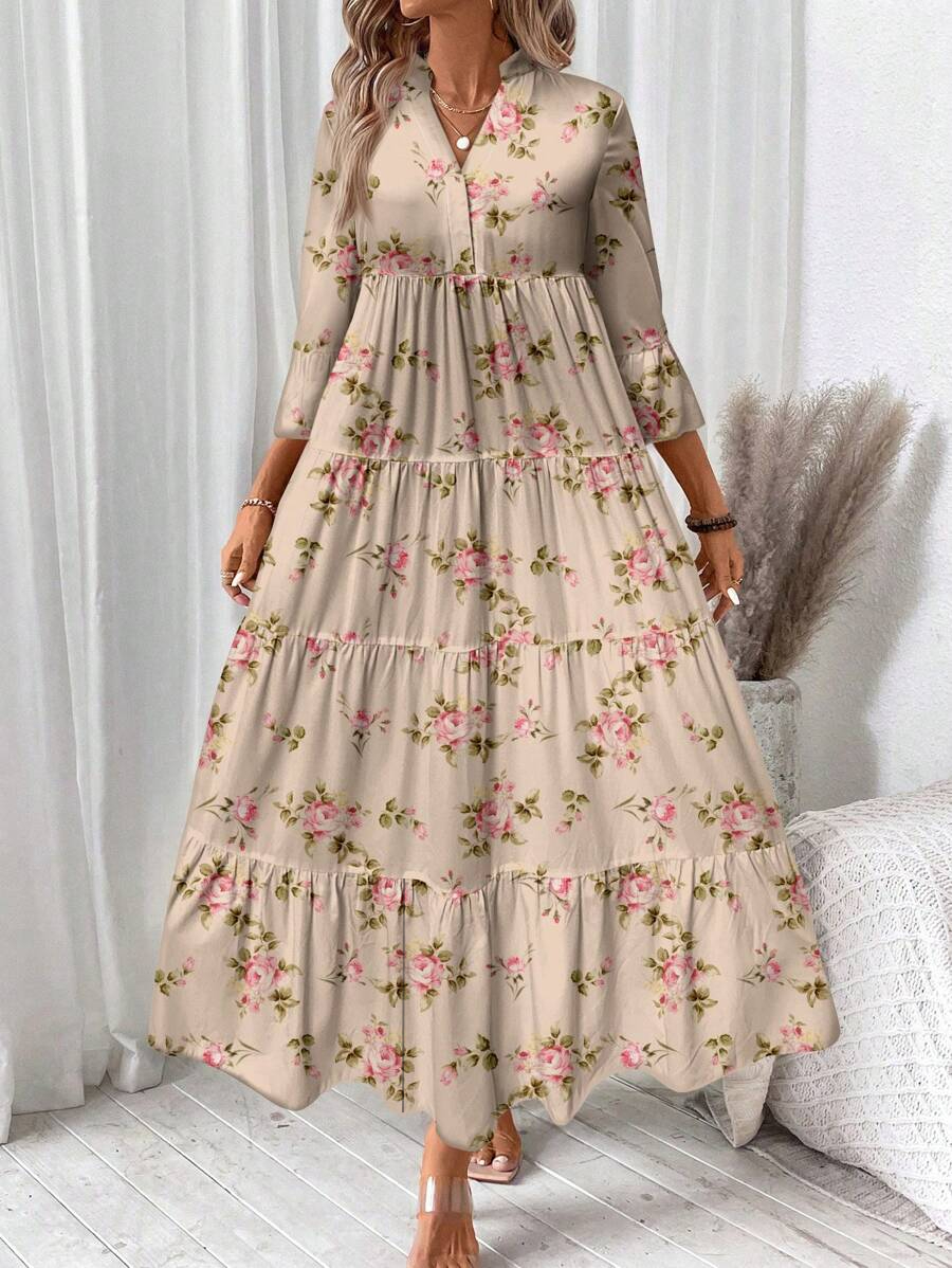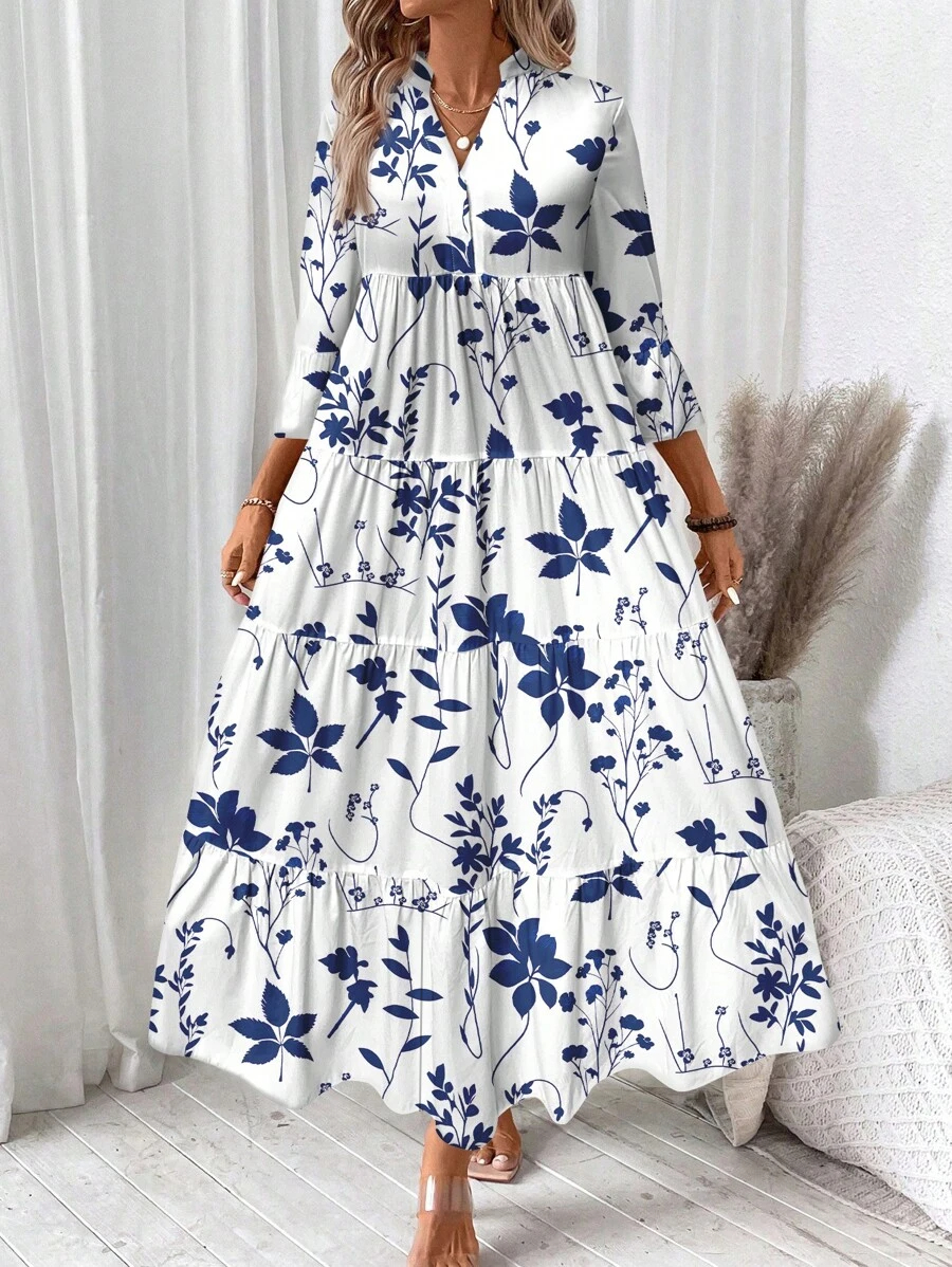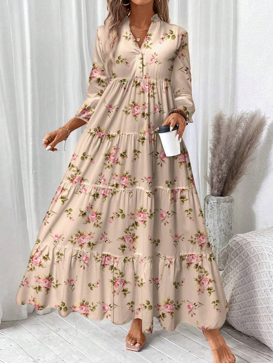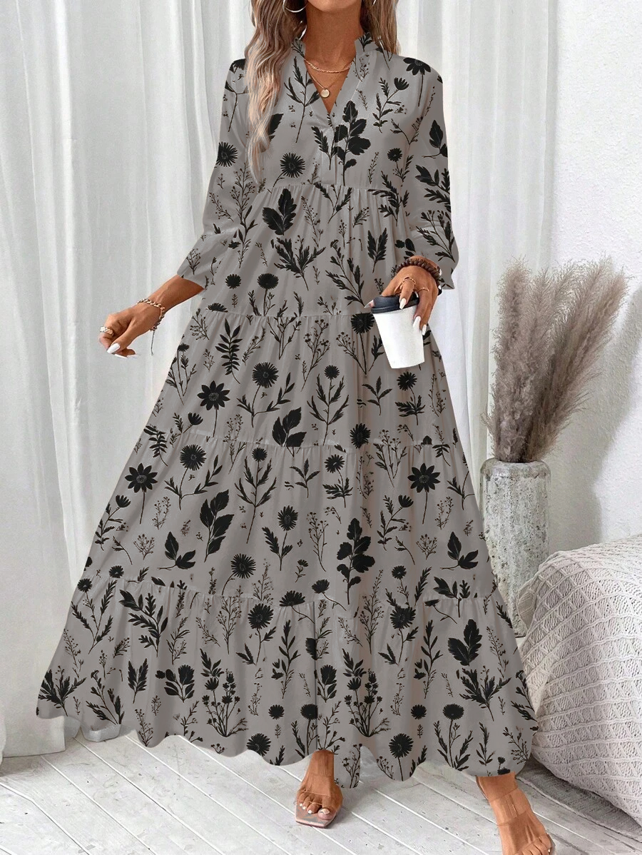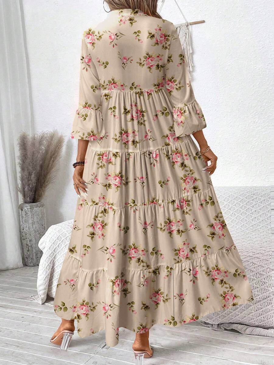MY16870# 大码优雅时尚女士豹纹经典花卉印花 V 领蛋糕层长袖连衣裙女裝貨源服裝批發