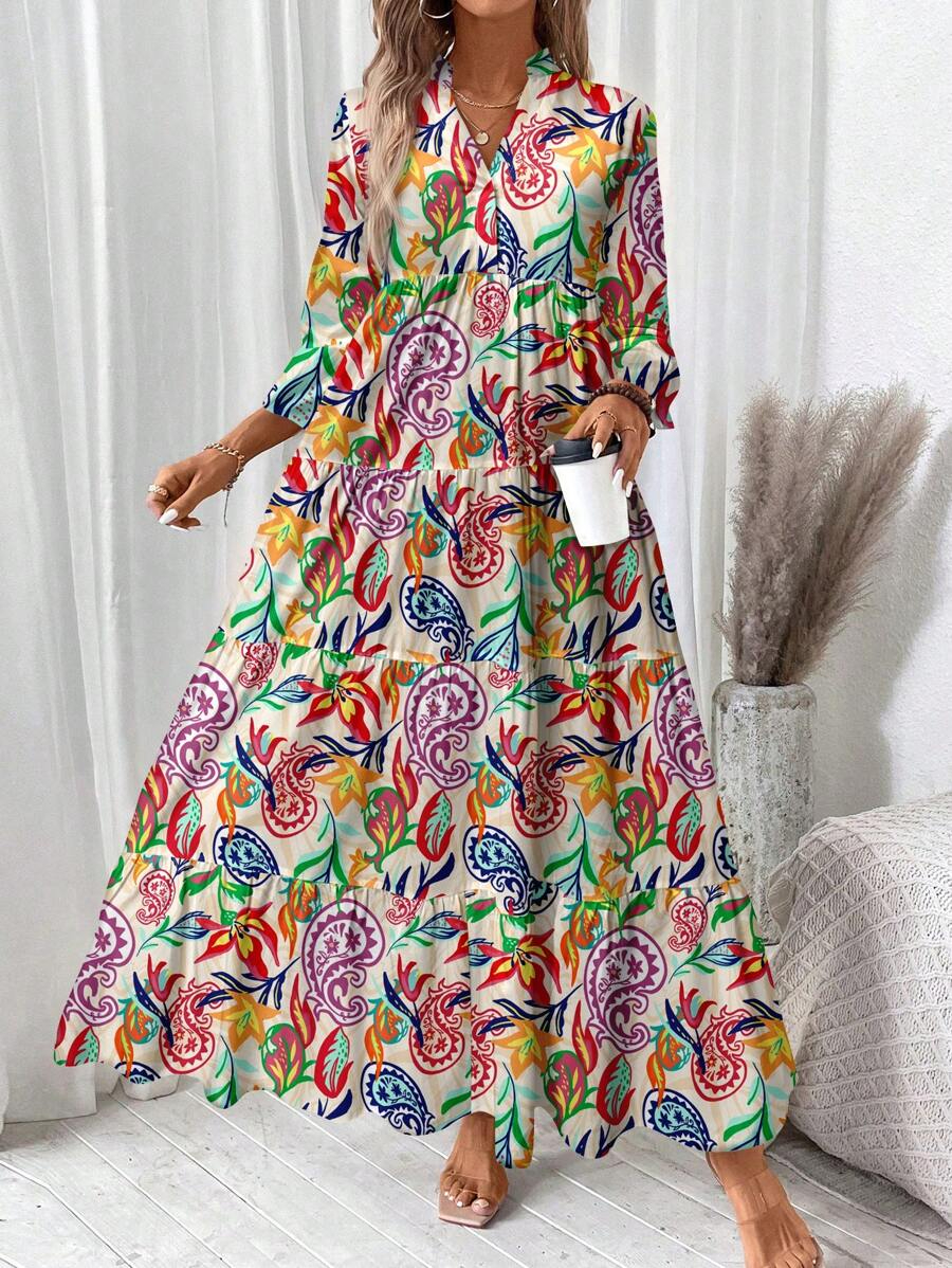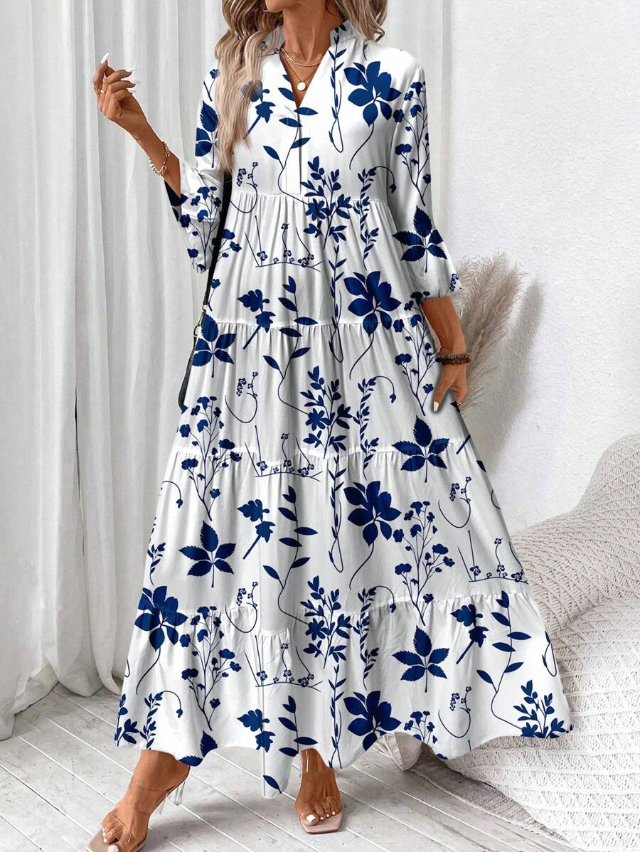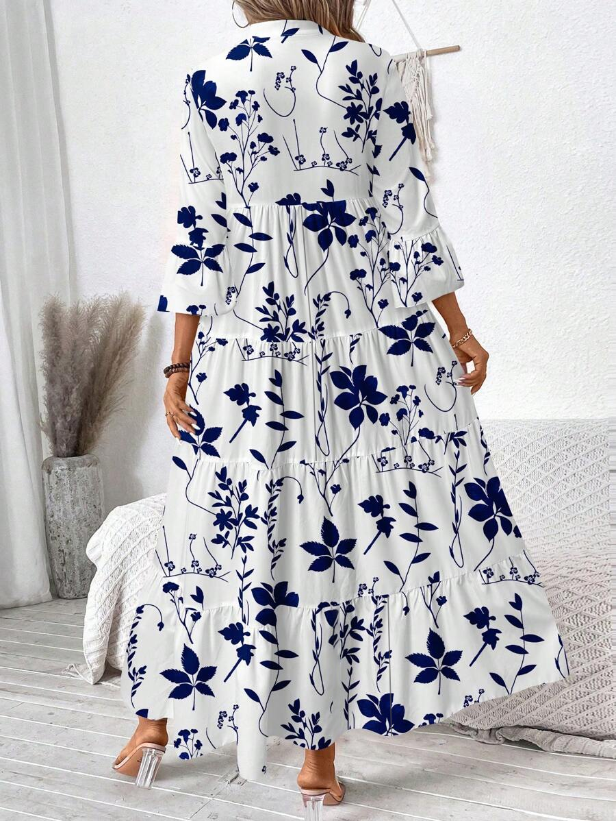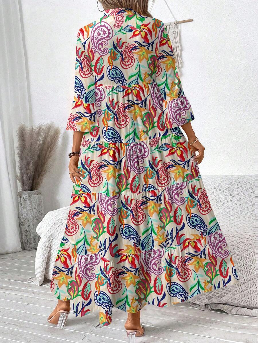 MY16870# 大码优雅时尚女士豹纹经典花卉印花 V 领蛋糕层长袖连衣裙女裝貨源服裝批發