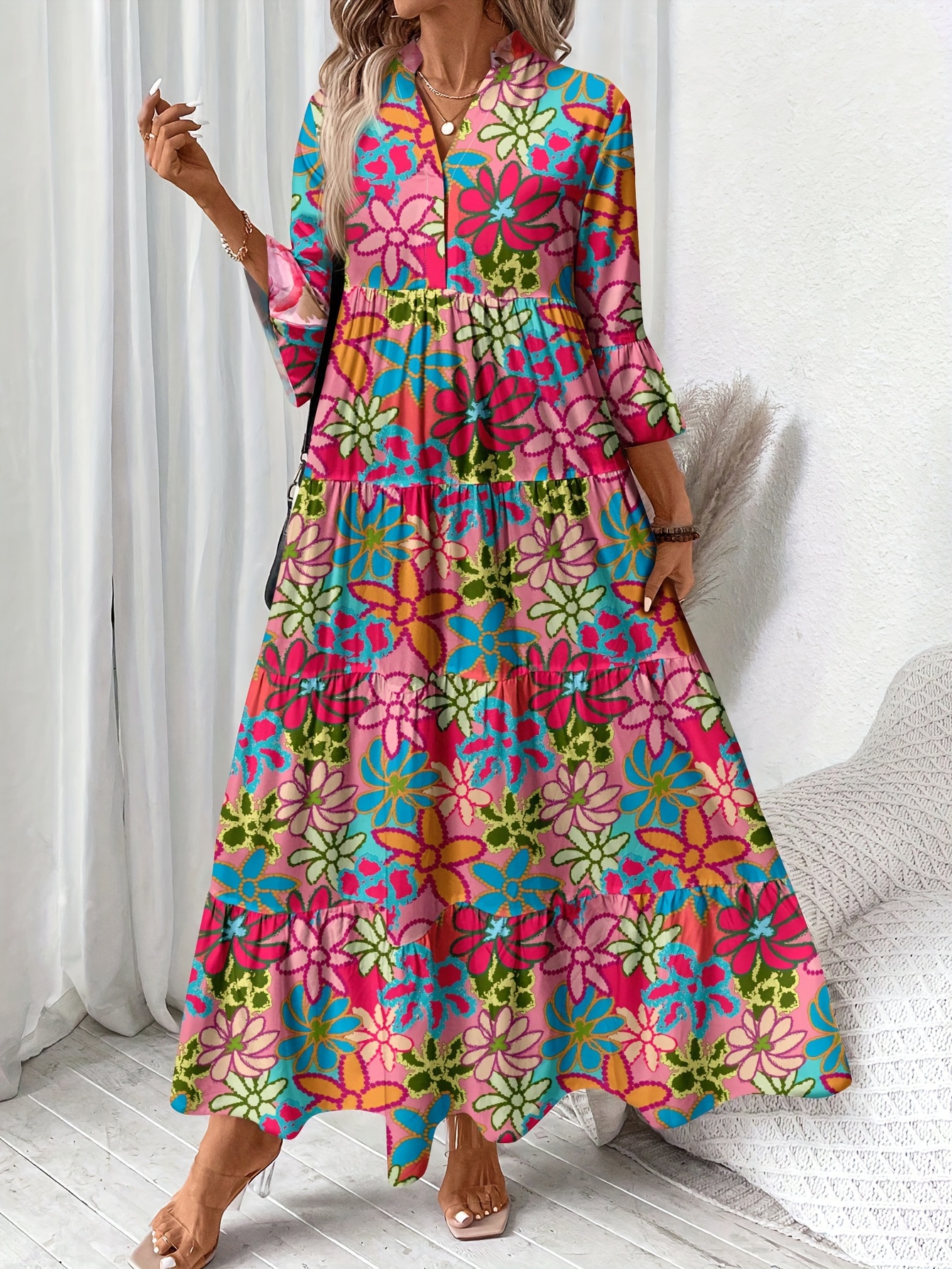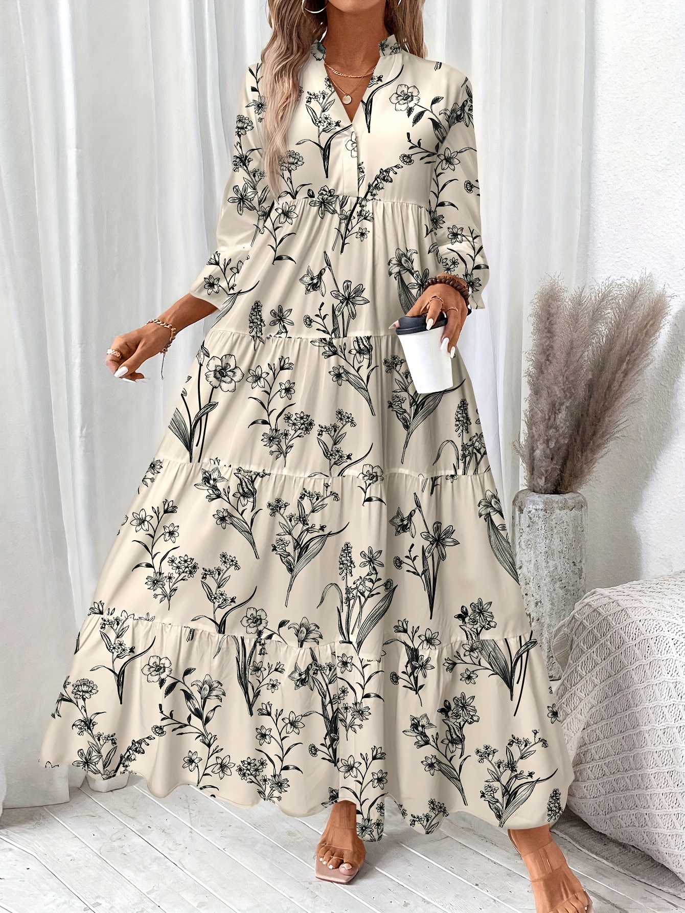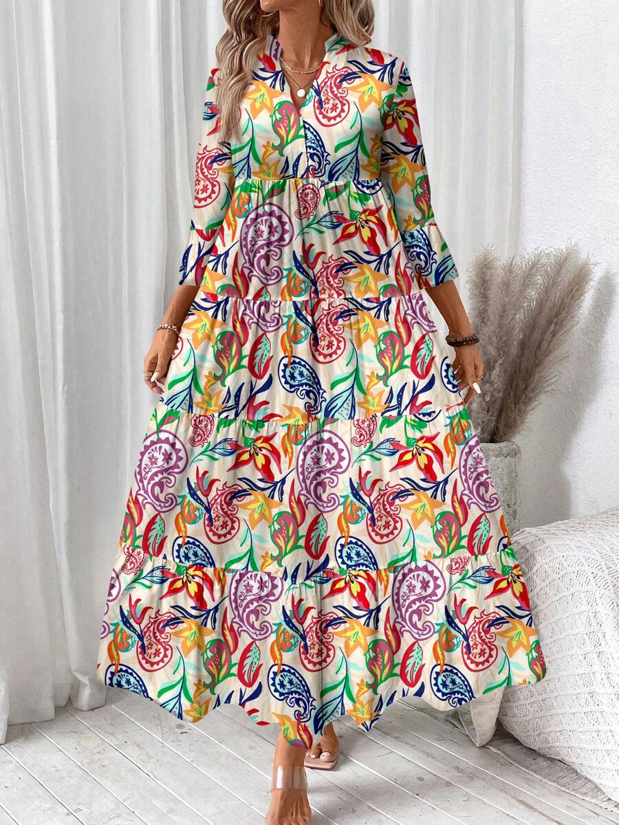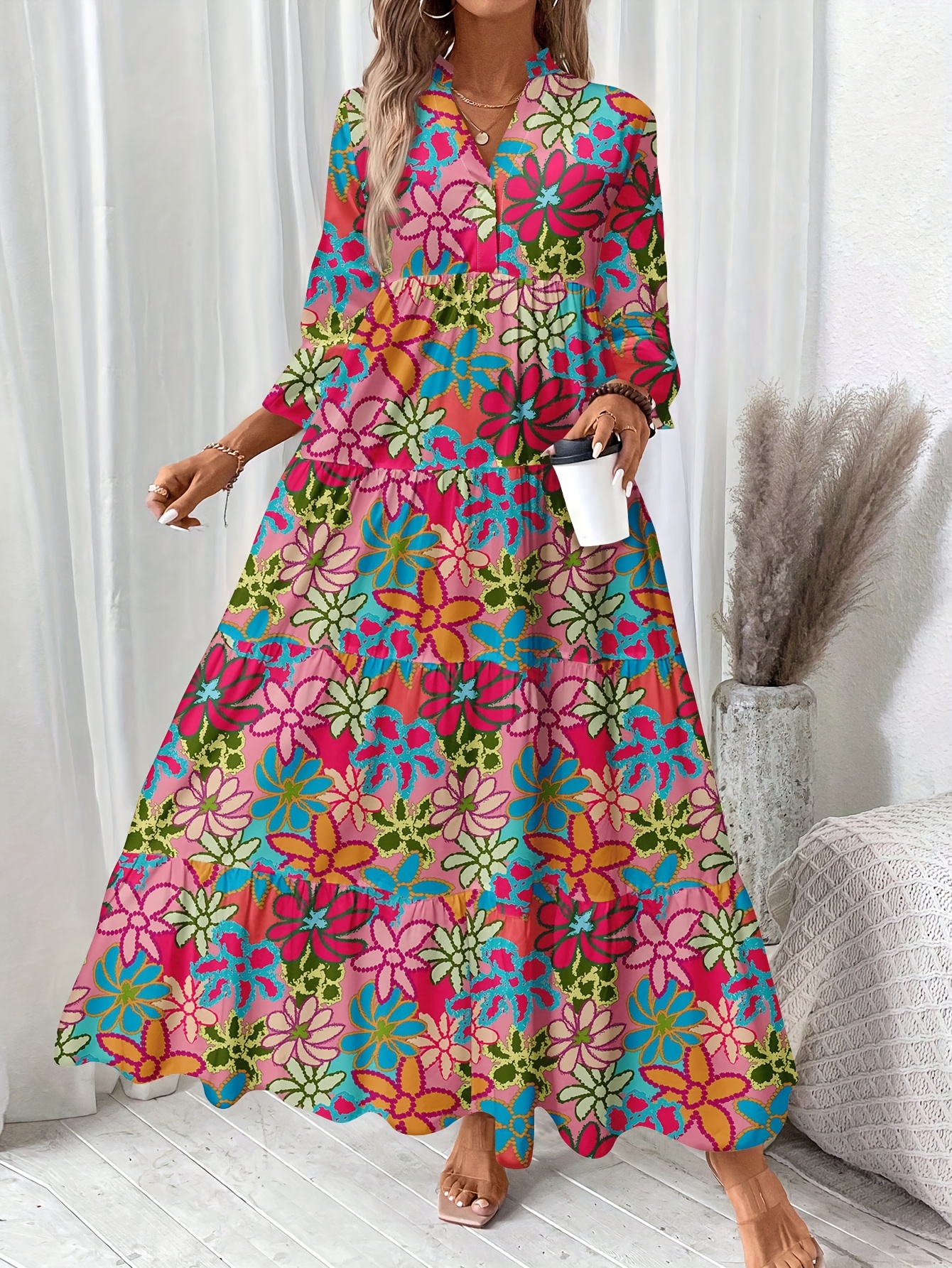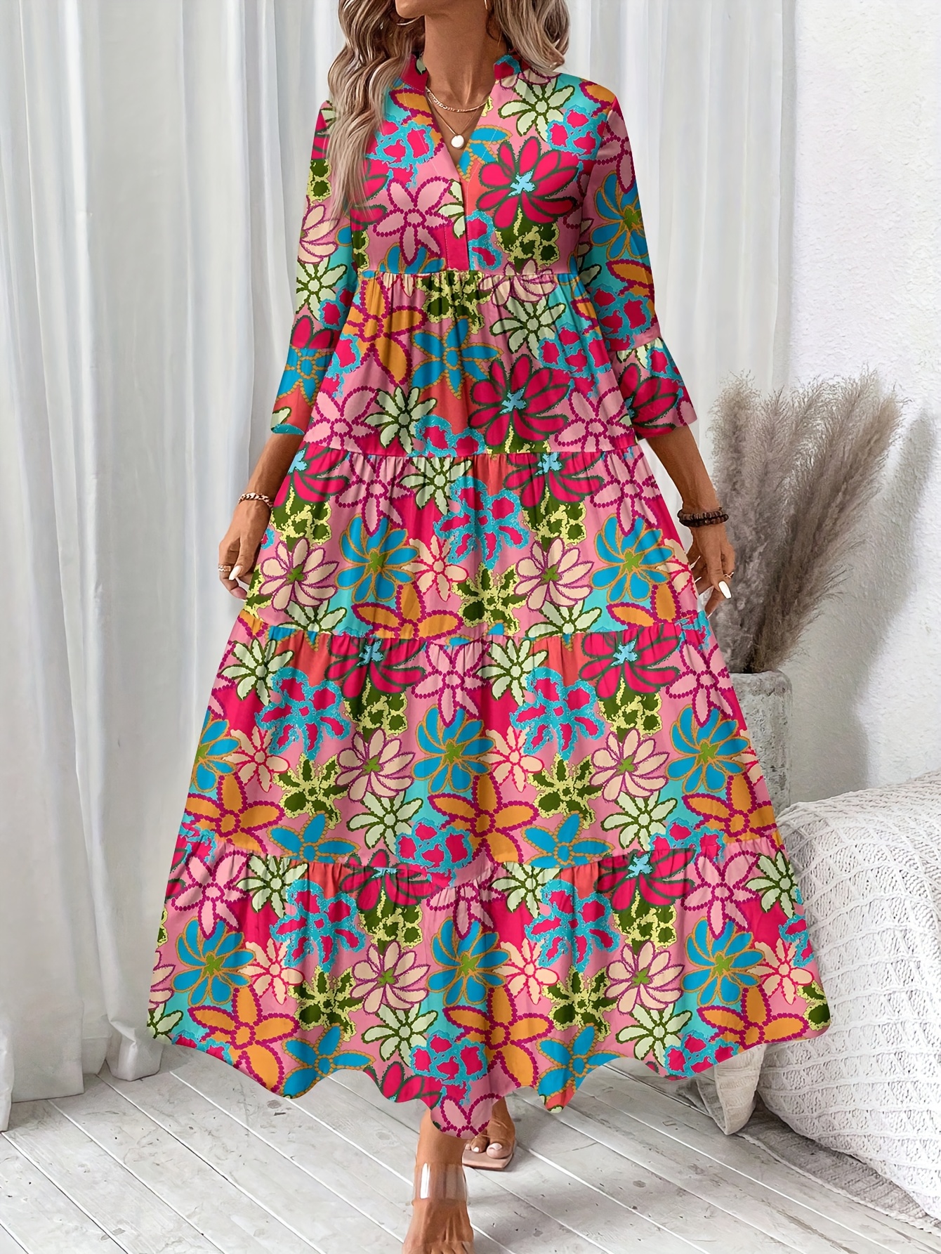 MY16870# 大码优雅时尚女士豹纹经典花卉印花 V 领蛋糕层长袖连衣裙女裝貨源服裝批發