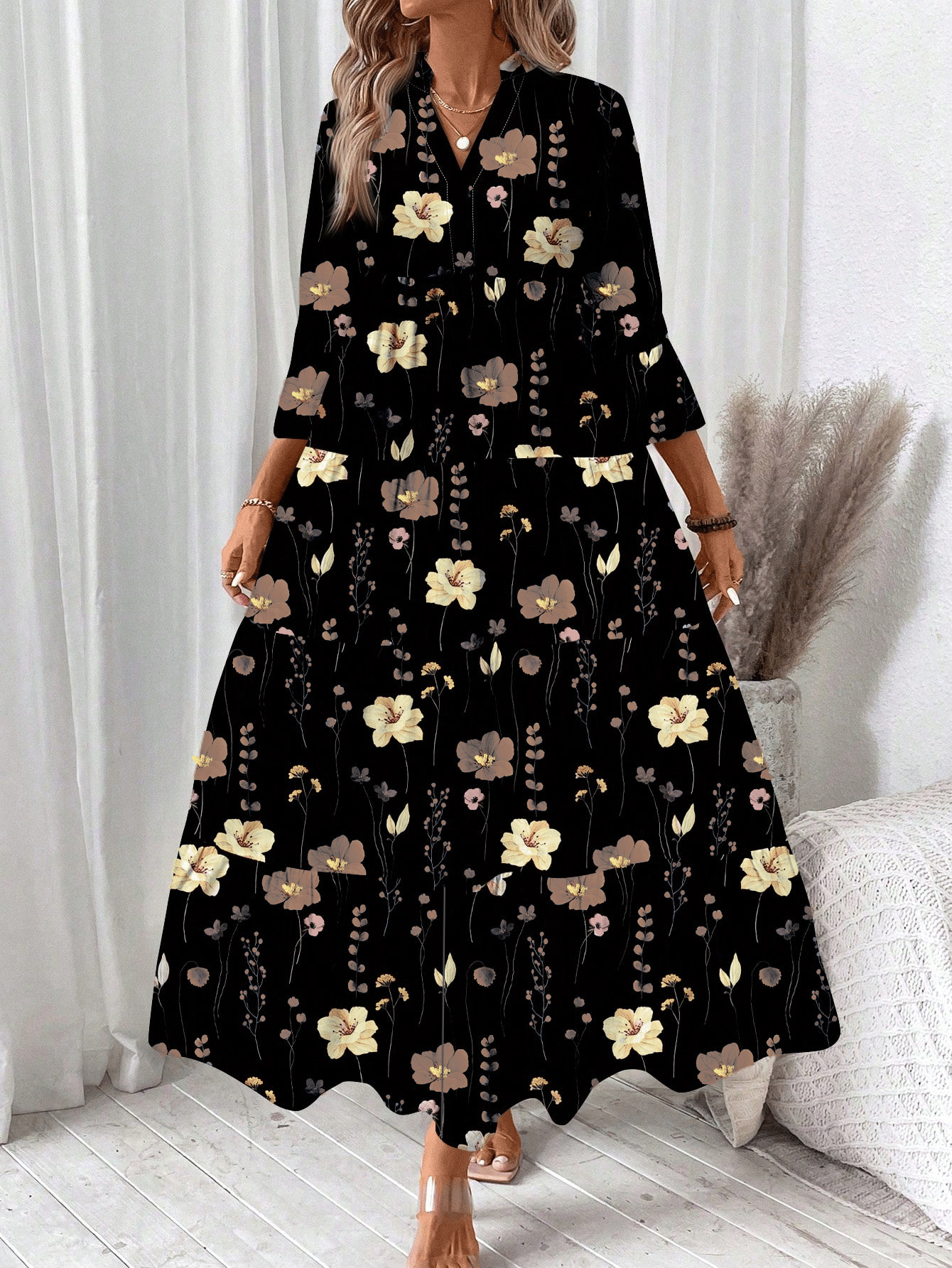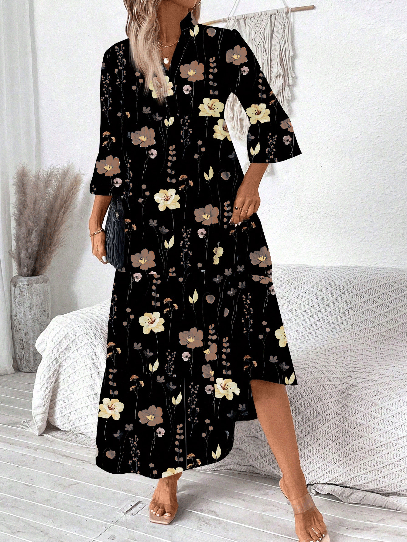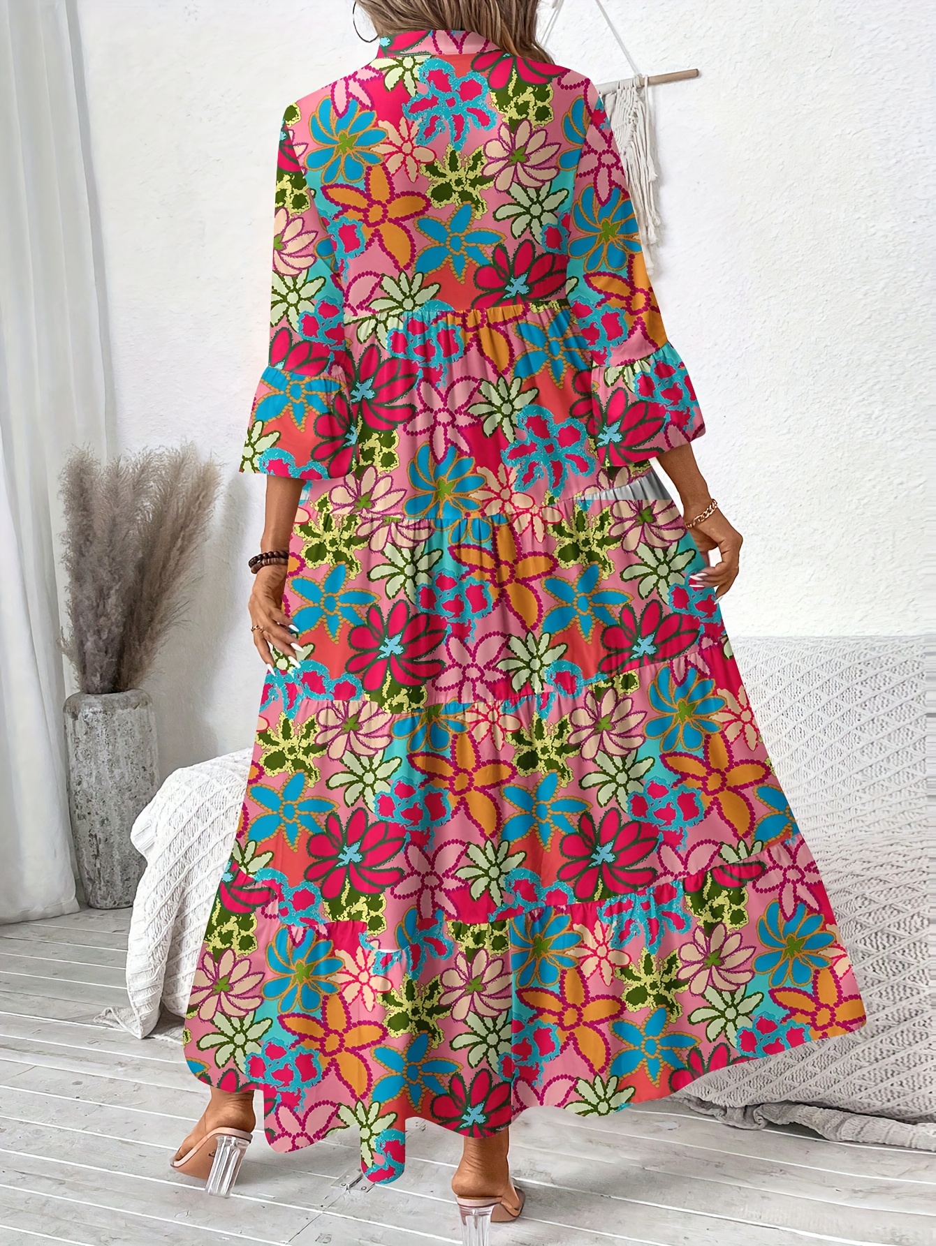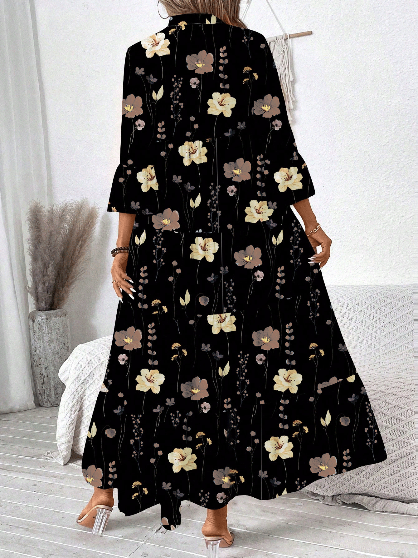 MY16870# 大码优雅时尚女士豹纹经典花卉印花 V 领蛋糕层长袖连衣裙女裝貨源服裝批發