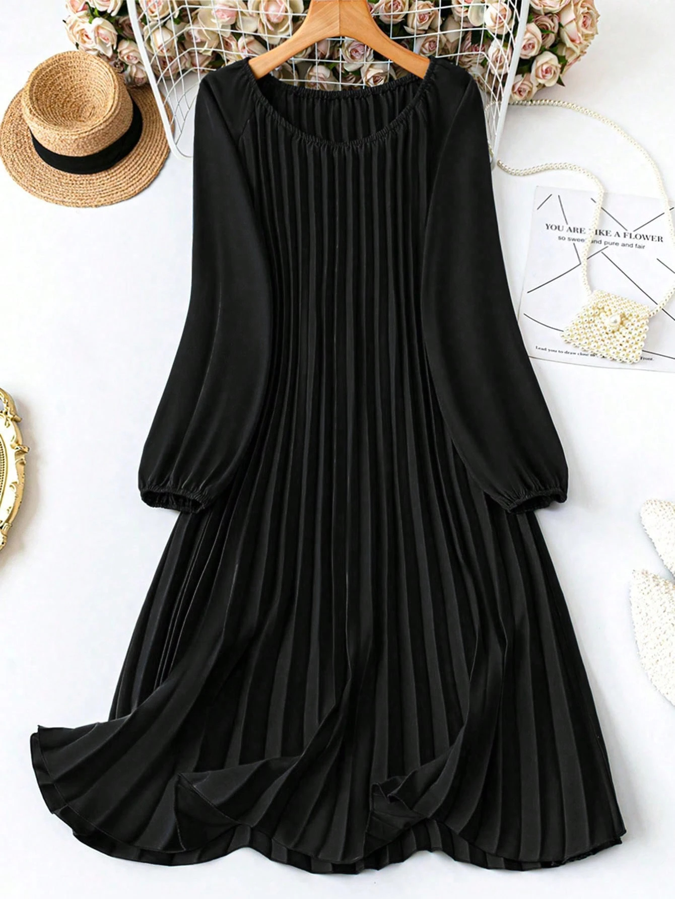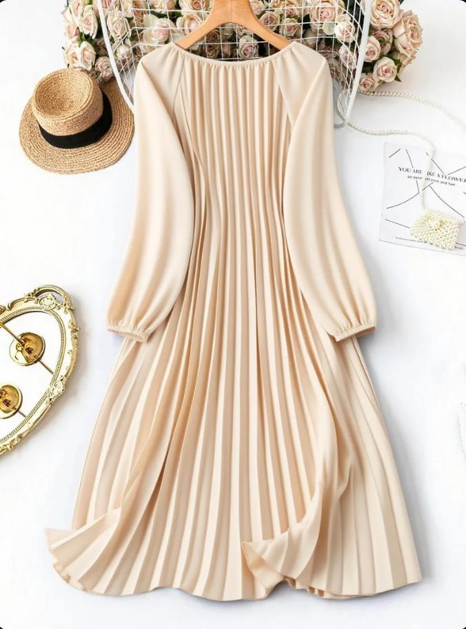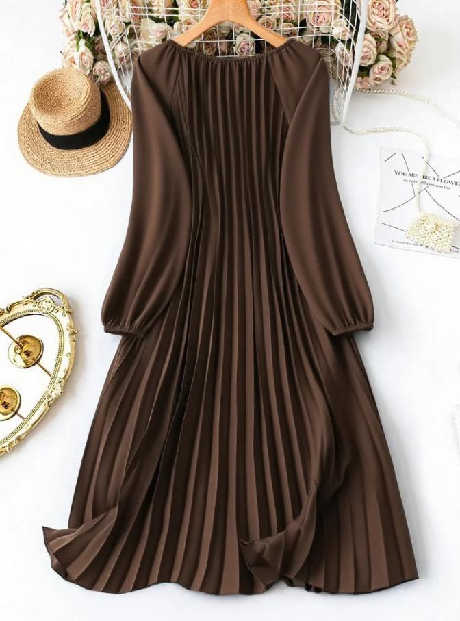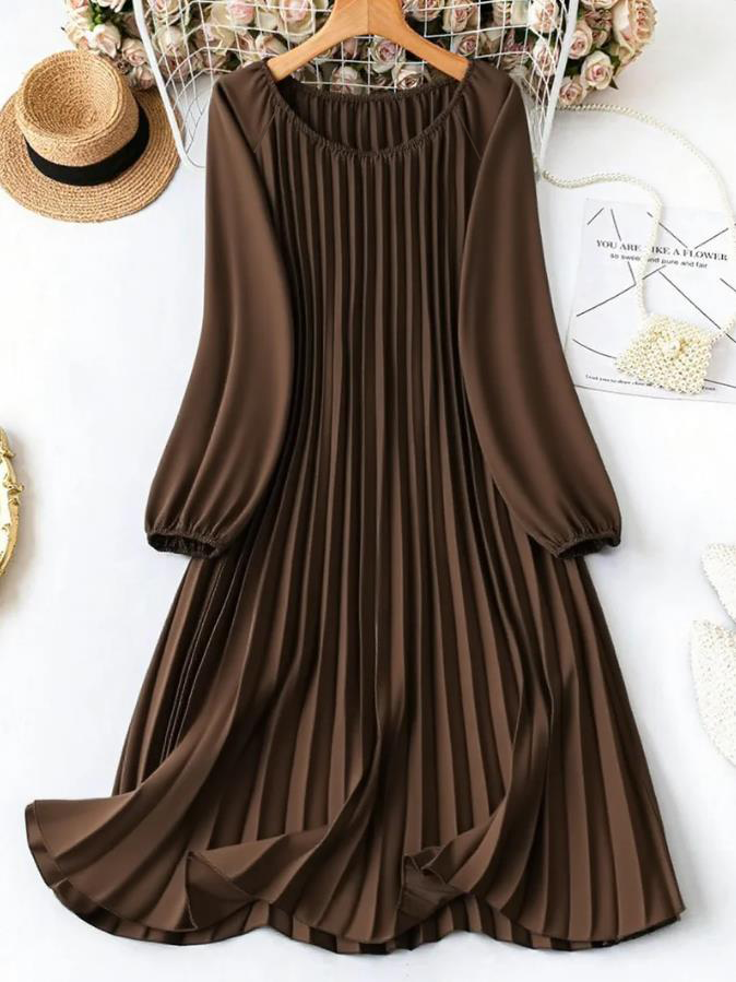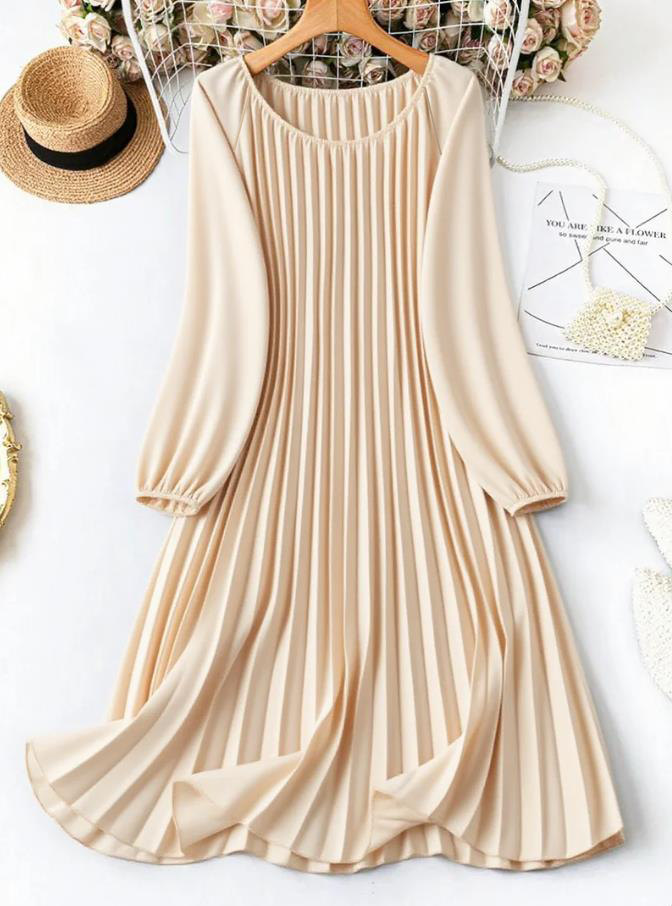 MY16871# 大码宽松圆领纯色长袖连衣裙,压褶日常简约通勤休闲优雅女装女裝貨源服裝批發