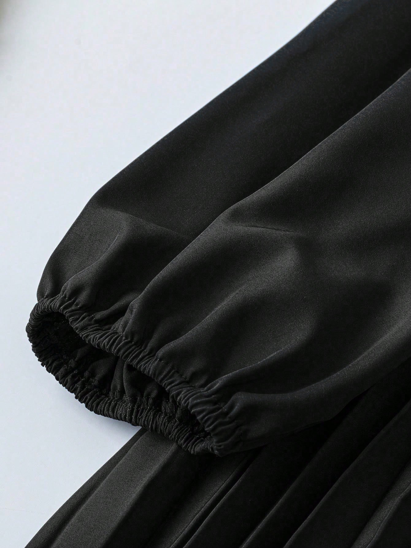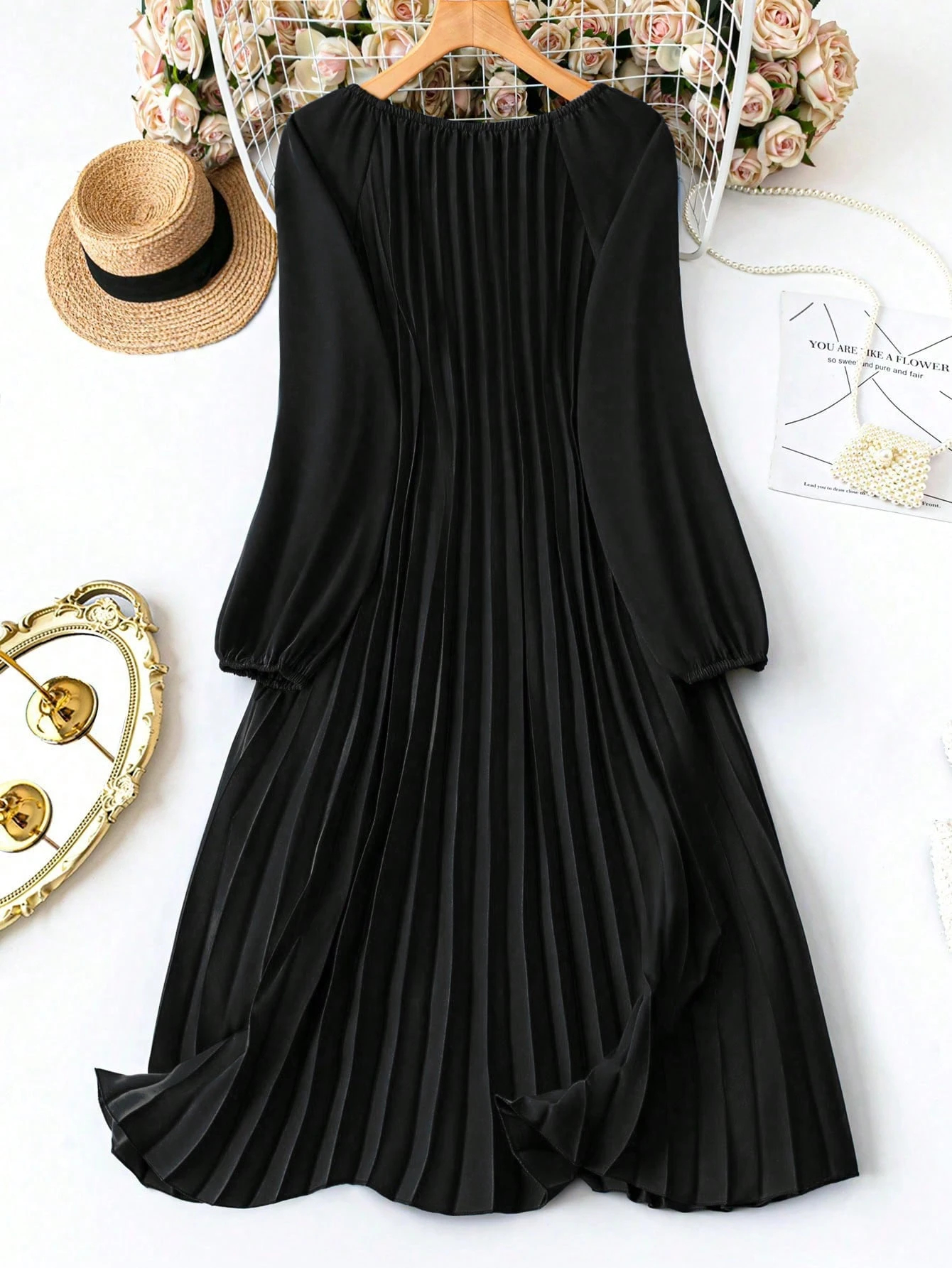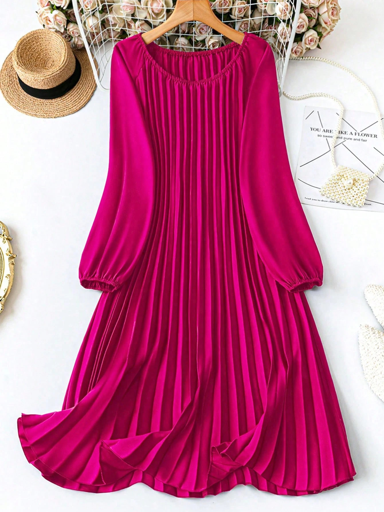 MY16871# 大码宽松圆领纯色长袖连衣裙,压褶日常简约通勤休闲优雅女装女裝貨源服裝批發