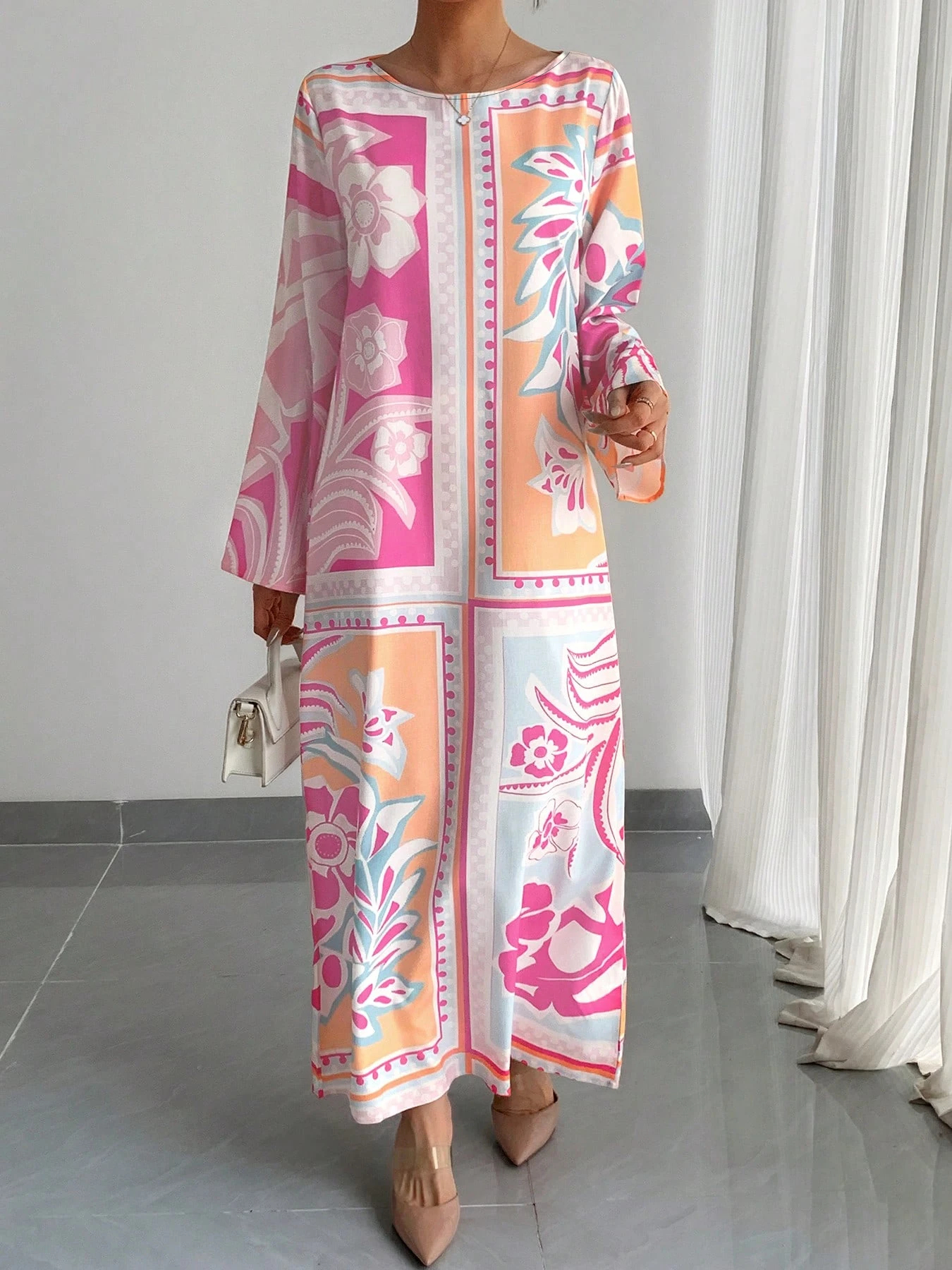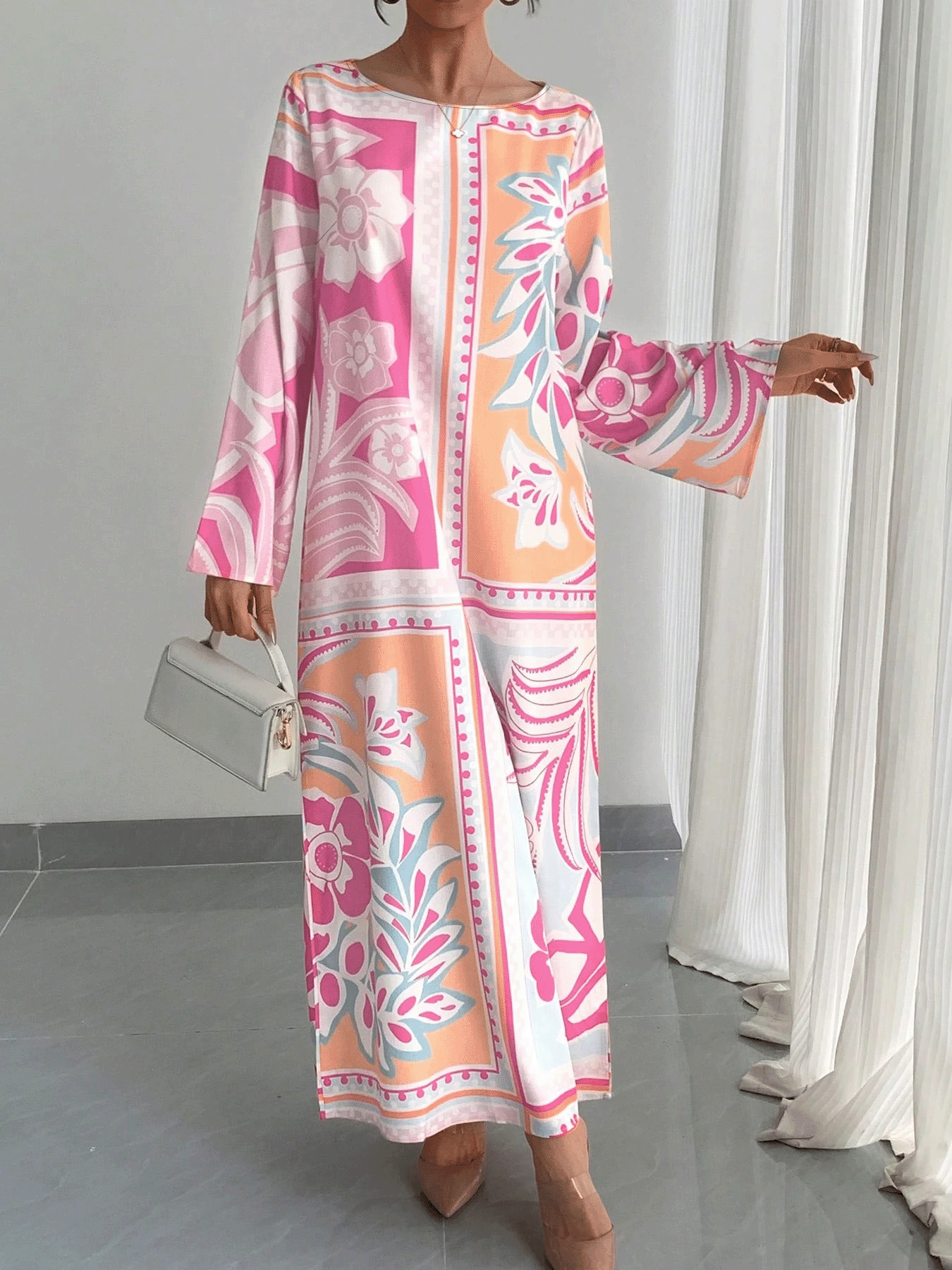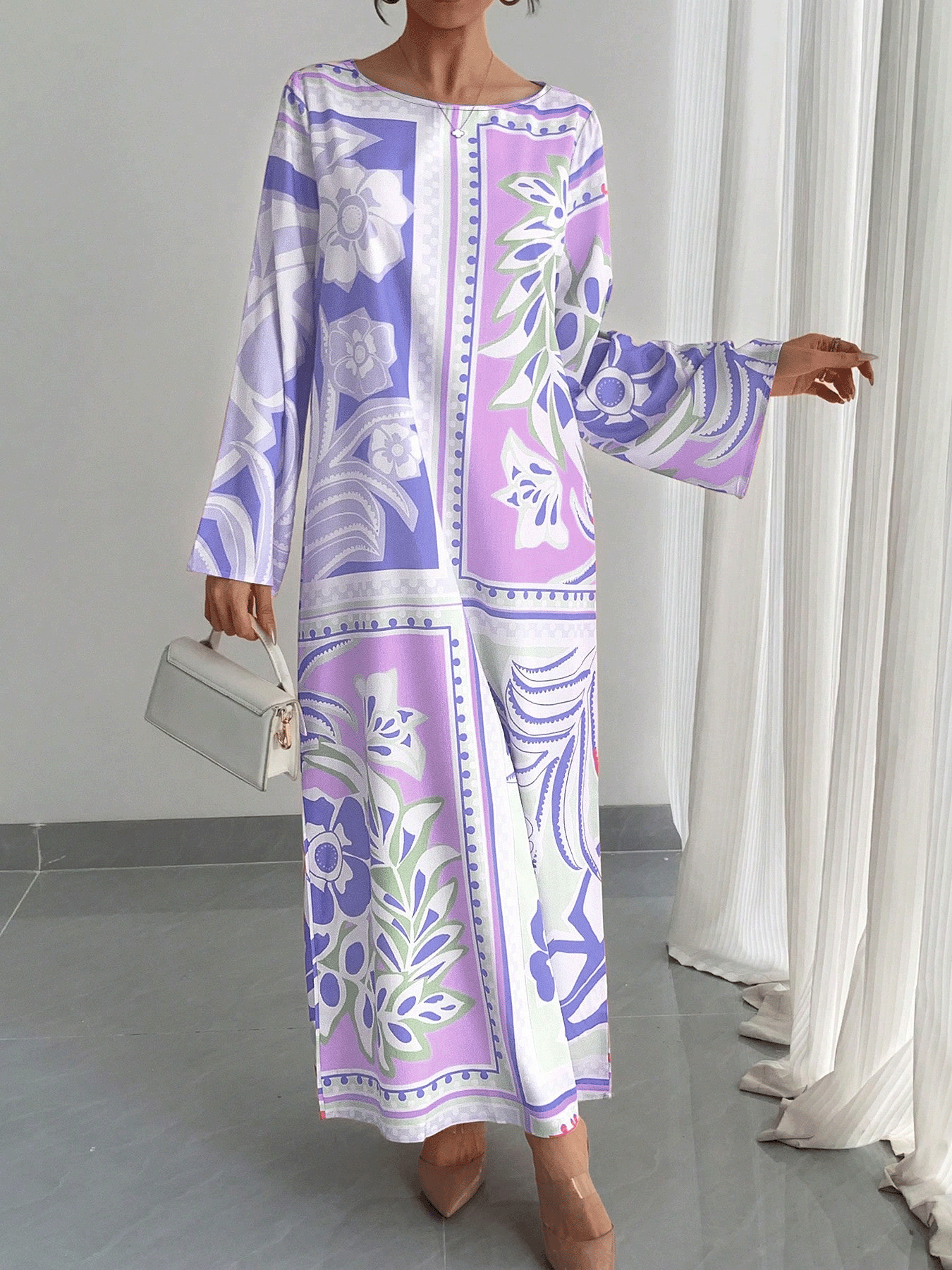 MY16873# 休闲日常通勤圆领长袖优雅印花长裙,圆领长袖中东阿拉伯风格长袍女裝貨源服裝批發