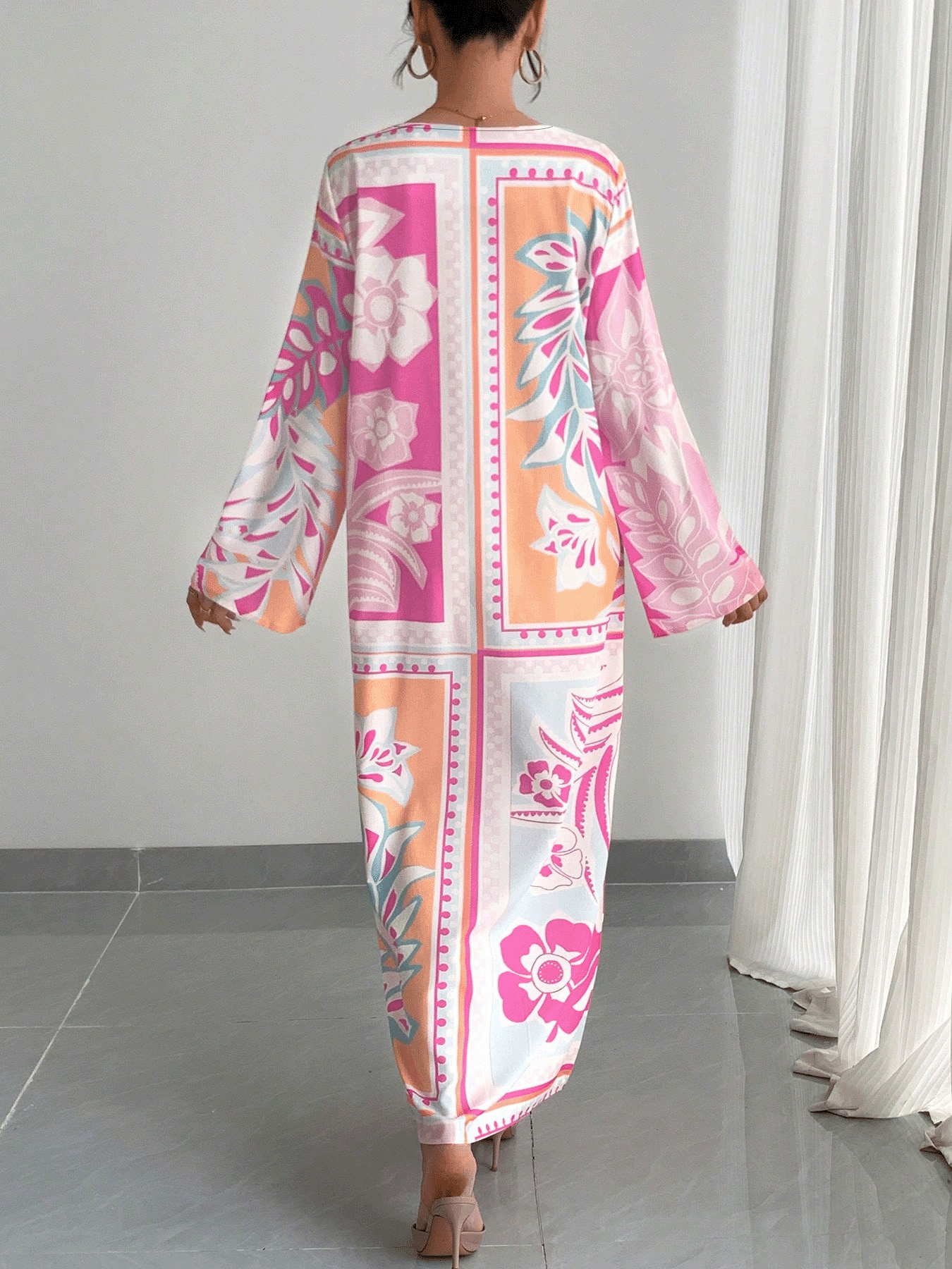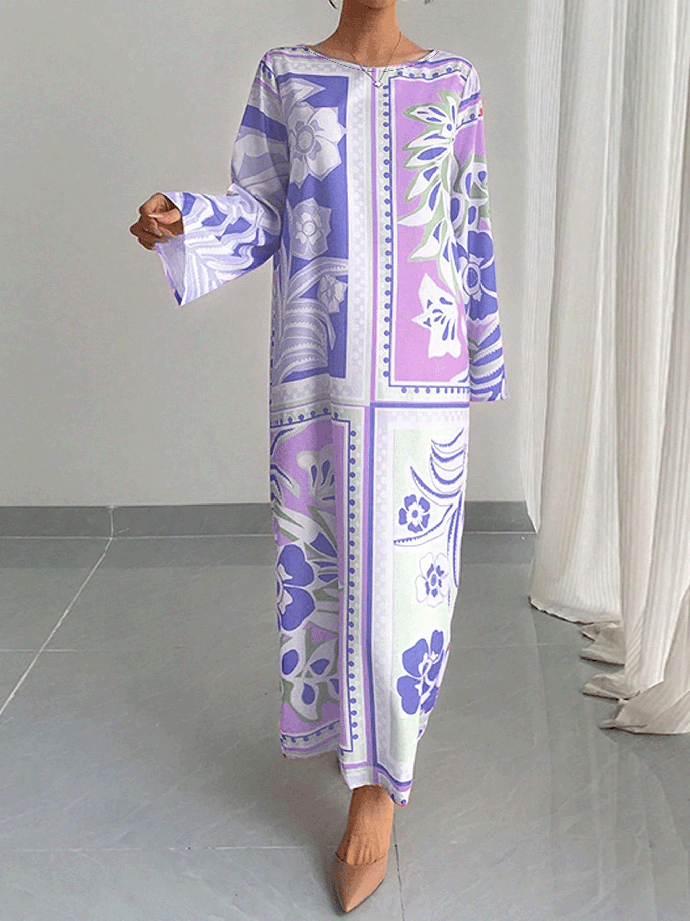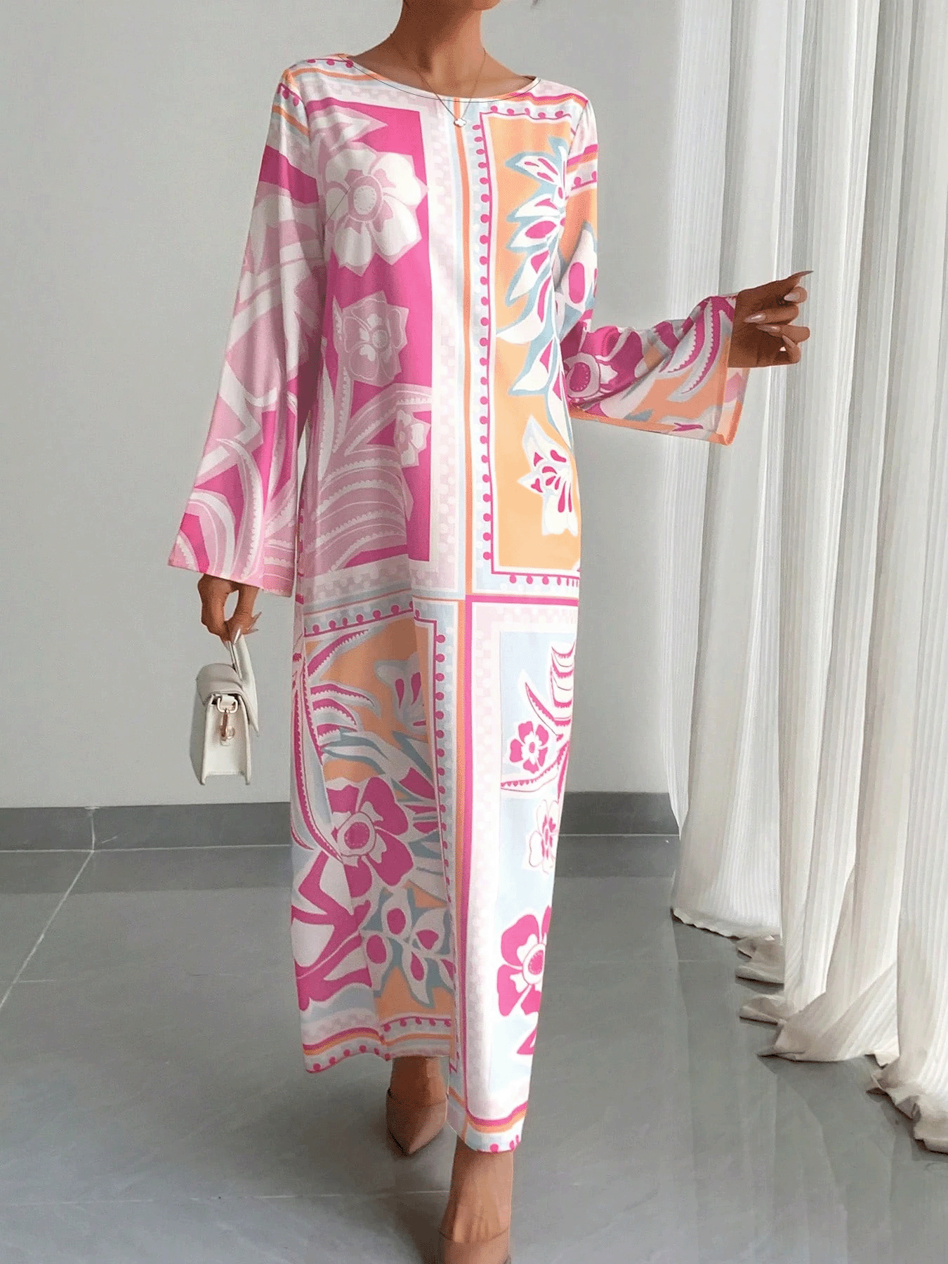 MY16873# 休闲日常通勤圆领长袖优雅印花长裙,圆领长袖中东阿拉伯风格长袍女裝貨源服裝批發