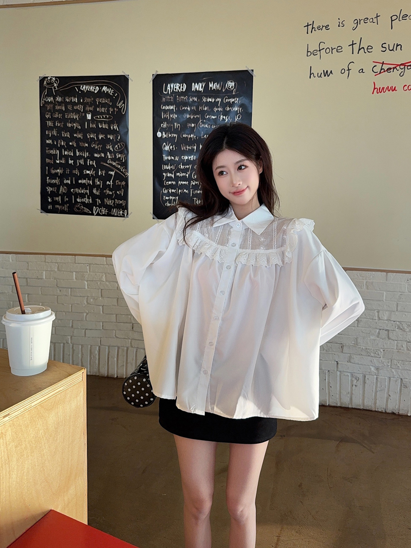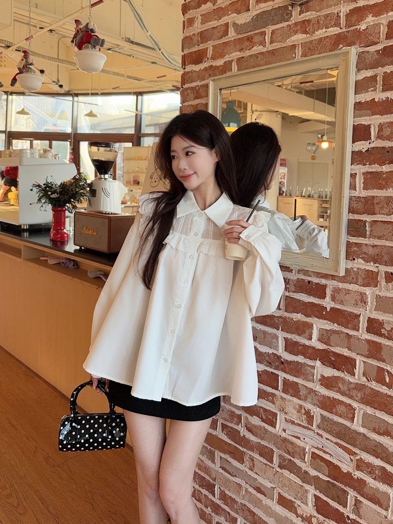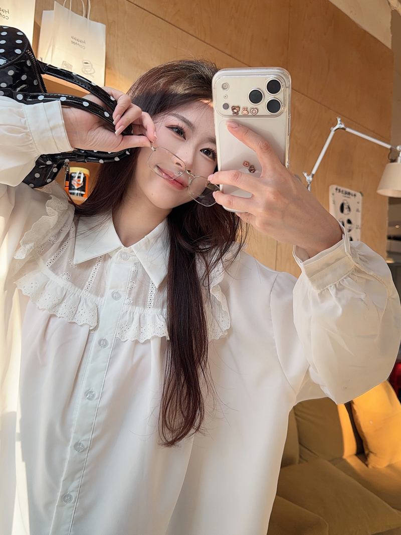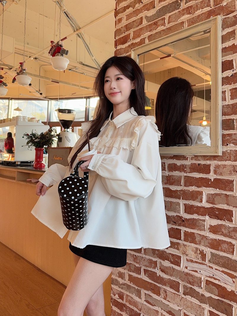 MY16890# 韩系小众设计蕾丝边拼接衬衫女长袖新款宽松显瘦休闲上衣女裝貨源服裝批發