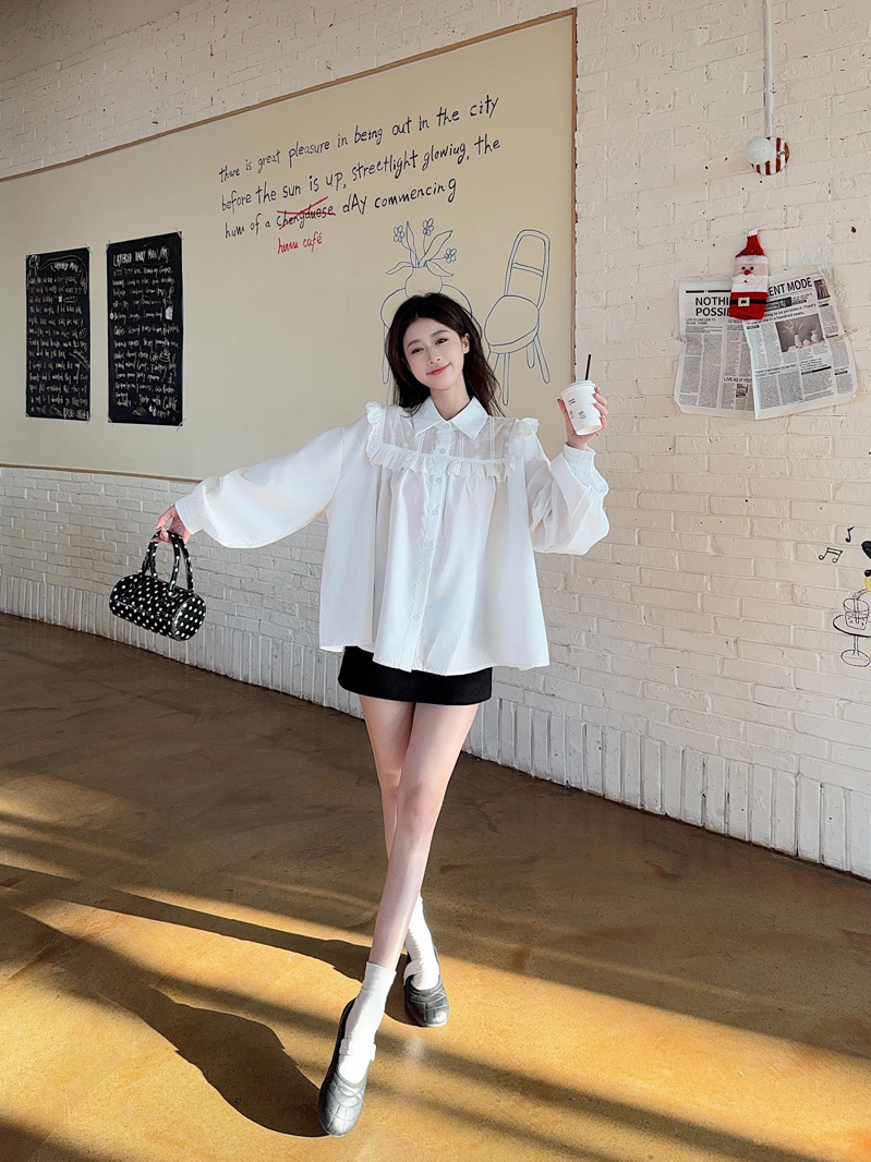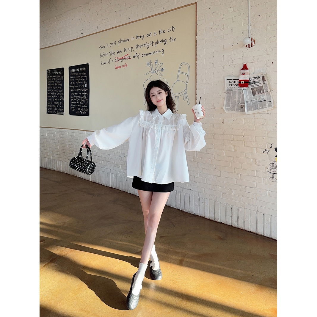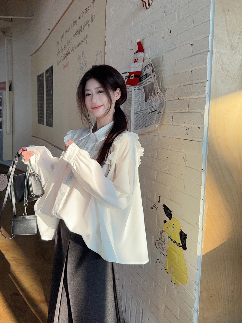 MY16890# 韩系小众设计蕾丝边拼接衬衫女长袖新款宽松显瘦休闲上衣女裝貨源服裝批發