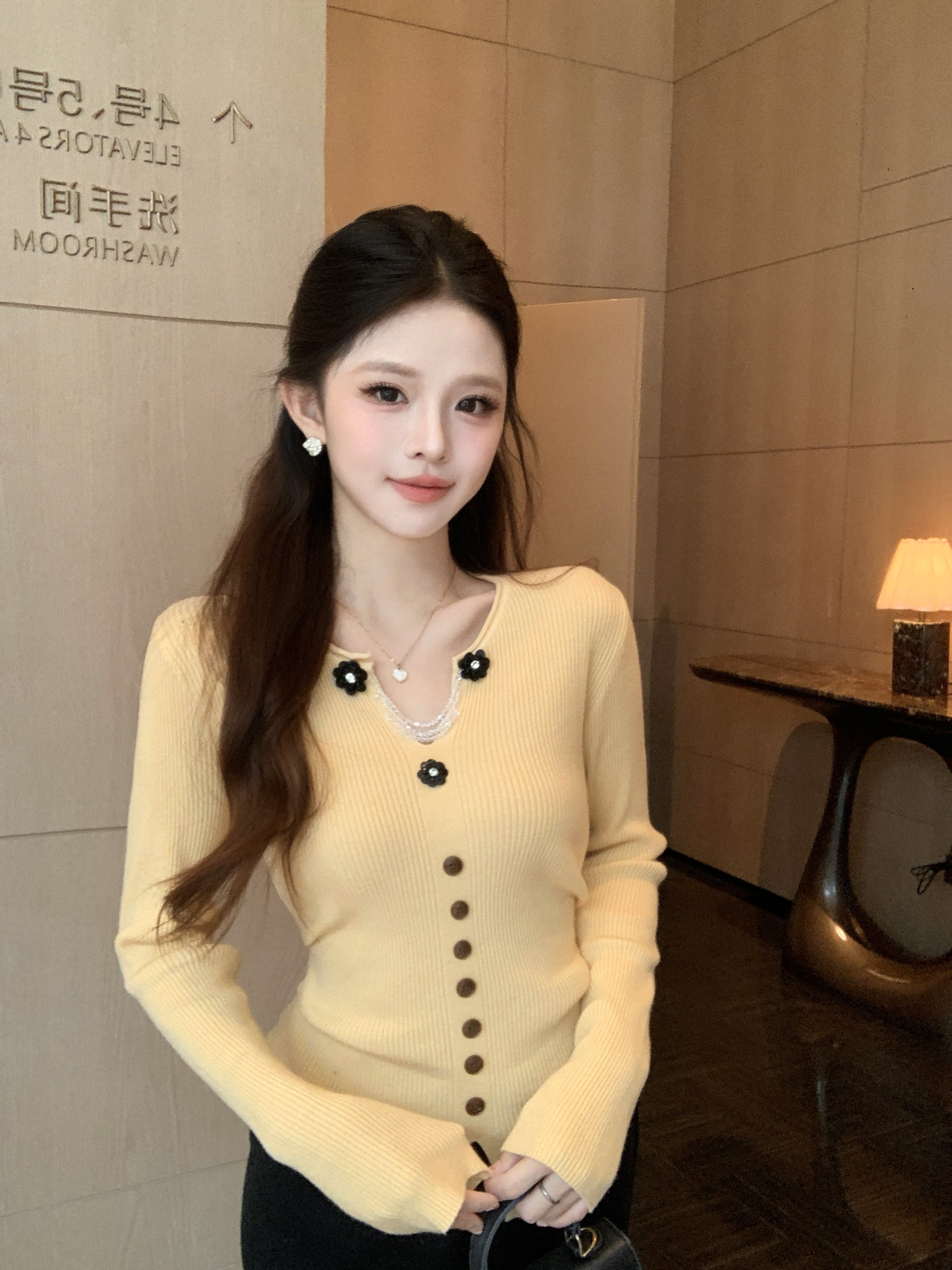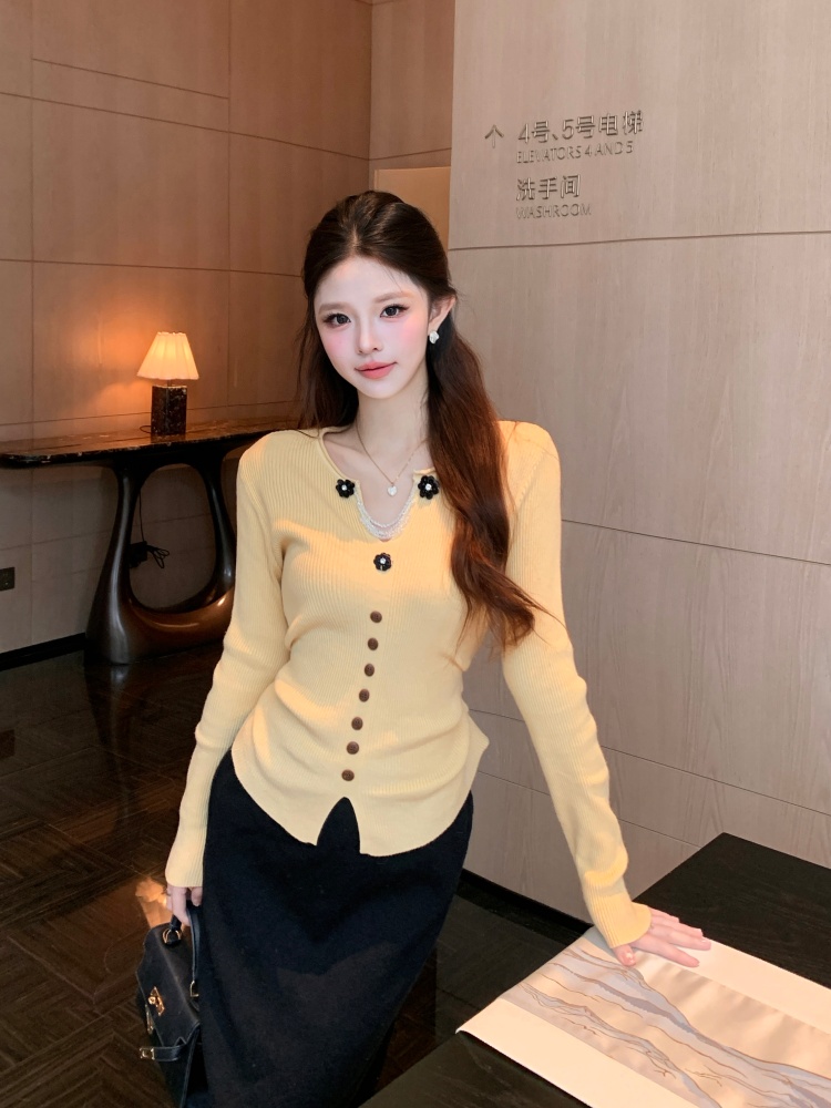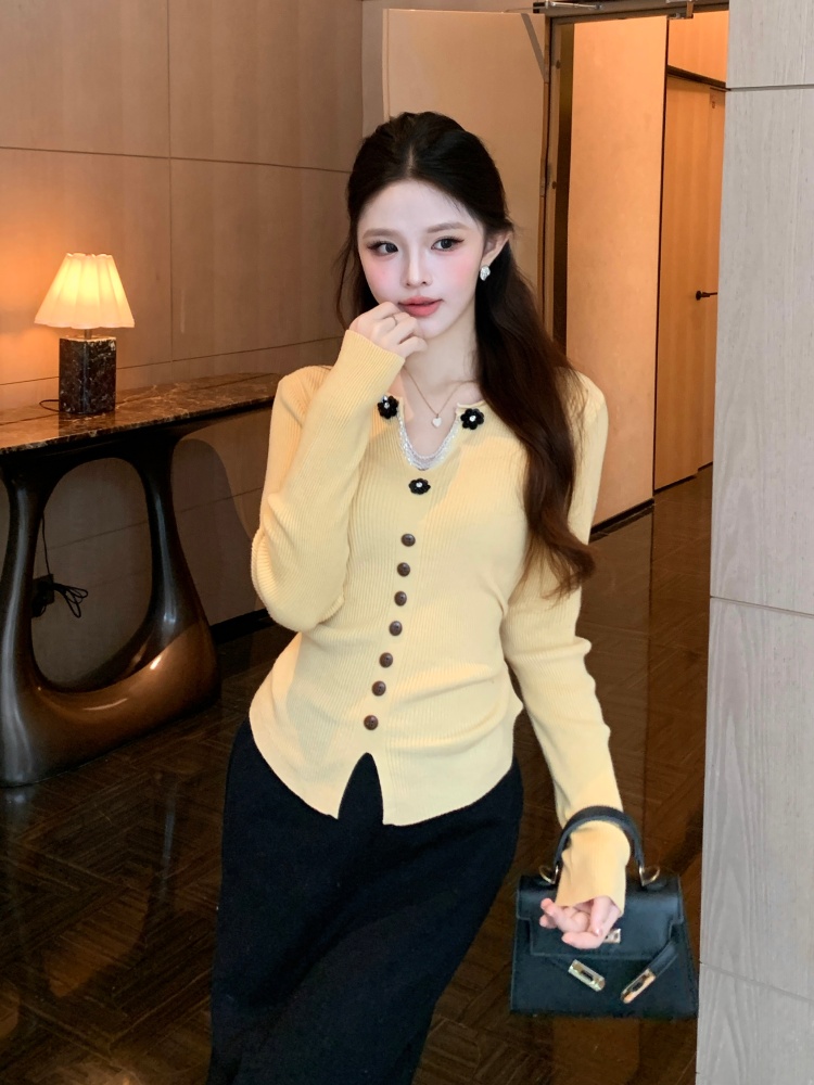 MY16894# 新款韩系黄色针织开衫女 华夫格V领收腰显瘦气质内搭上衣女裝貨源服裝批發