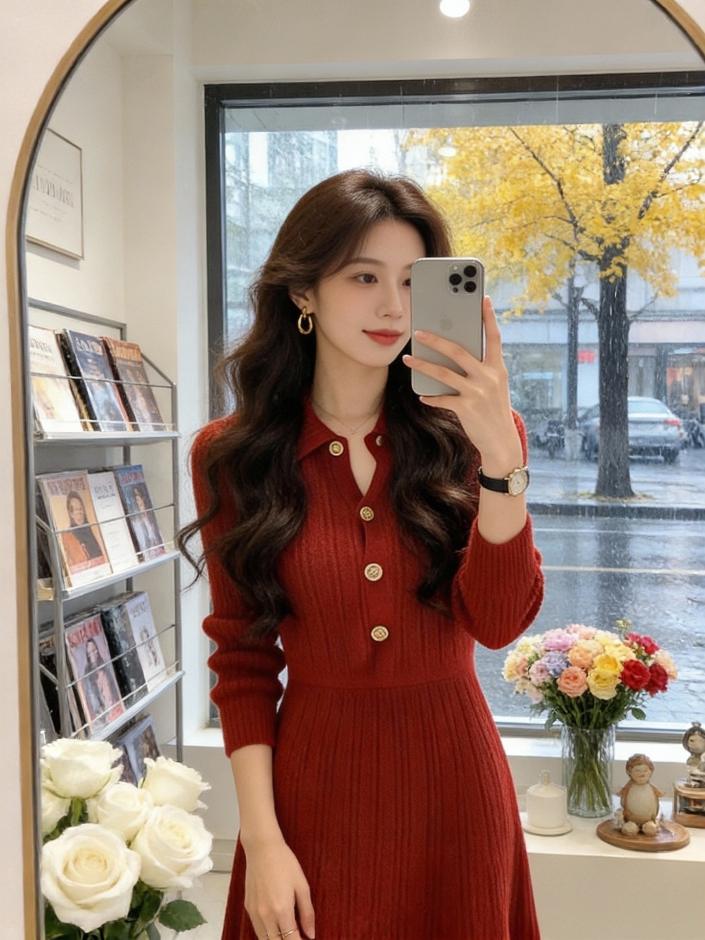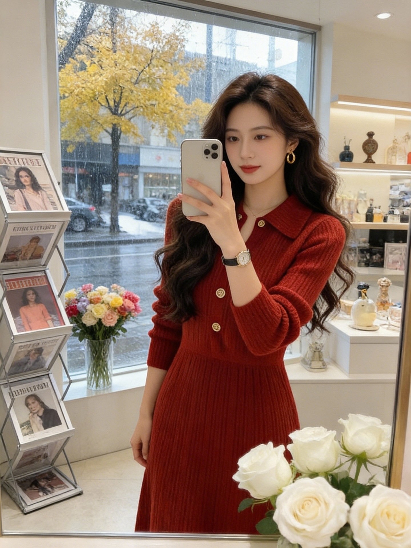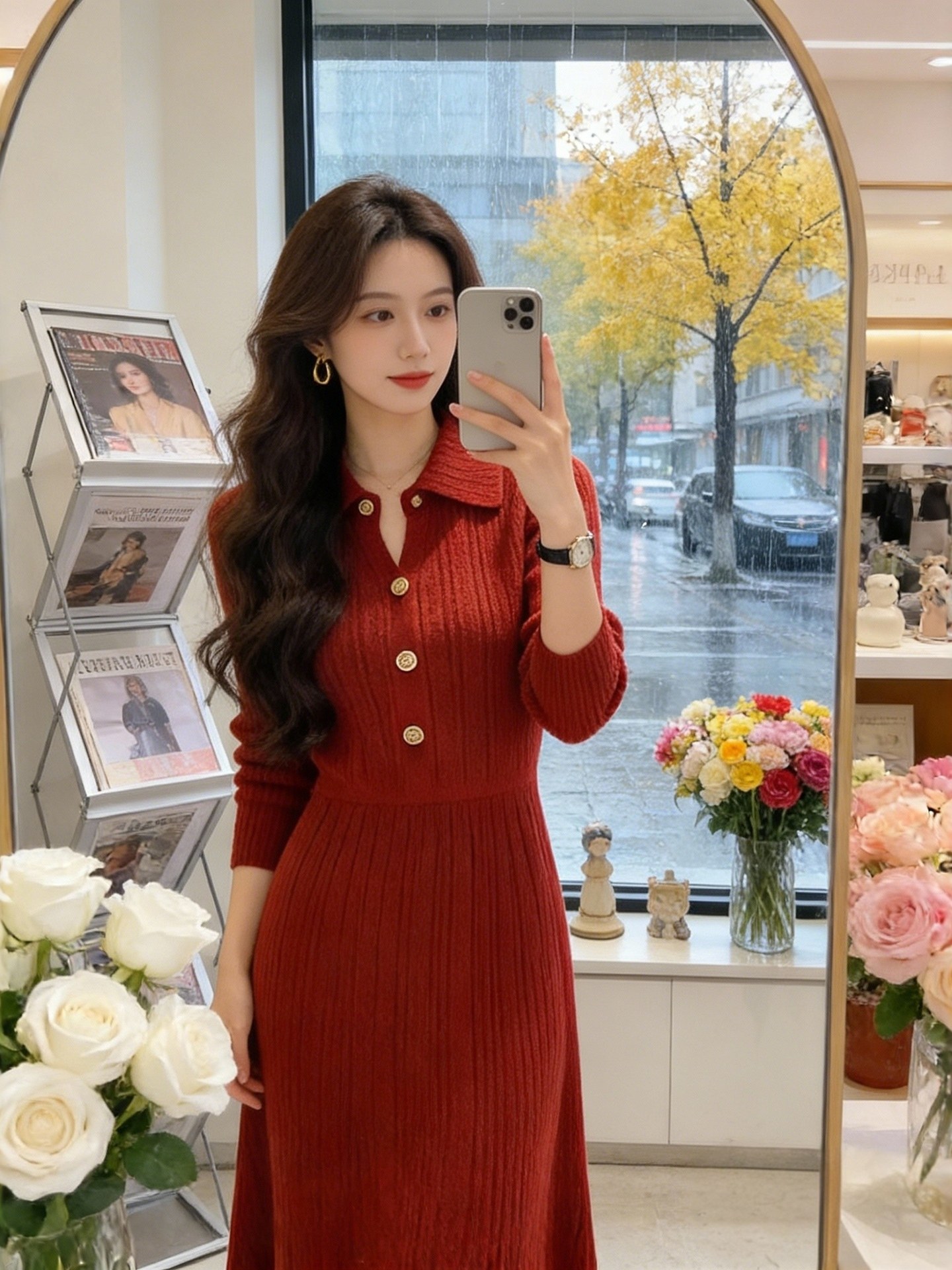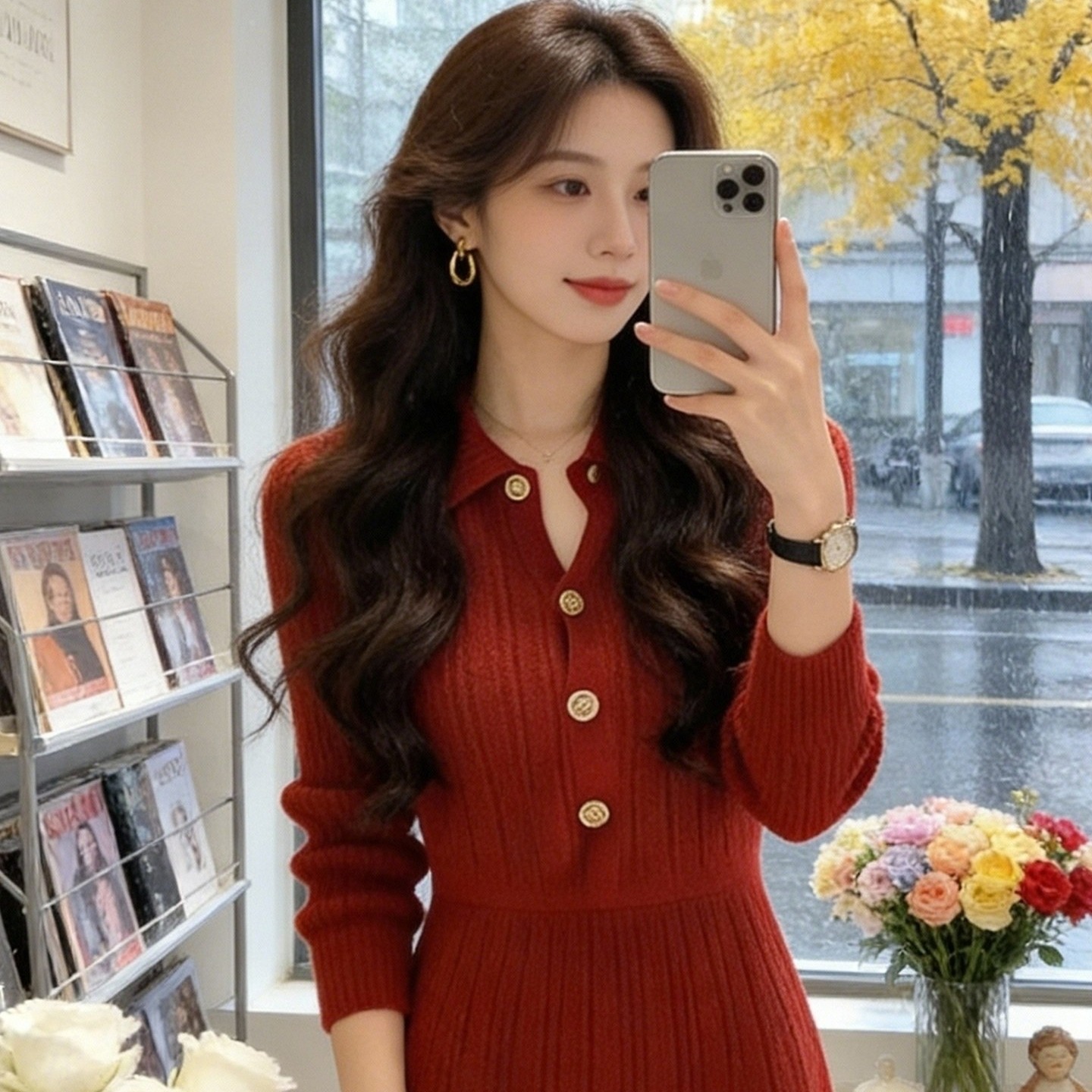 MY16900# 韩国红色针织连衣裙新款设计感显瘦赫本风气质长裙女裝貨源服裝批發