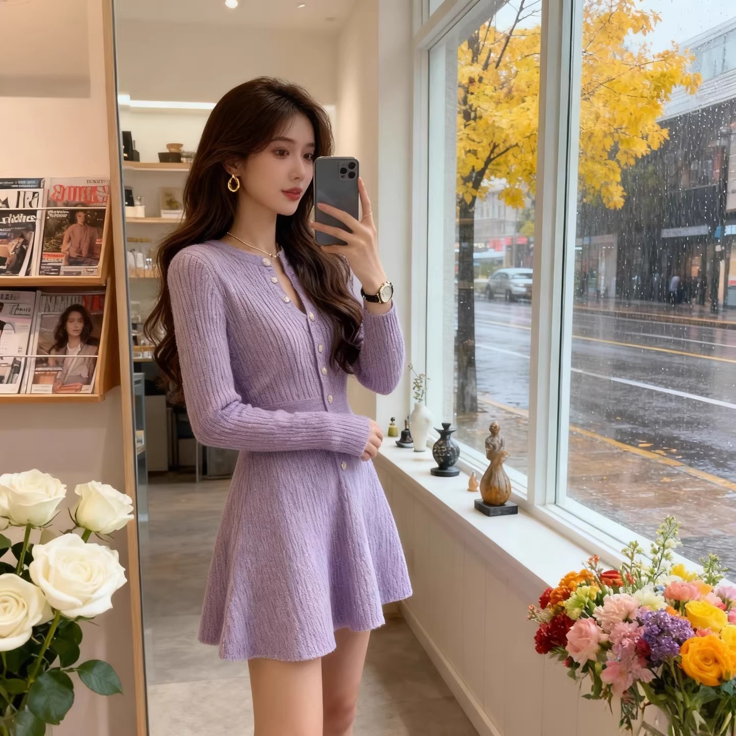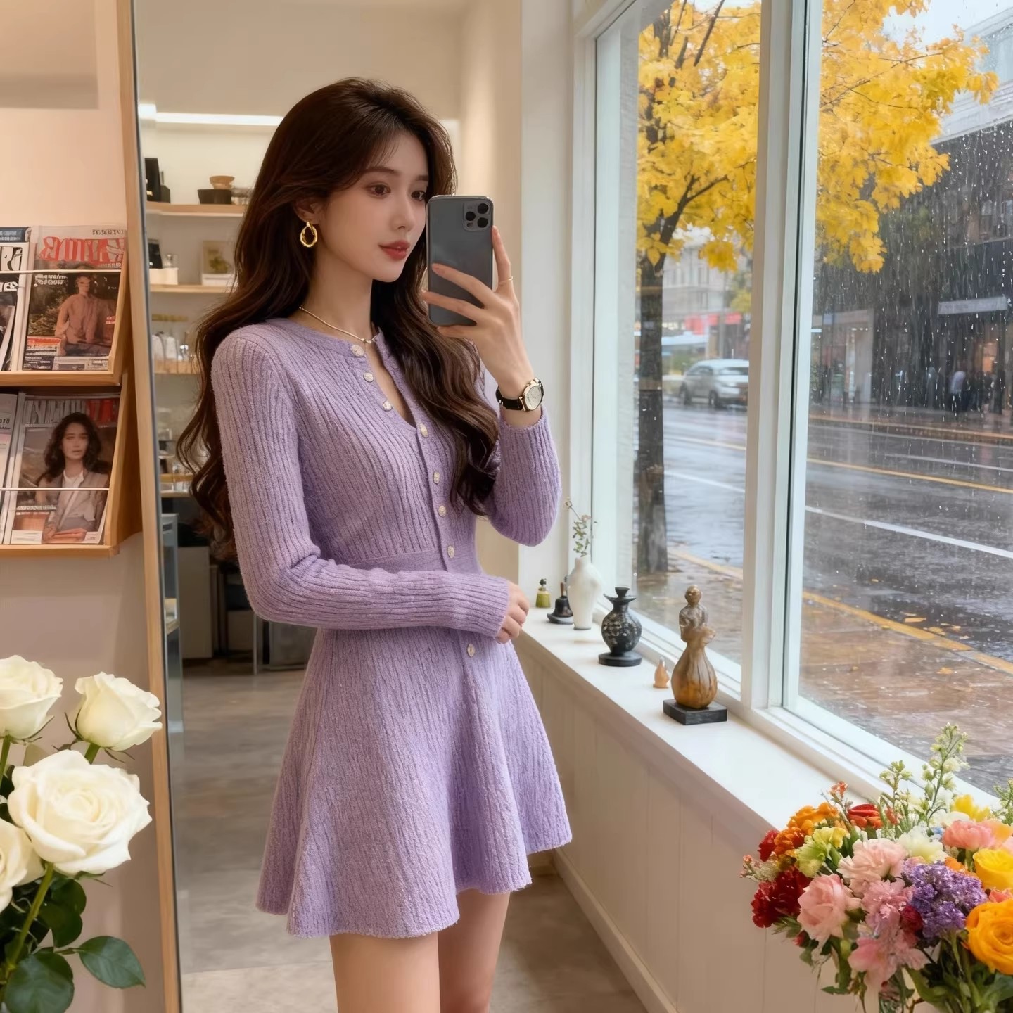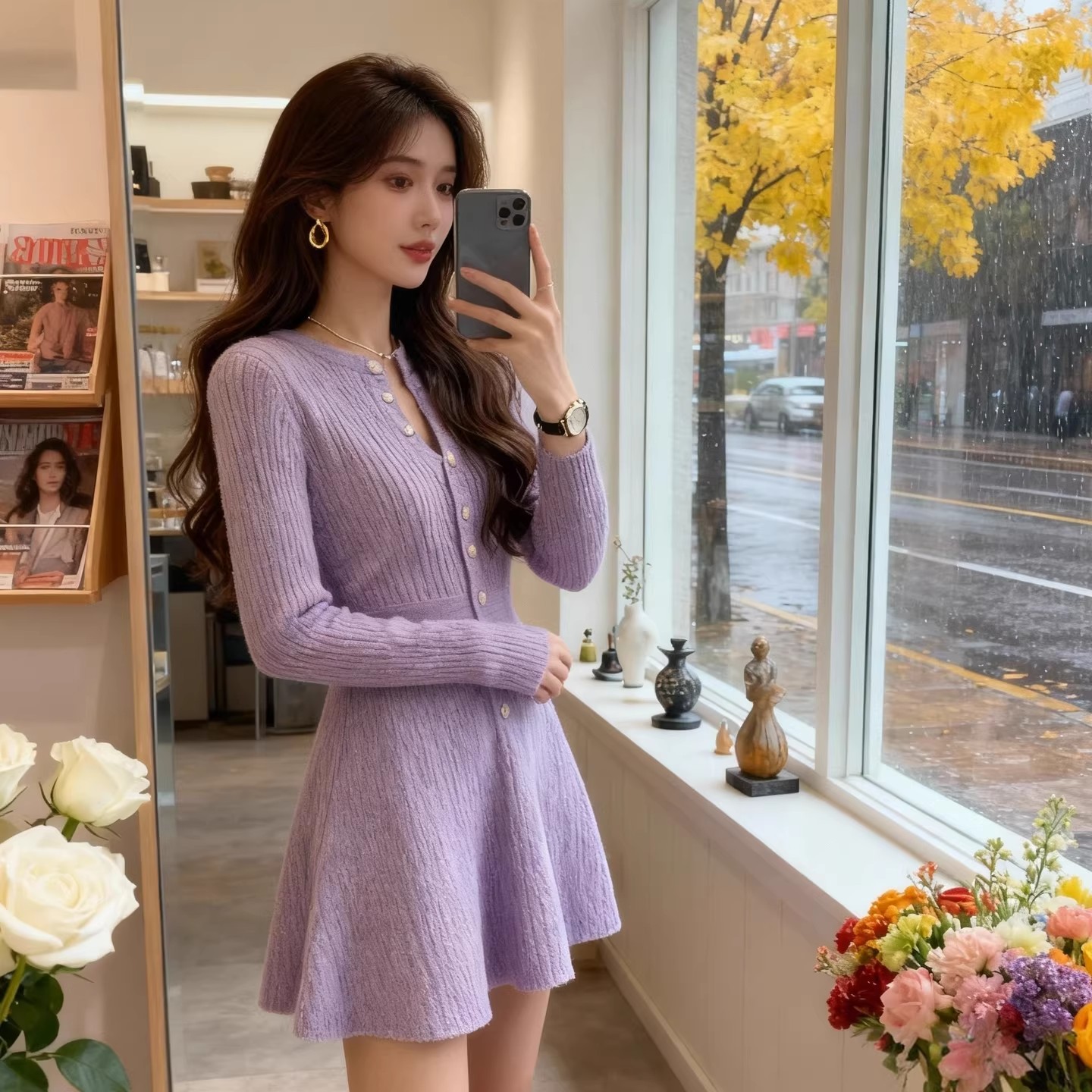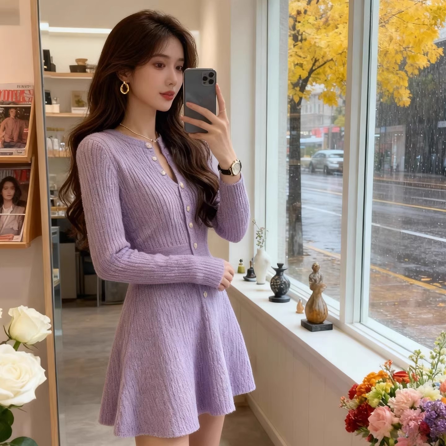MY16901# 温柔风紫色V领针织连衣裙女新款设计感收腰A字短裙小个子女裝貨源服裝批發