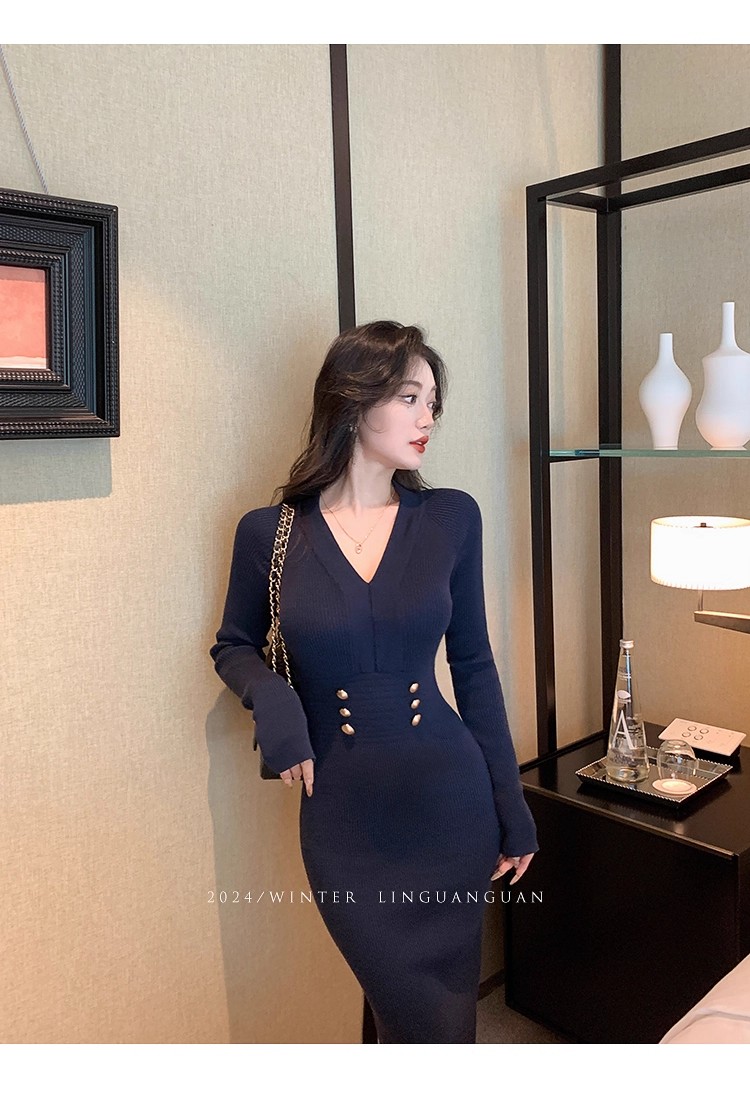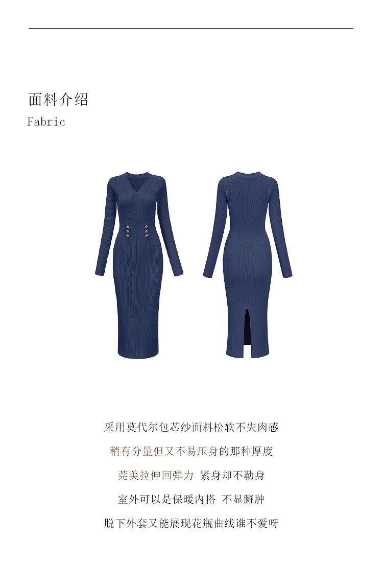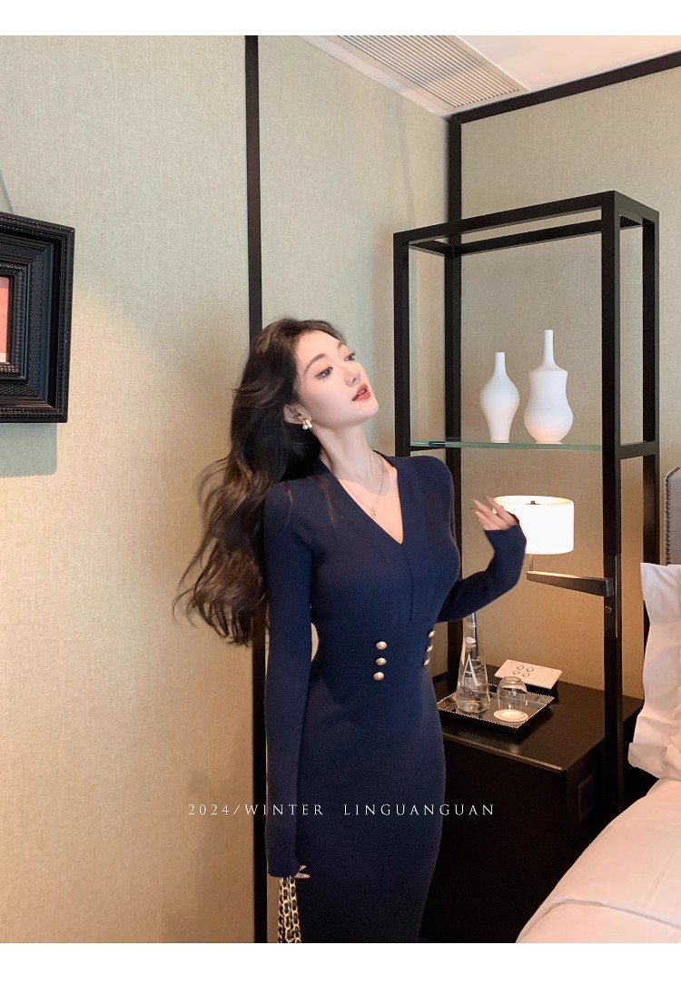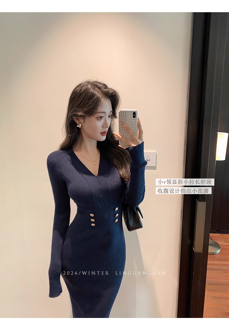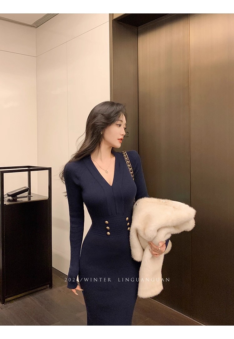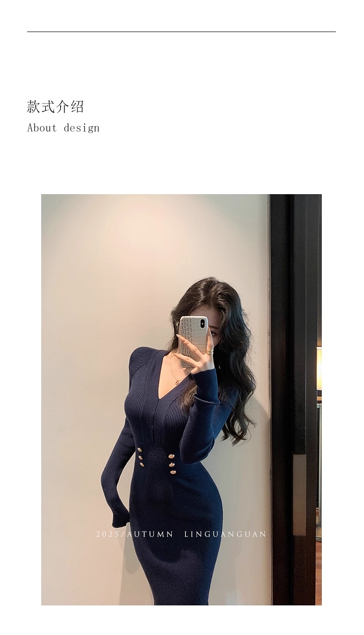MY16902# 藏蓝色v领针织连衣裙女春装法式高级感小香风包臀裙连身裙女裝貨源服裝批發