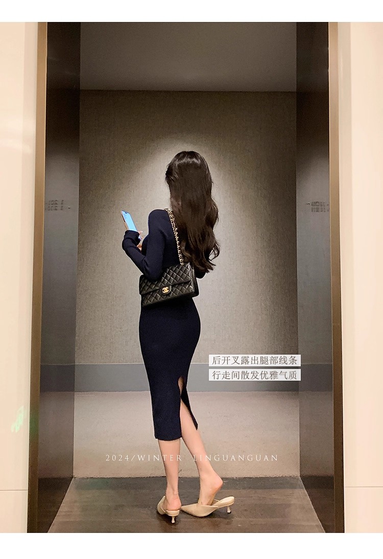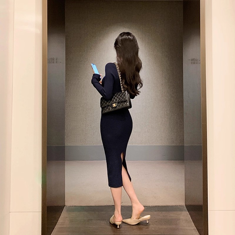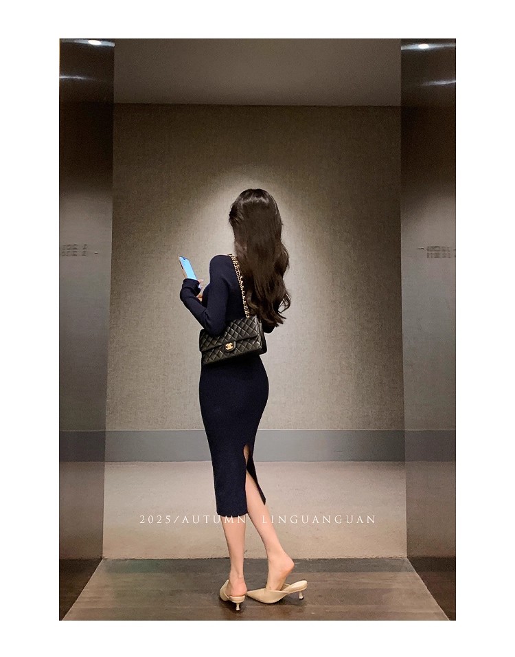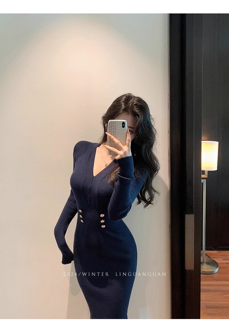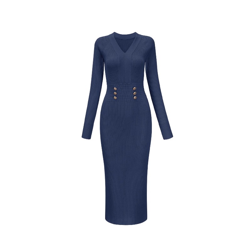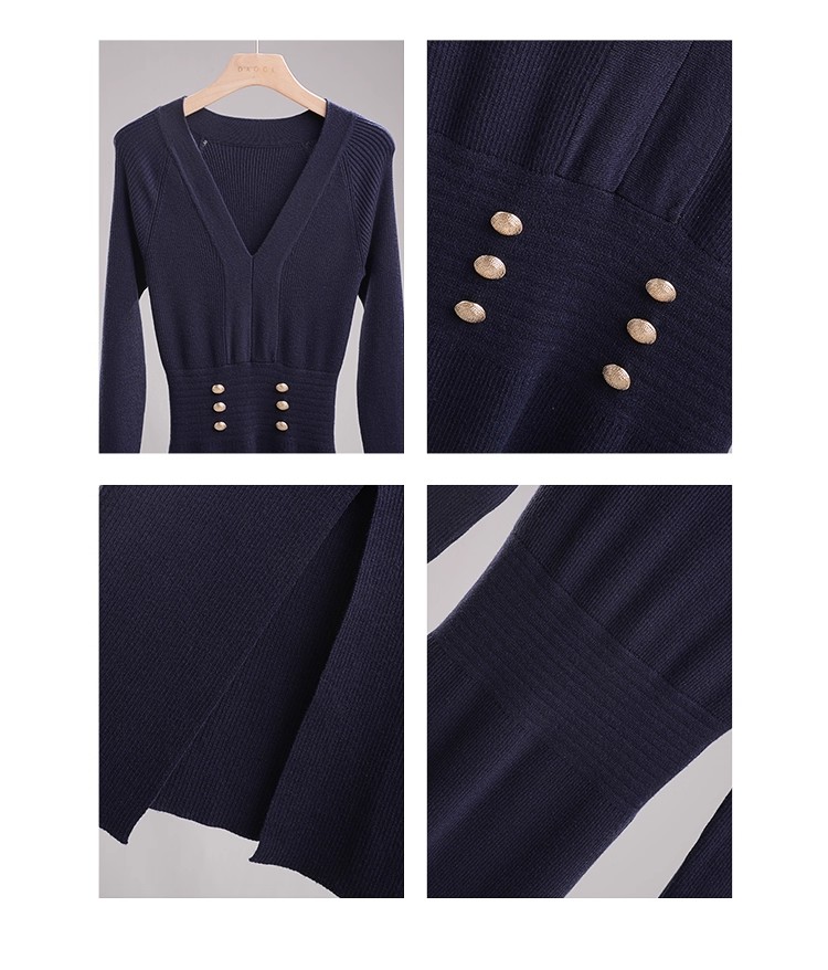 MY16902# 藏蓝色v领针织连衣裙女春装法式高级感小香风包臀裙连身裙女裝貨源服裝批發