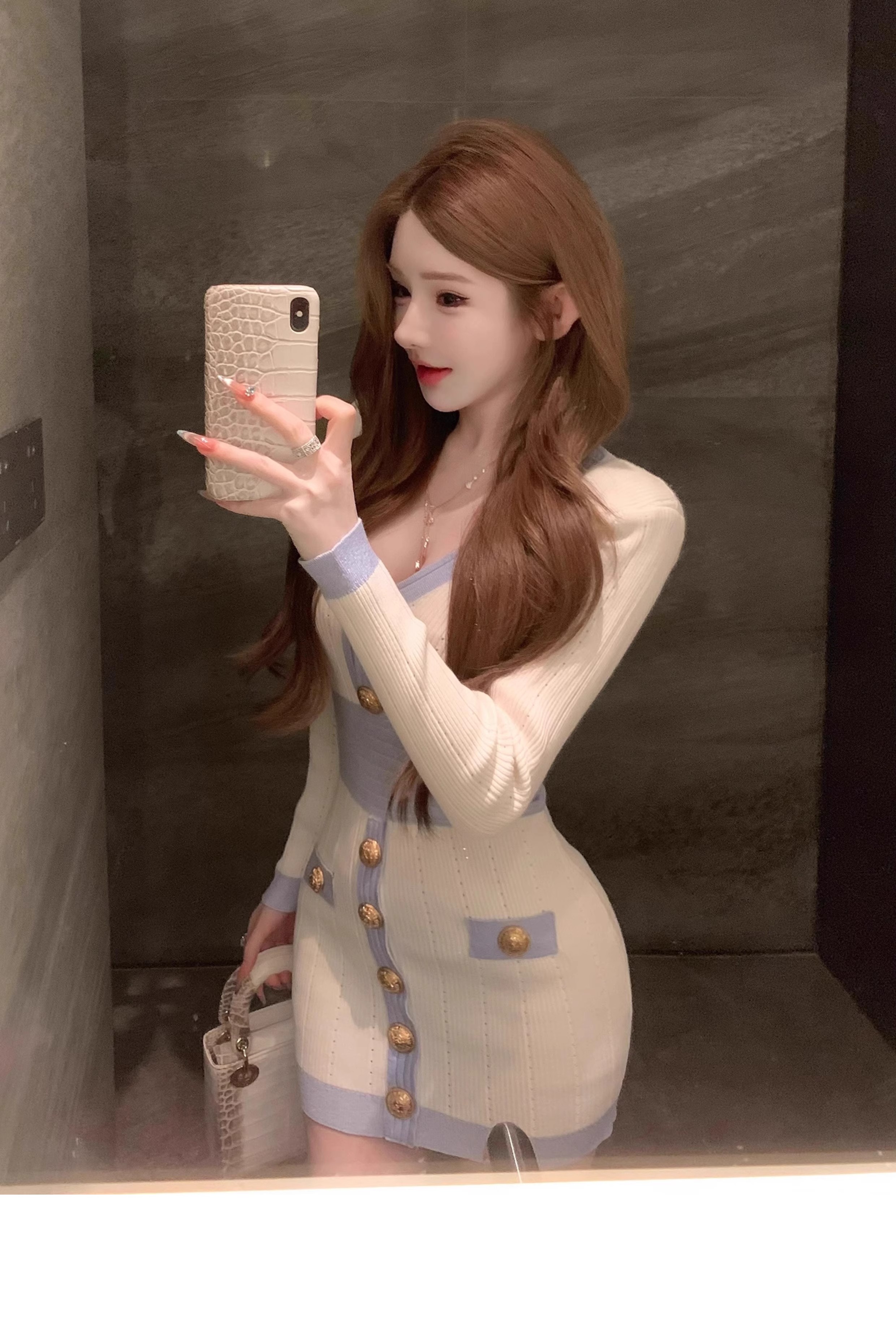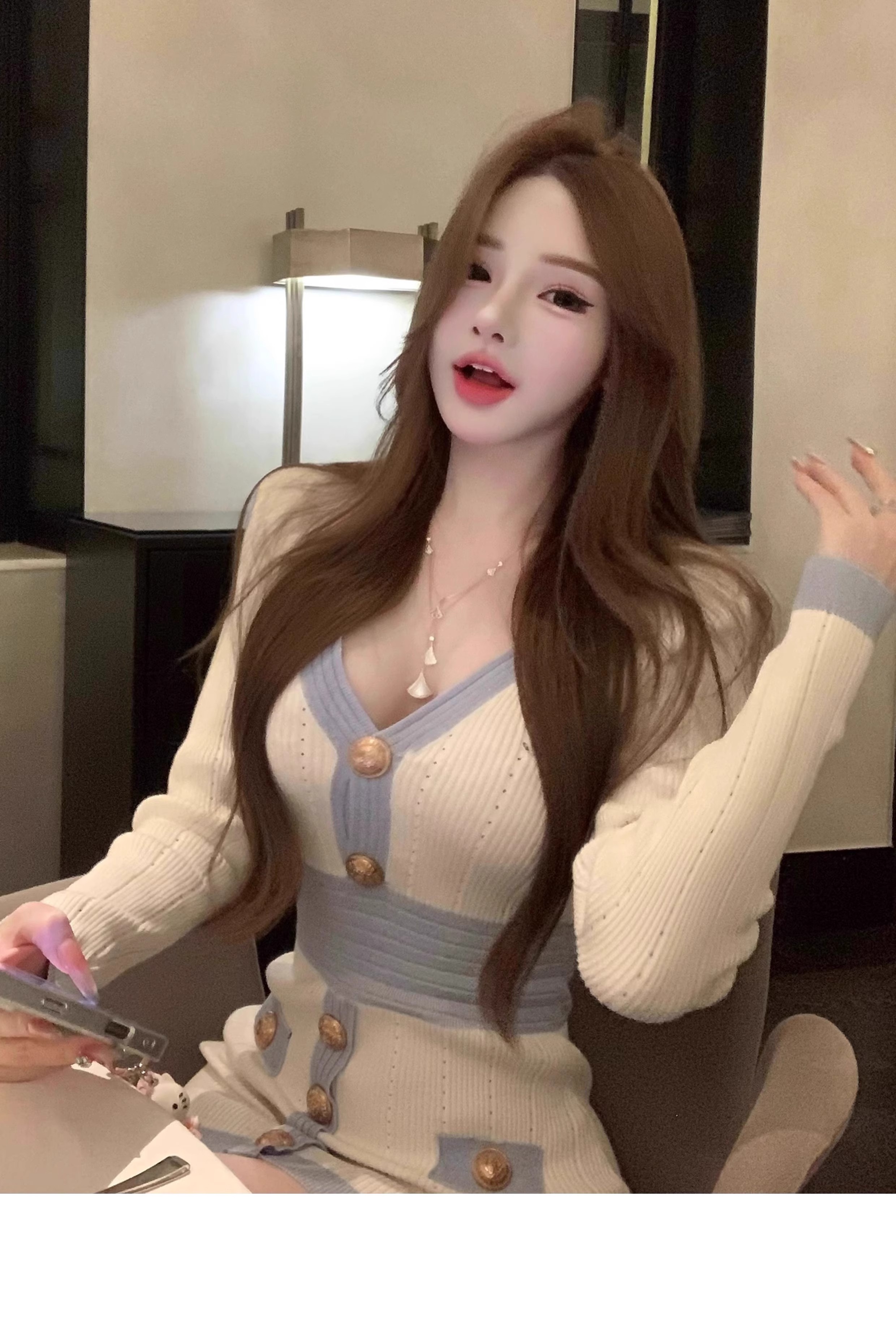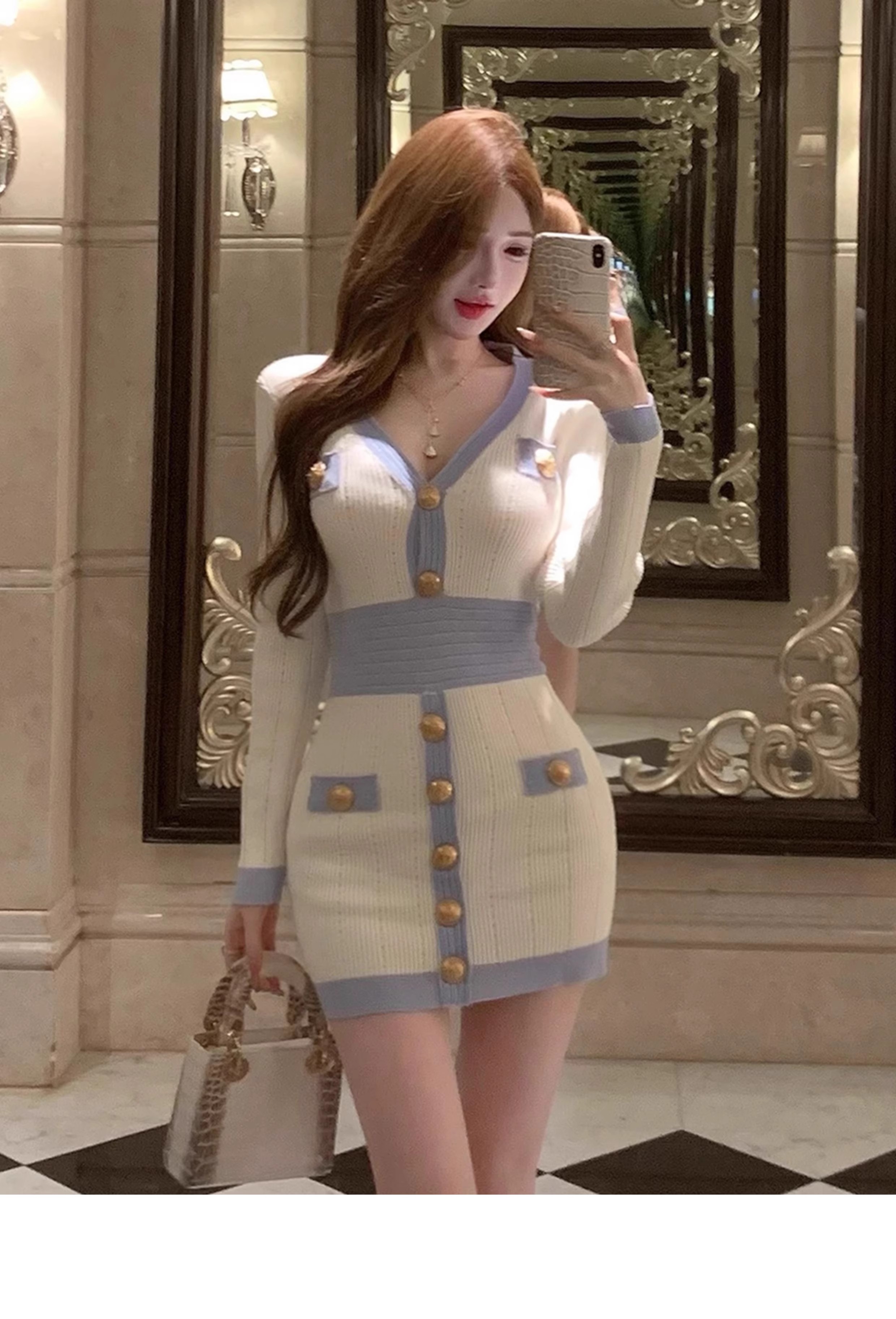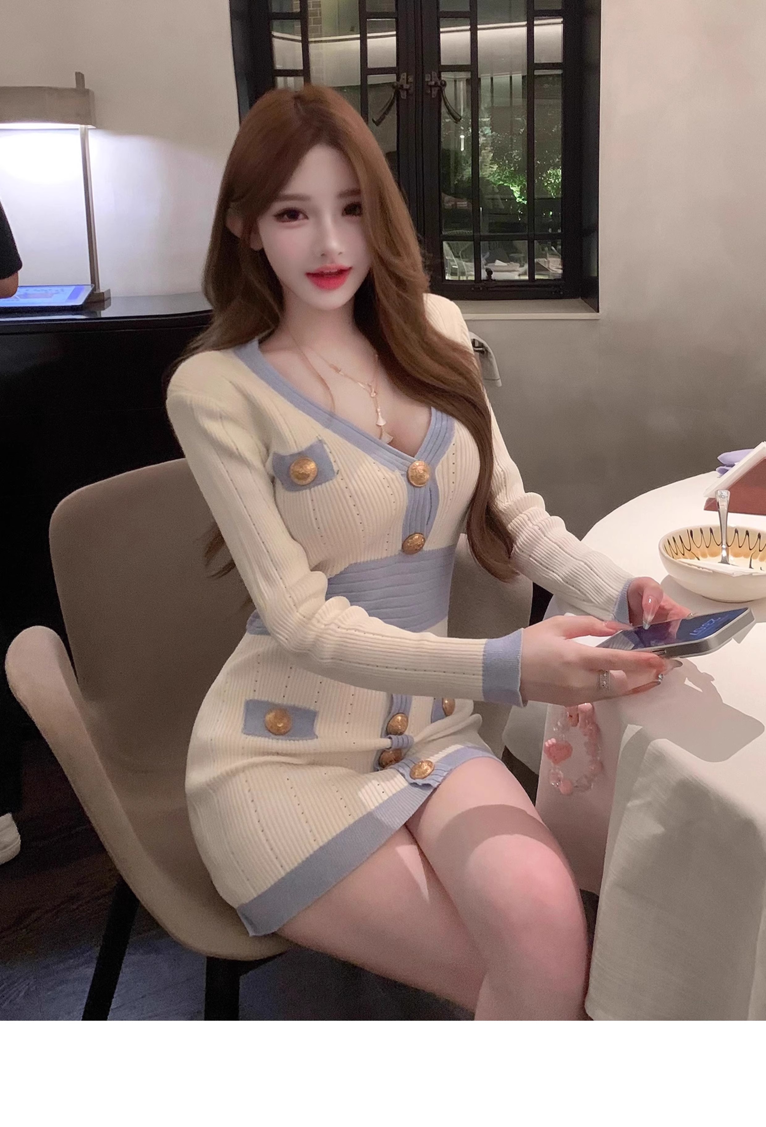MY16903# 蓝色V领针织长袖连衣裙女新款法式娇欲千金气质显瘦包臀裙女裝貨源服裝批發