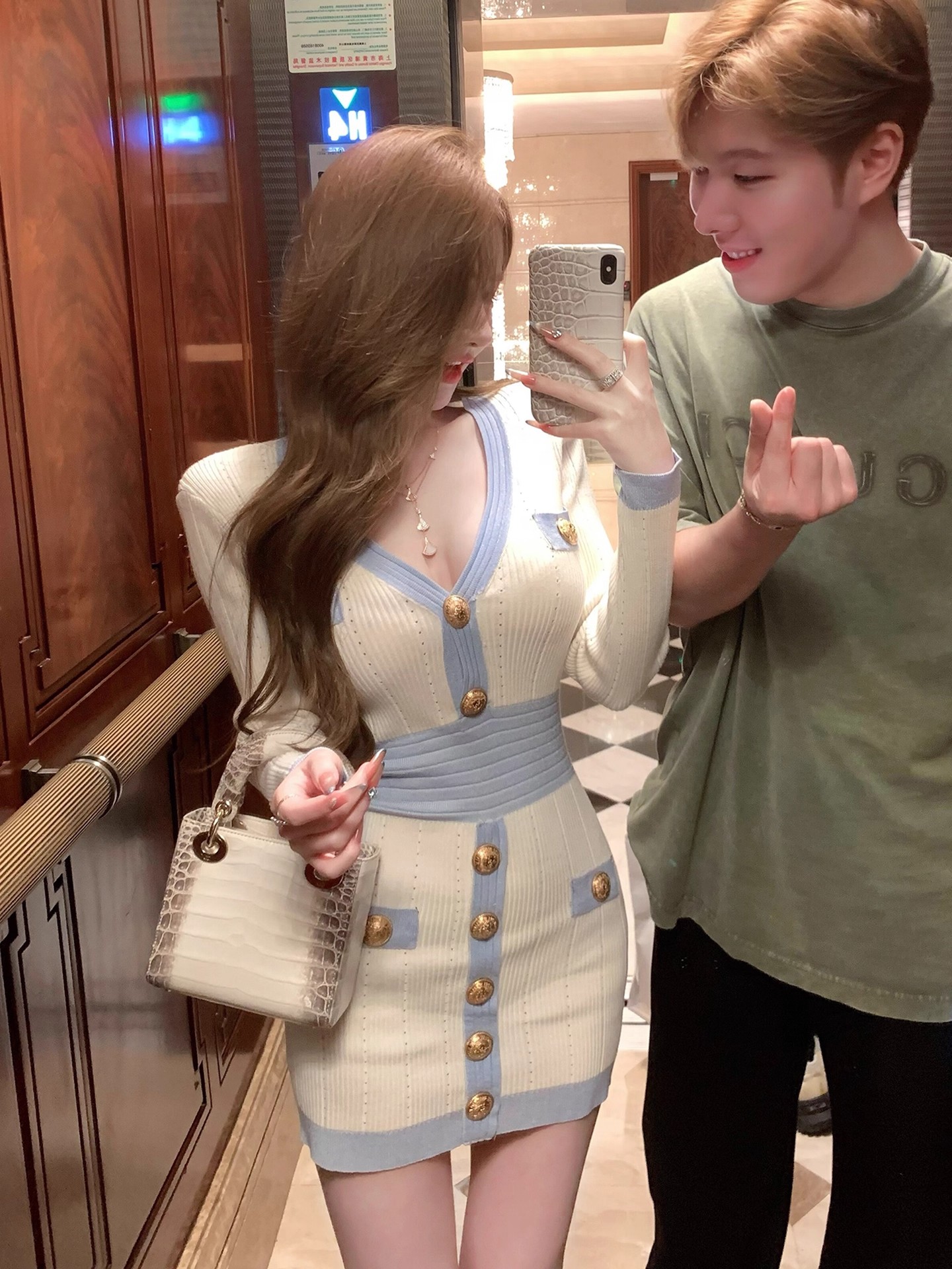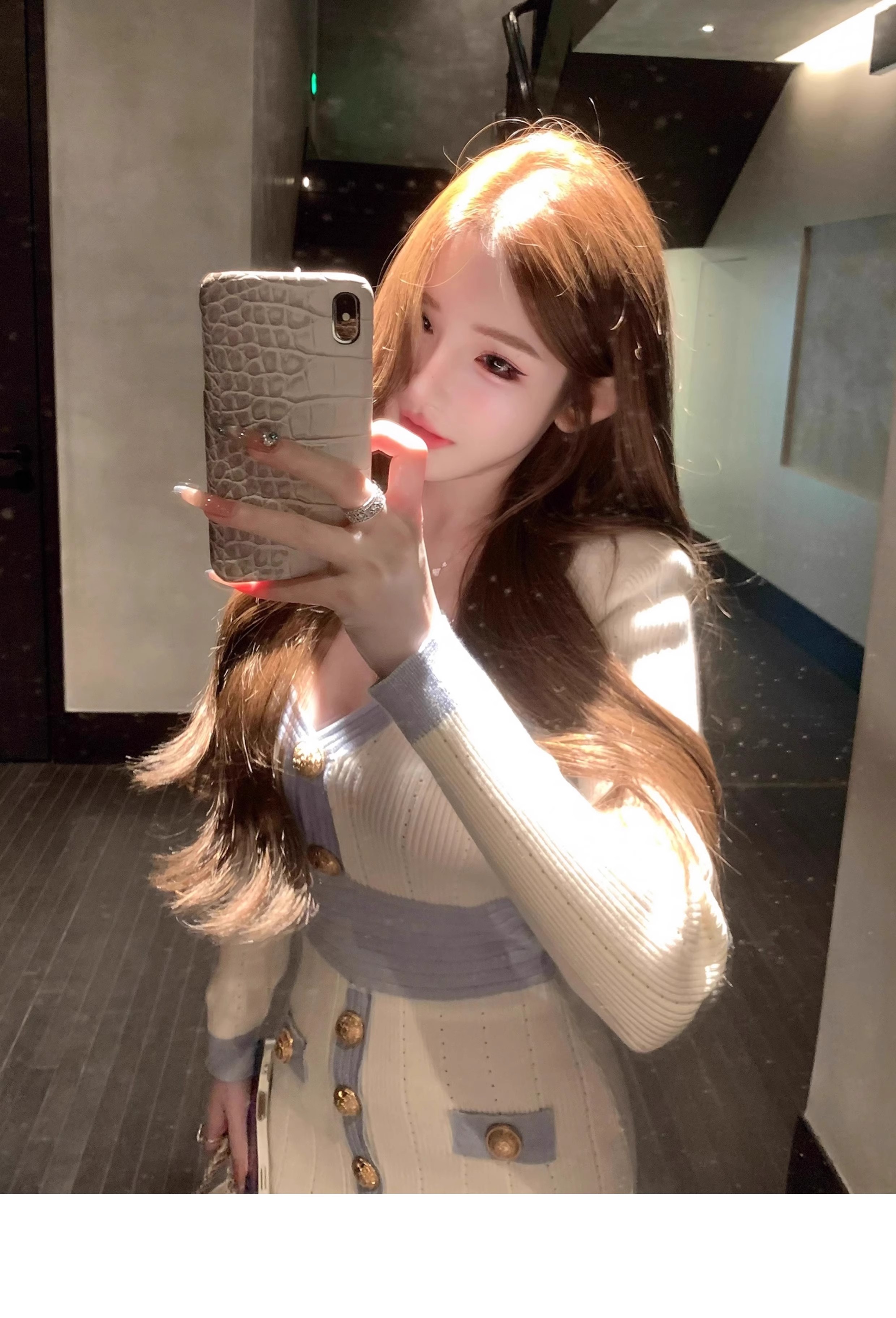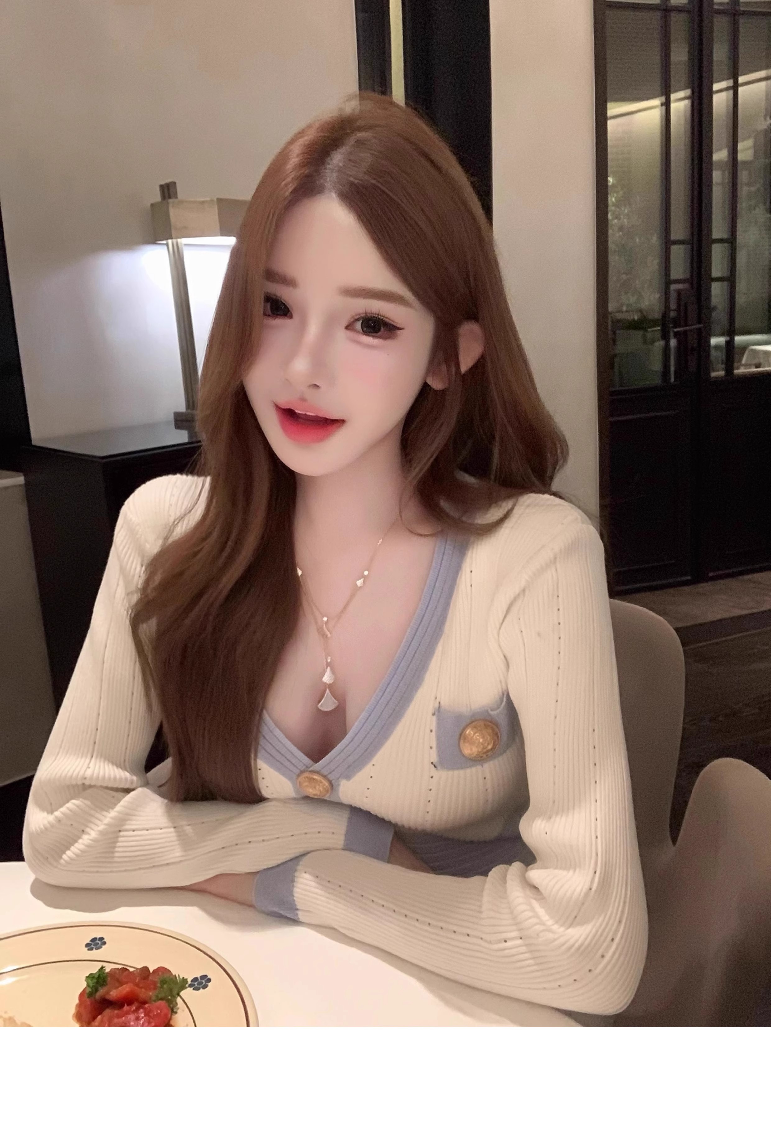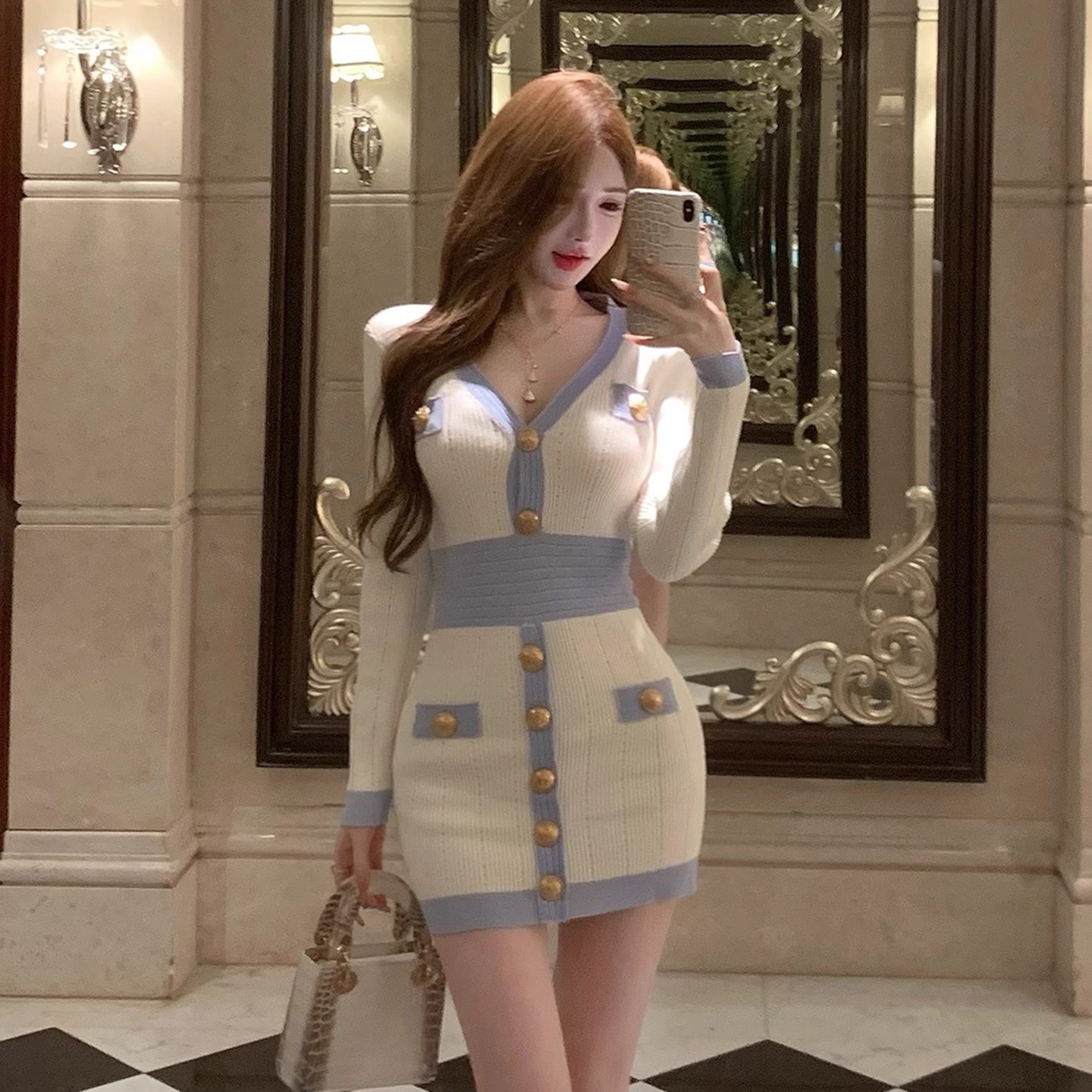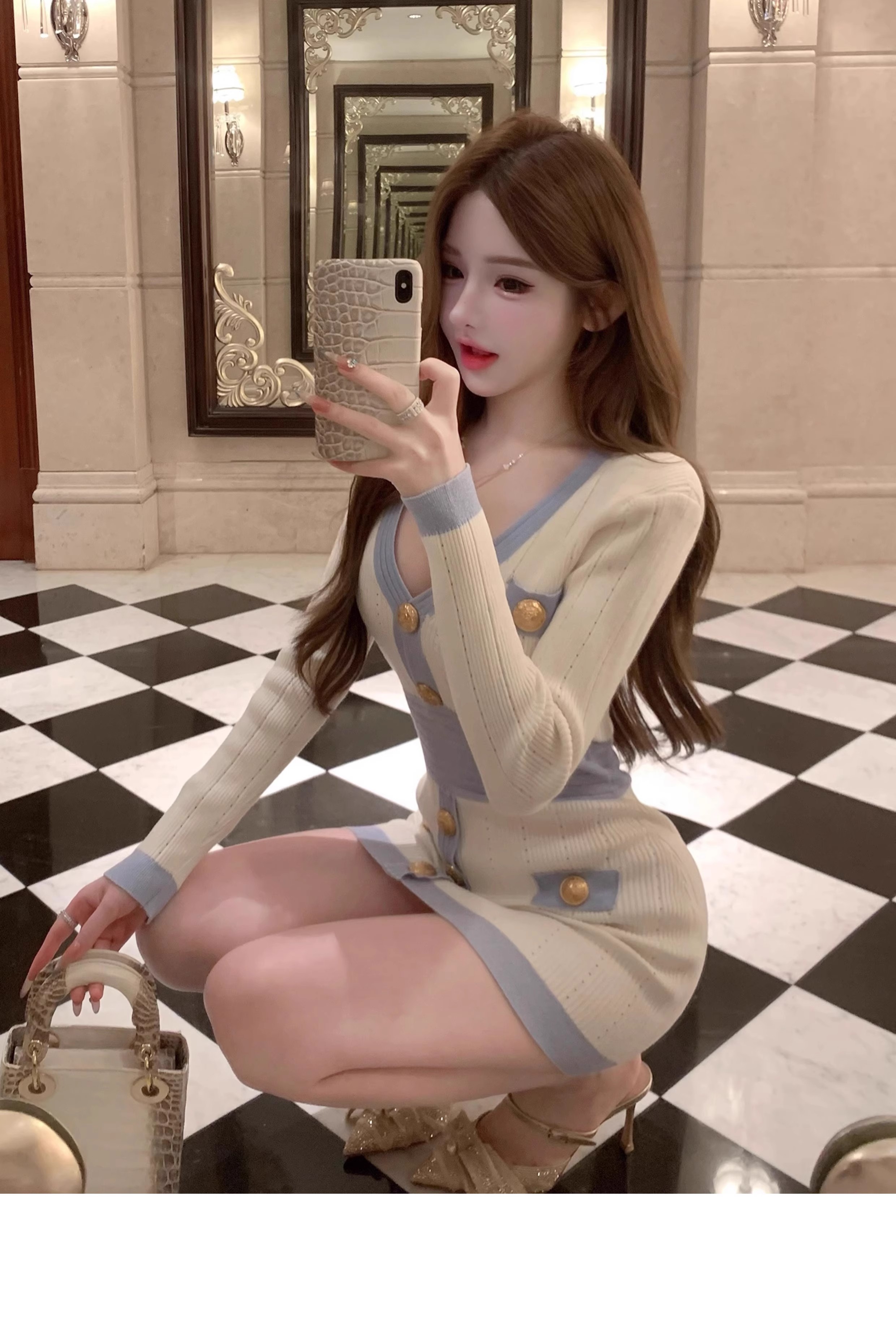 MY16903# 蓝色V领针织长袖连衣裙女新款法式娇欲千金气质显瘦包臀裙女裝貨源服裝批發