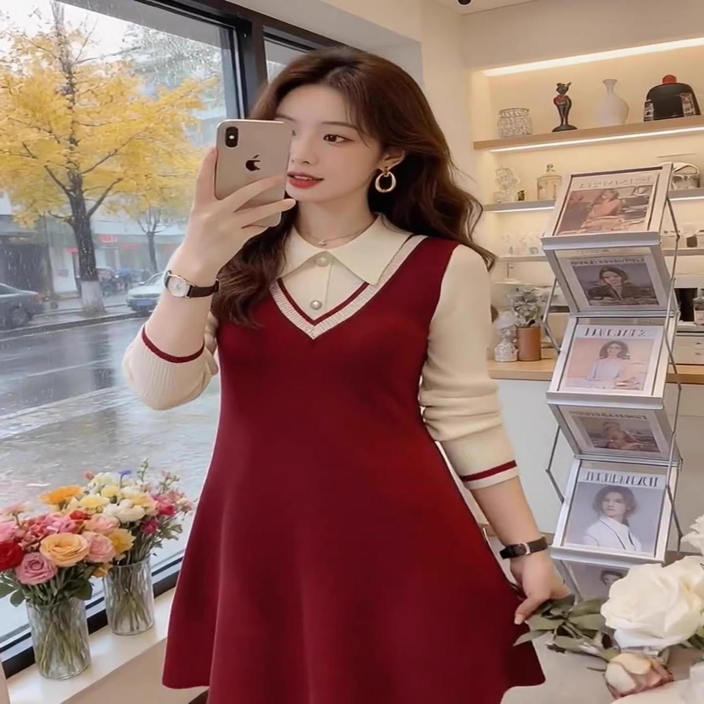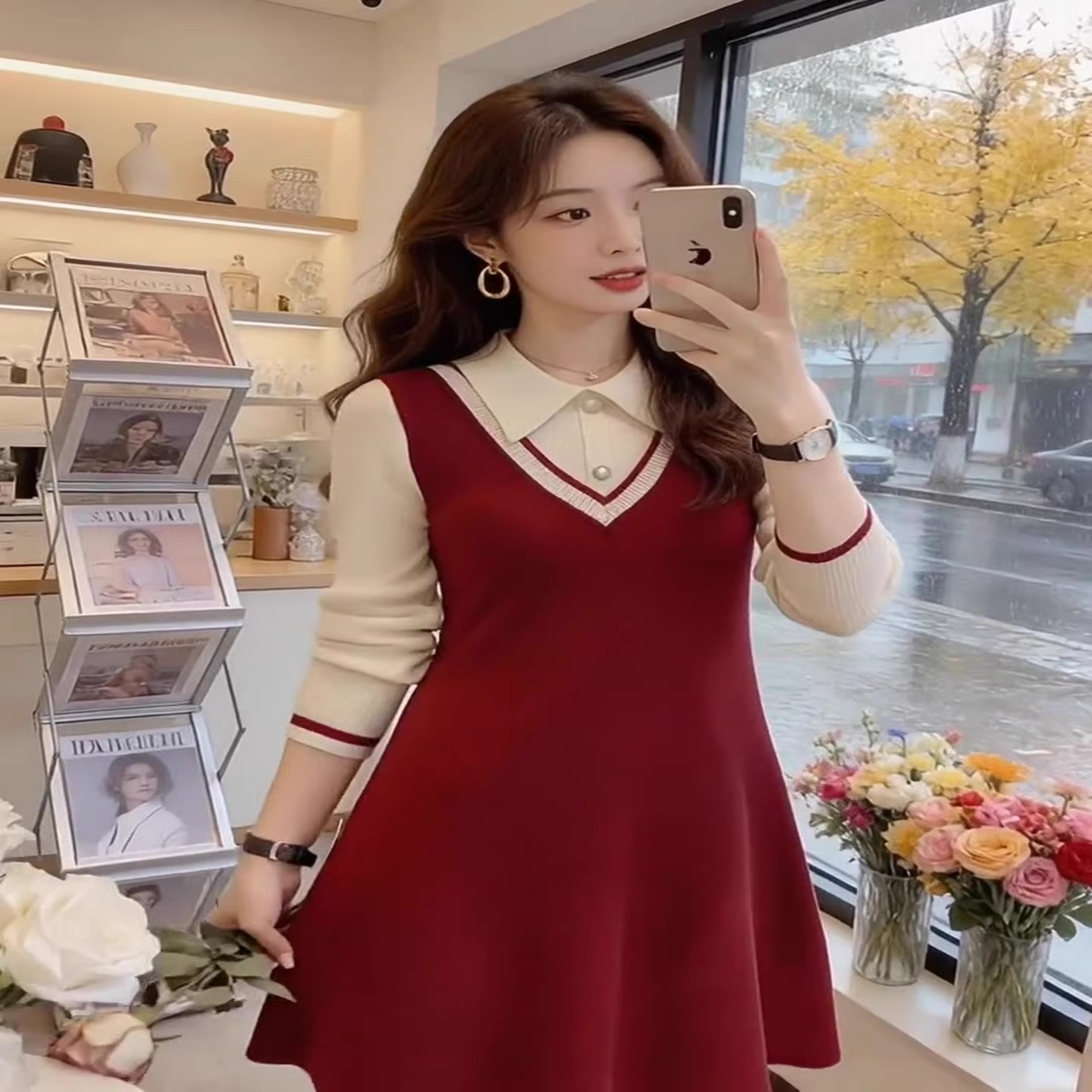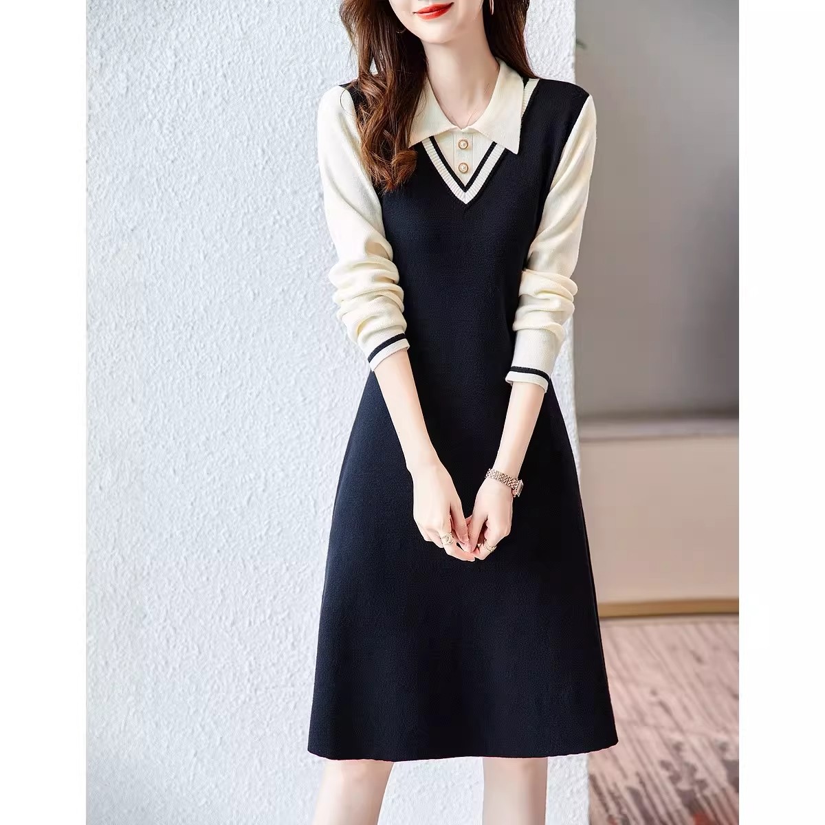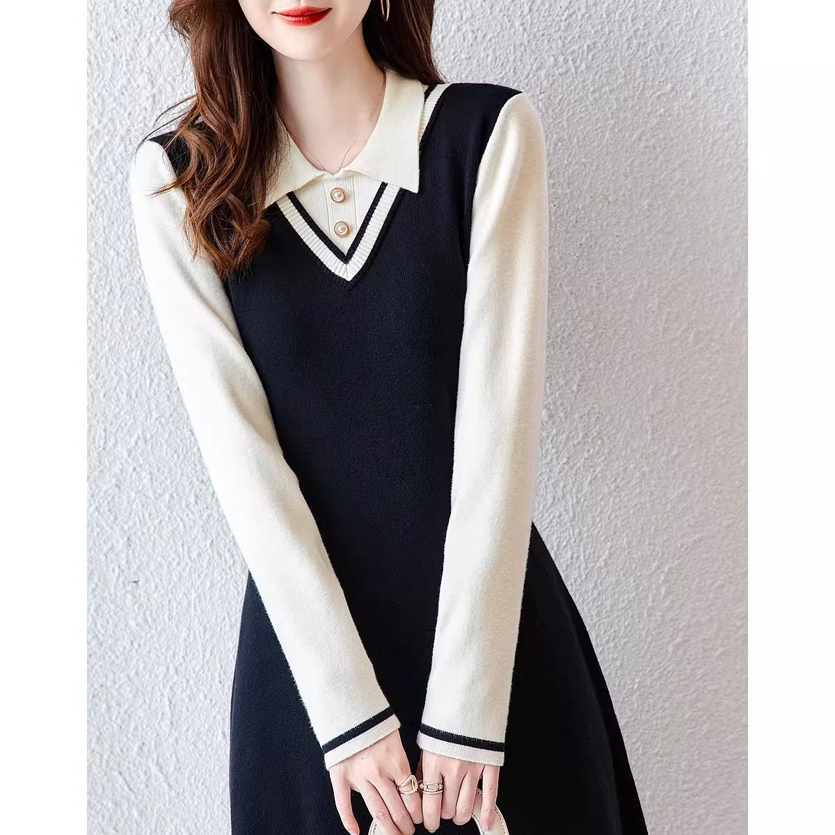 MY16904# 新款娃娃领撞色拼接针织连衣裙气质显瘦打底毛衣裙女裝貨源服裝批發
