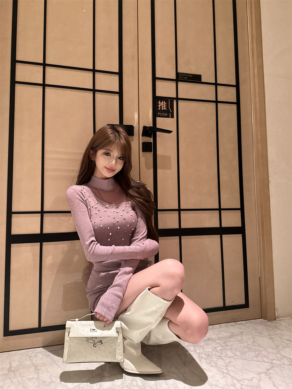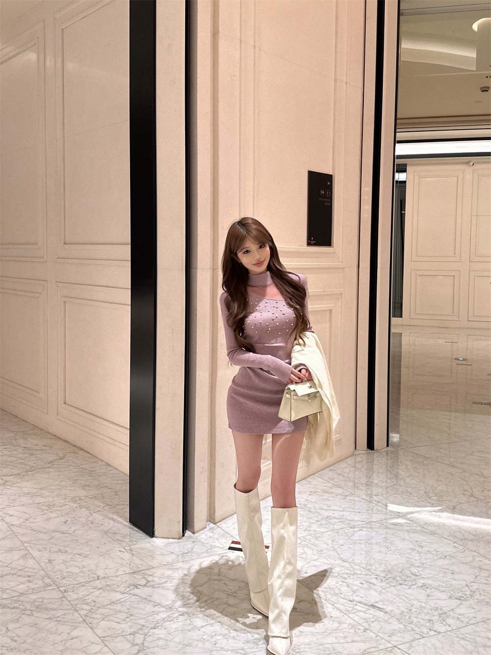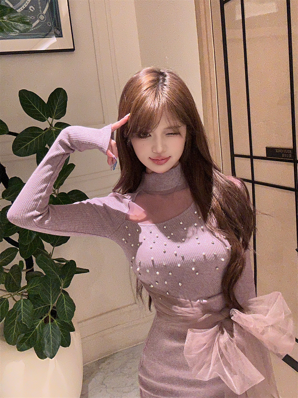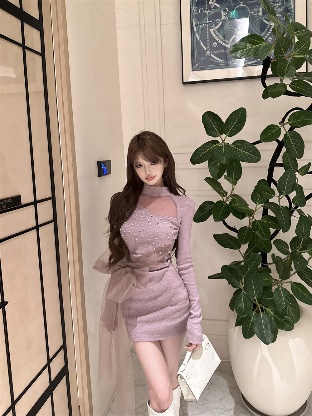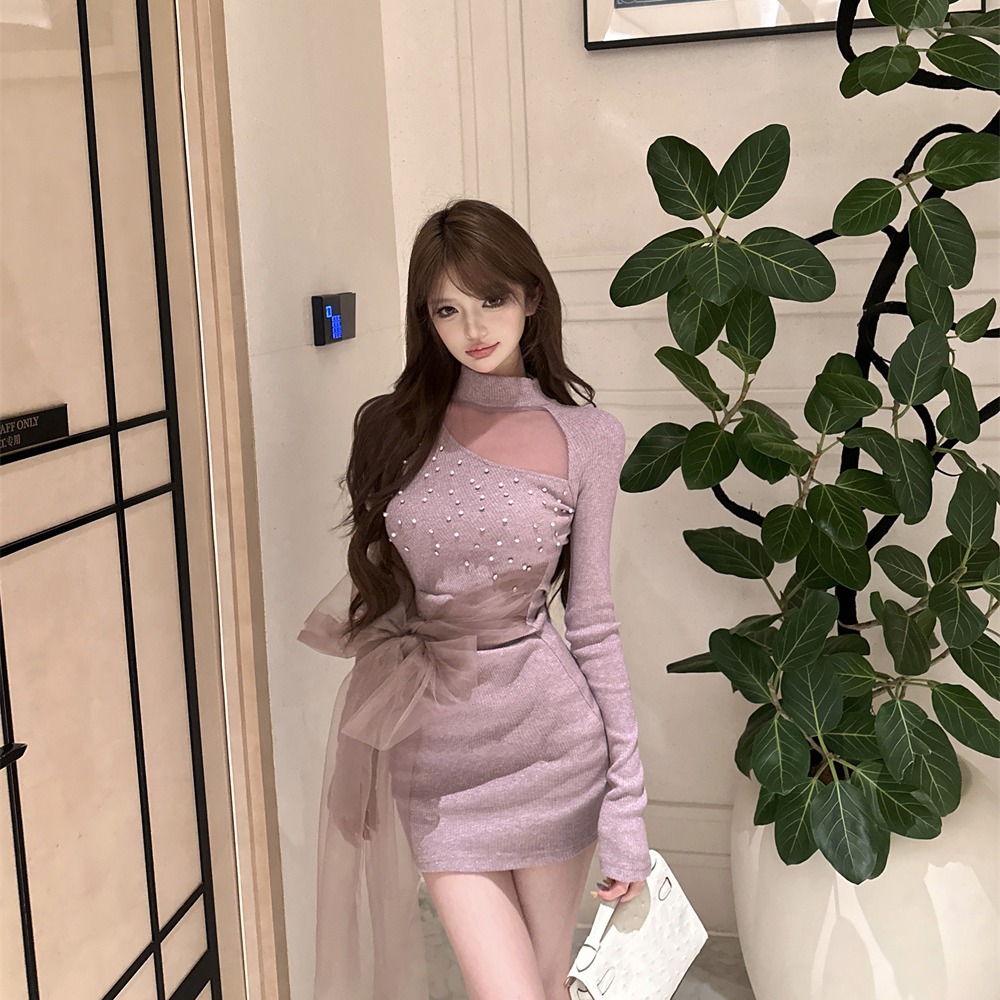 MY16943# 御姐温柔风紫色钉钻长袖连衣裙新款收腰显瘦针织包臀短裙子女裝貨源服裝批發