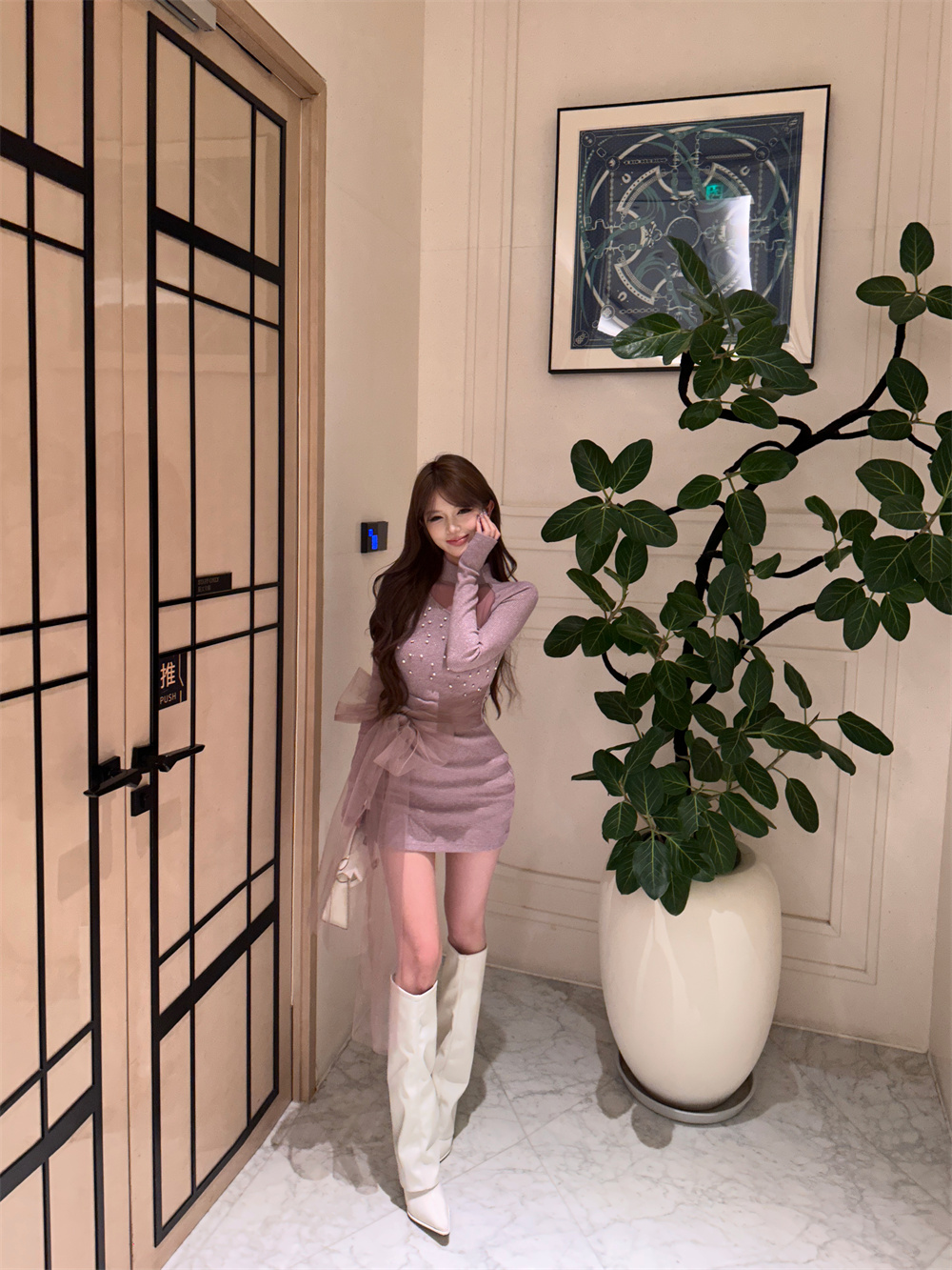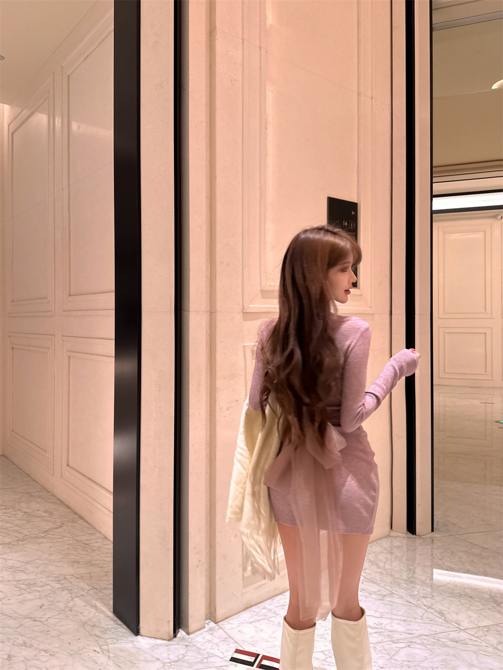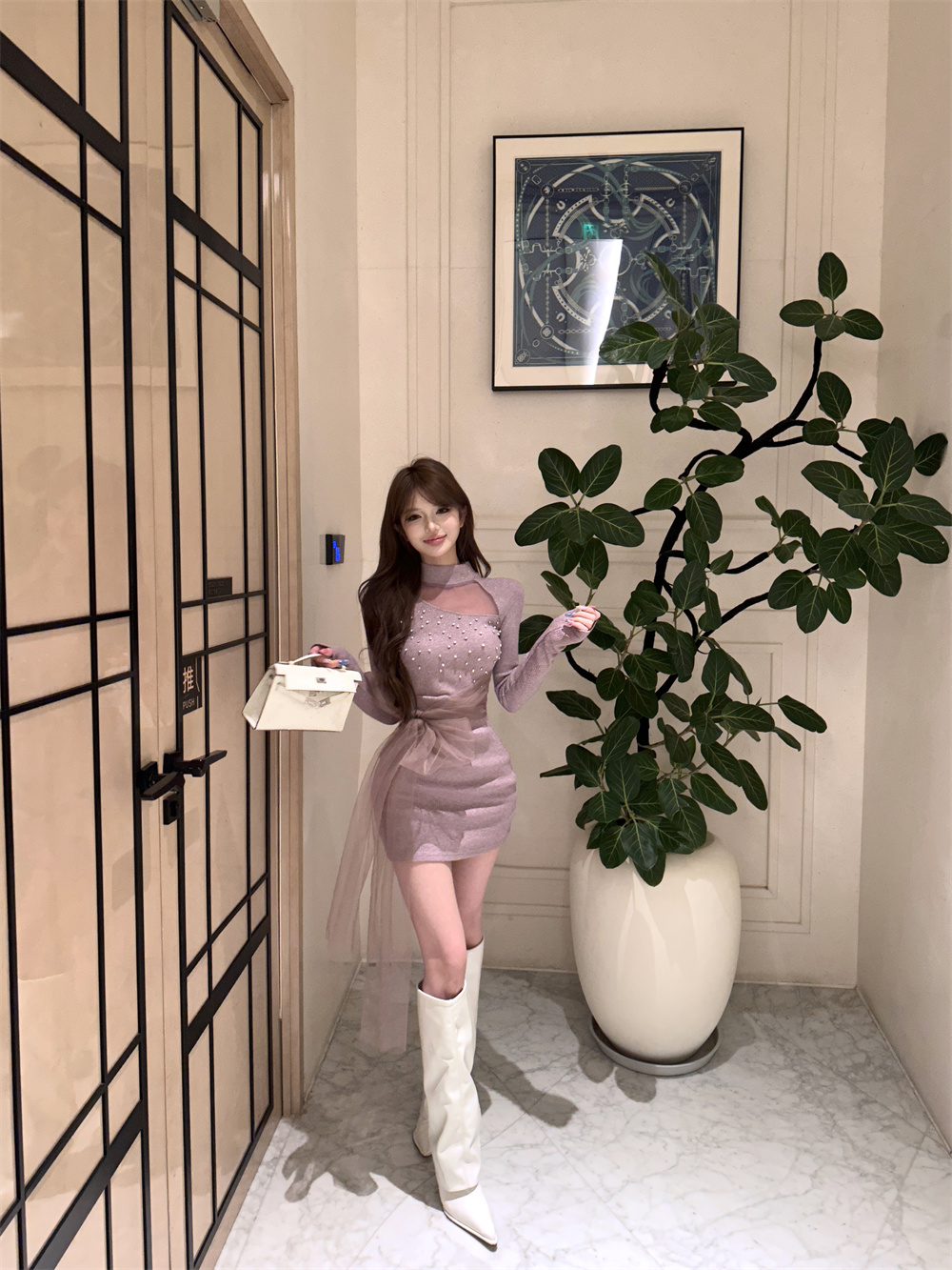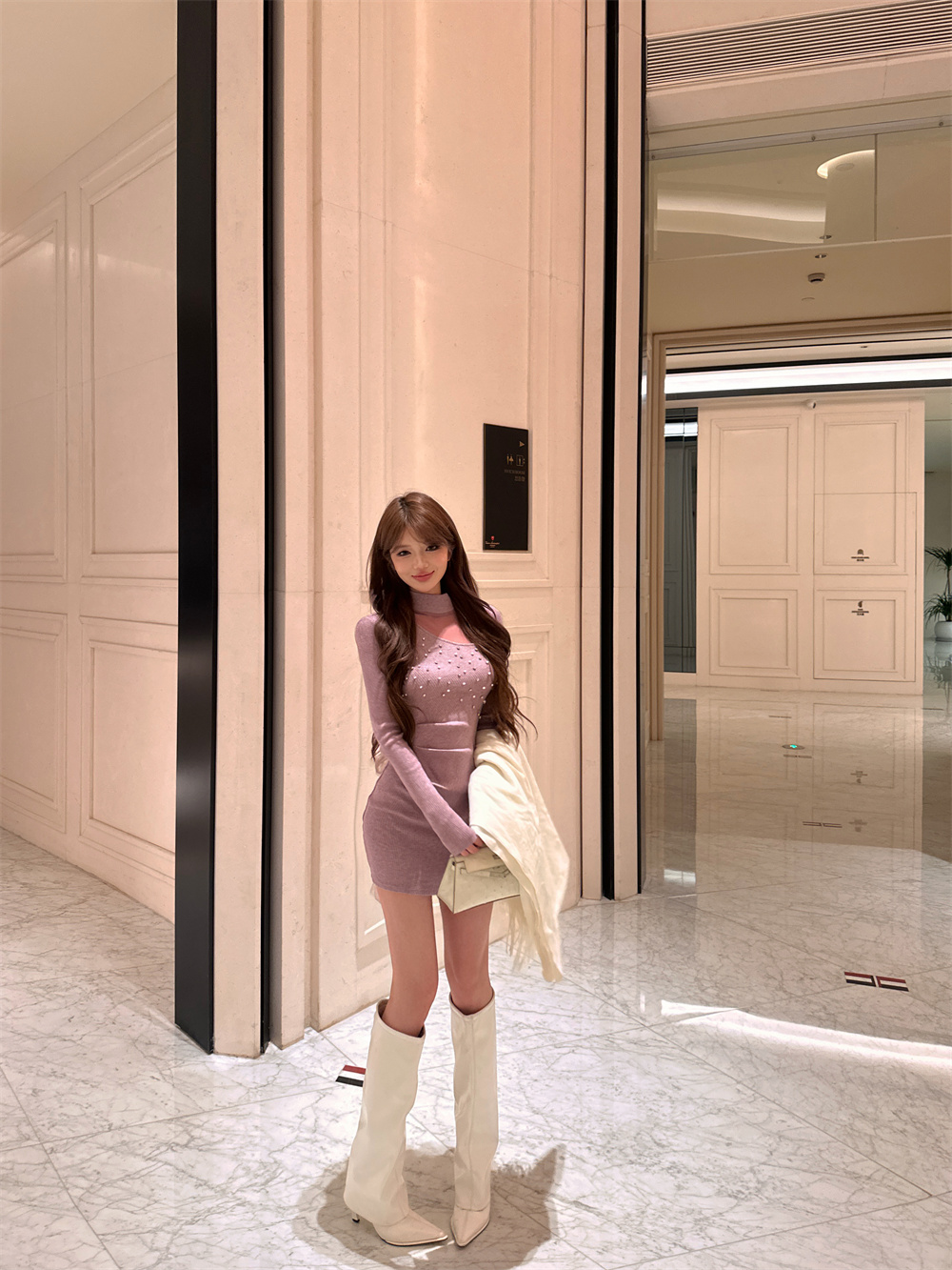 MY16943# 御姐温柔风紫色钉钻长袖连衣裙新款收腰显瘦针织包臀短裙子女裝貨源服裝批發