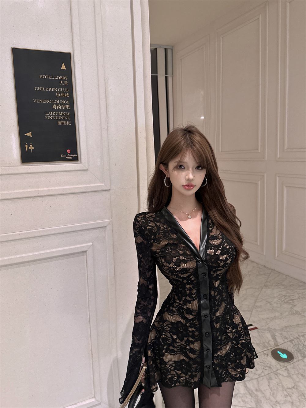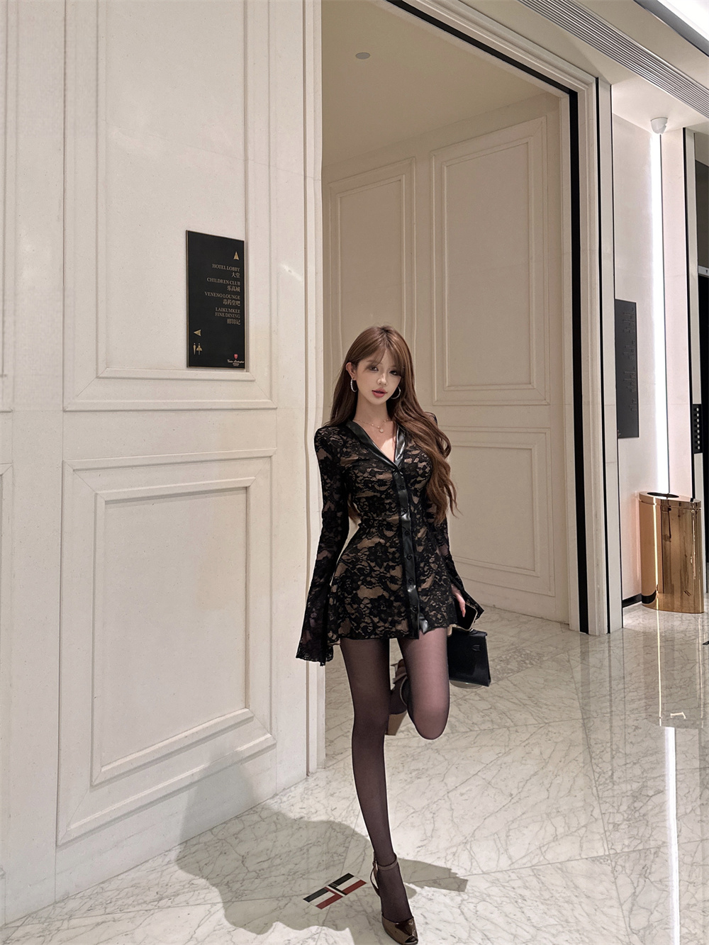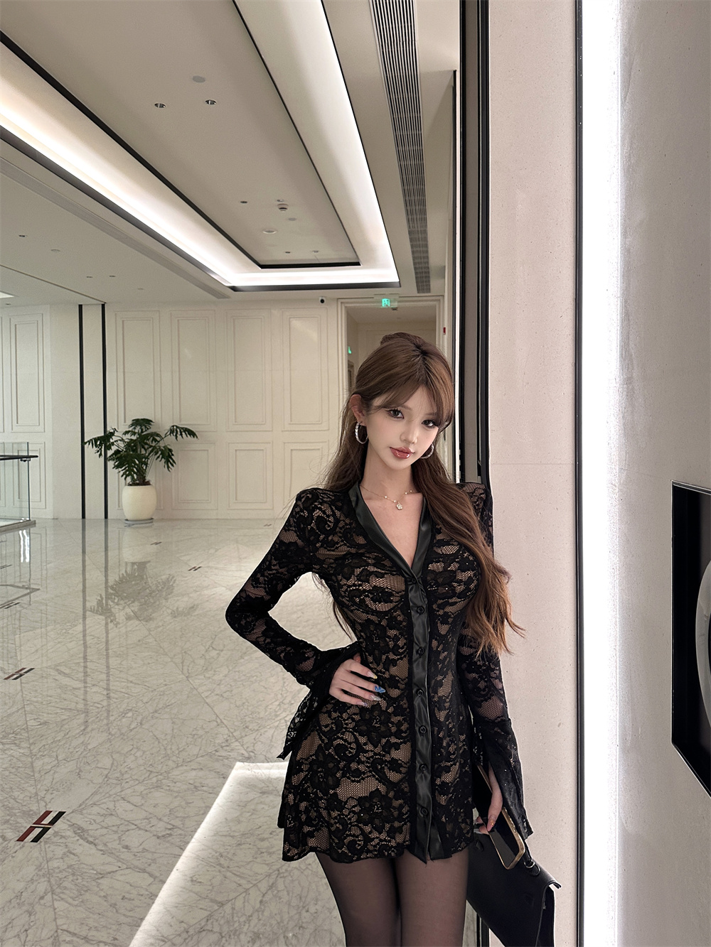 MY16944# 蕾丝拼接v领喇叭袖连衣裙女冬季纯欲风高级感修身收腰短裙子女裝貨源服裝批發