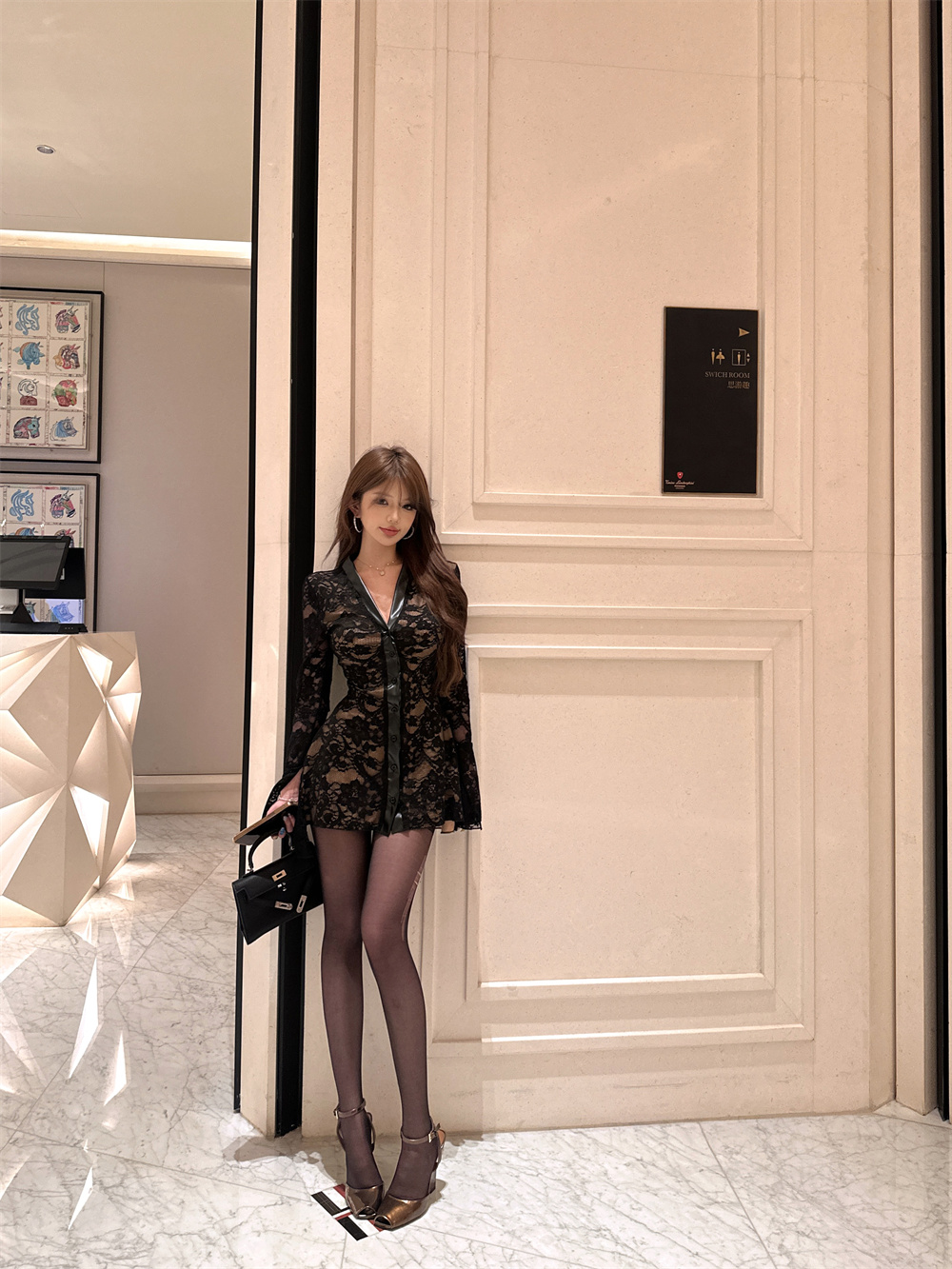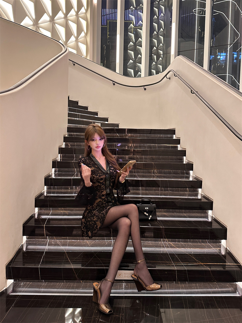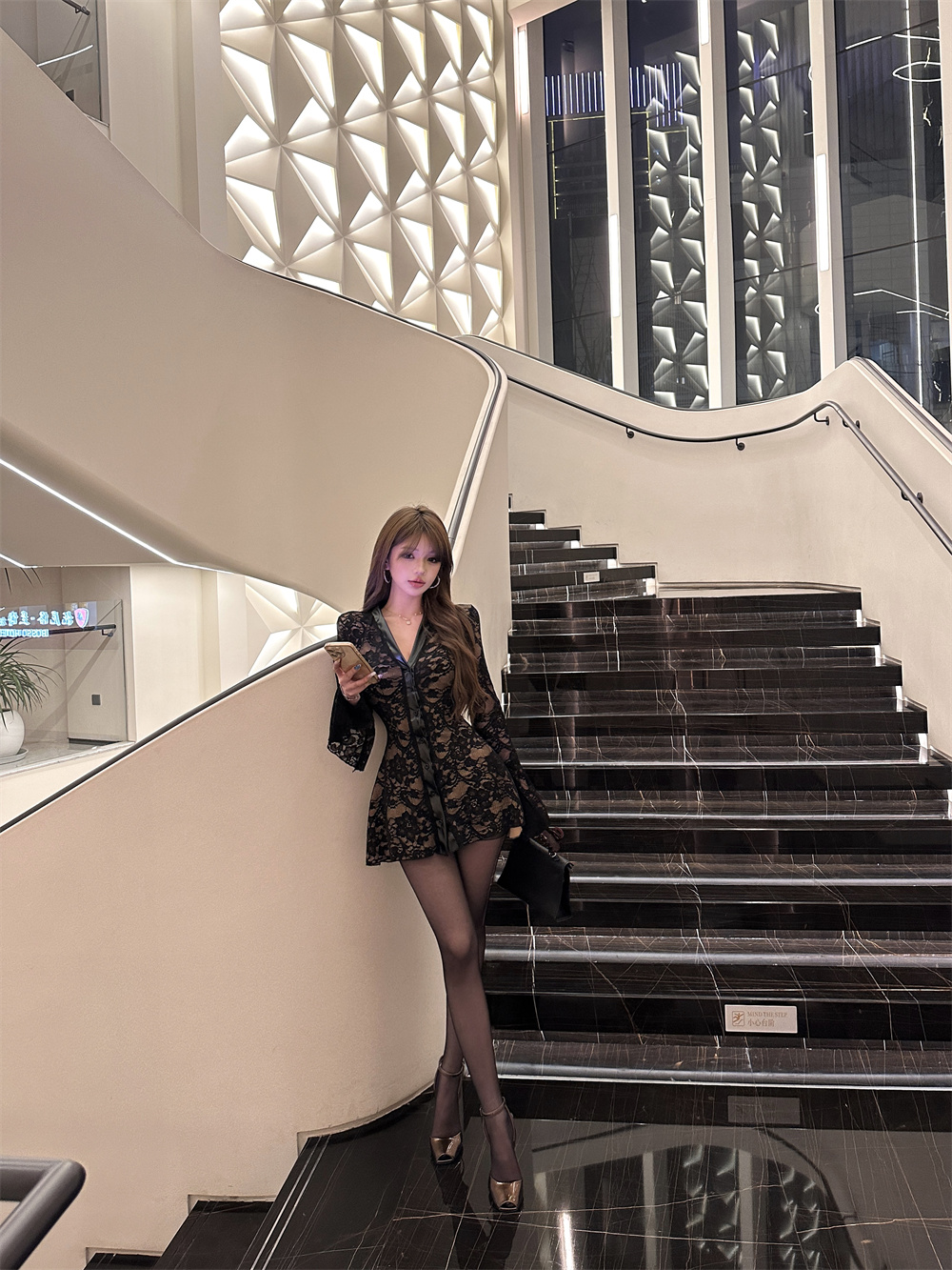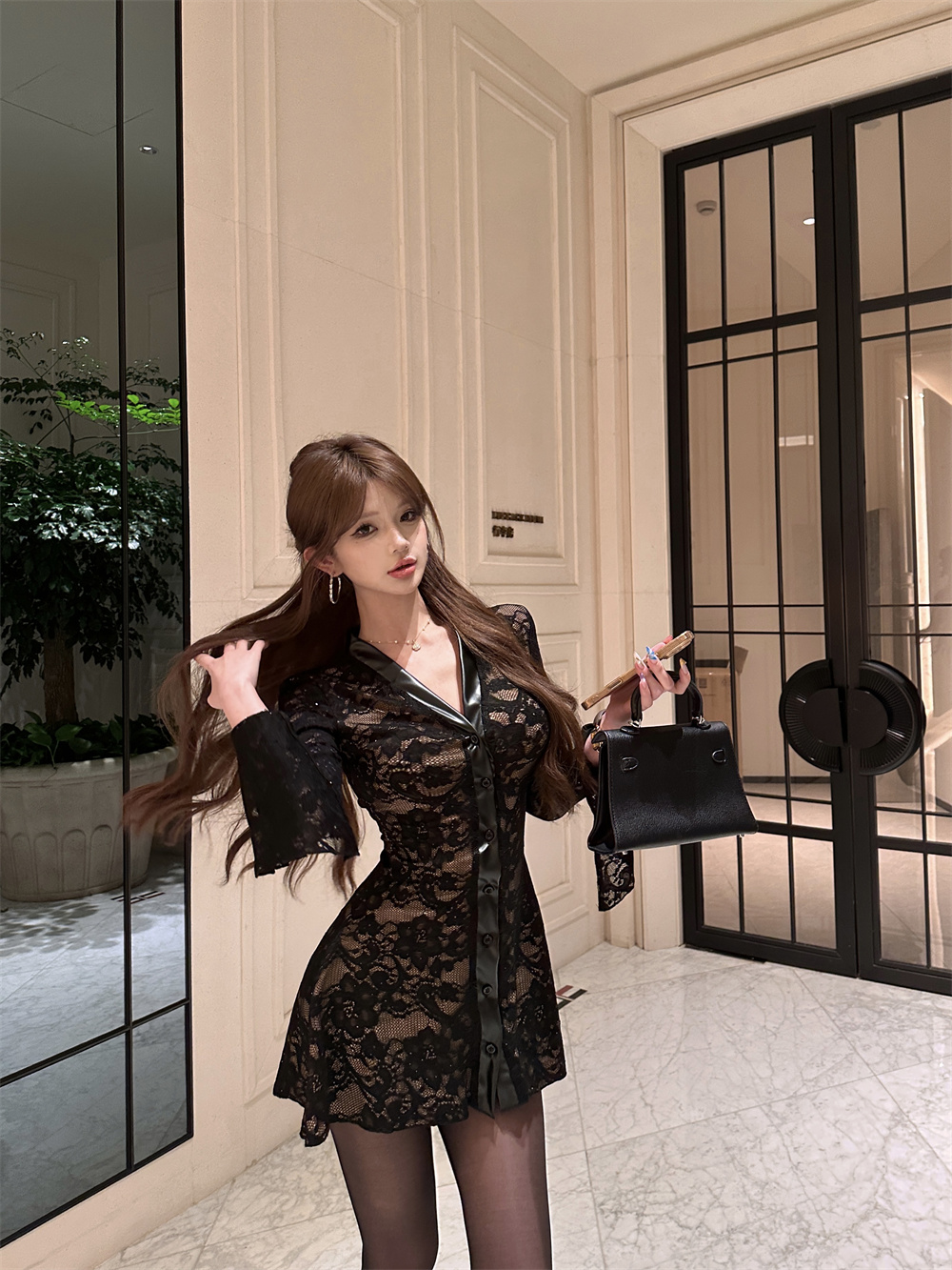 MY16944# 蕾丝拼接v领喇叭袖连衣裙女冬季纯欲风高级感修身收腰短裙子女裝貨源服裝批發