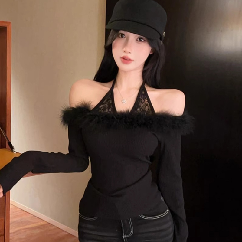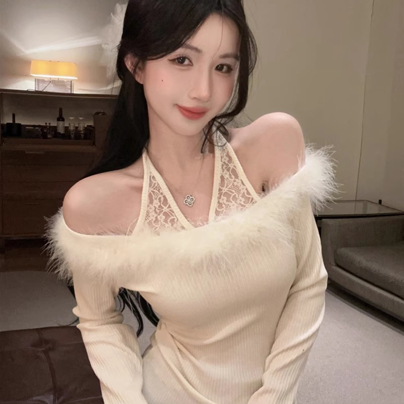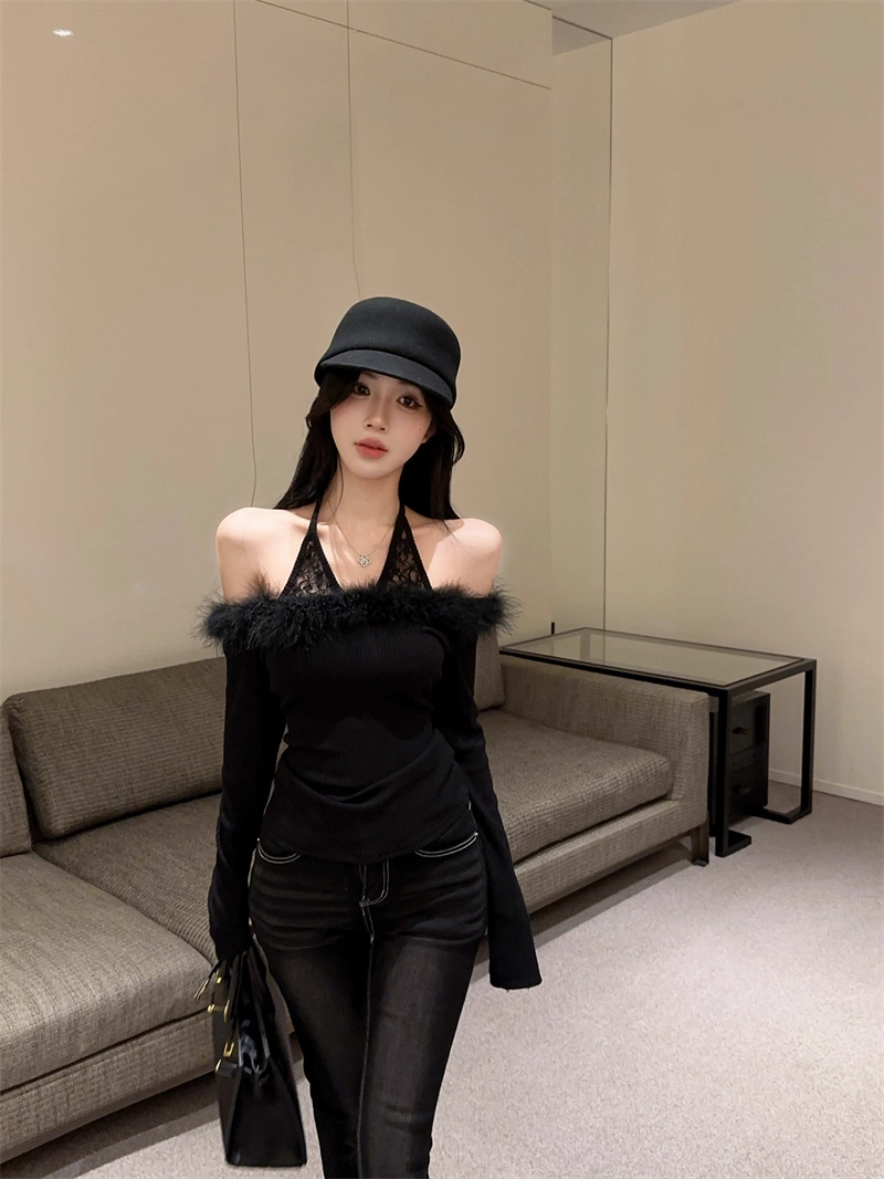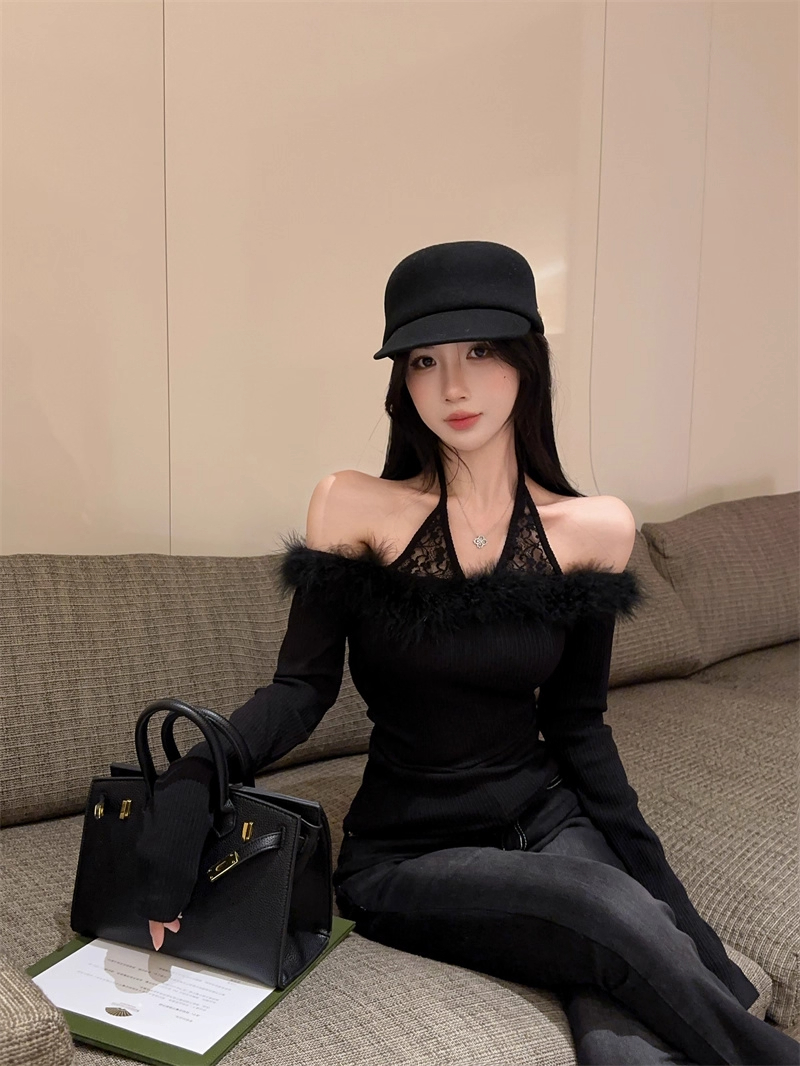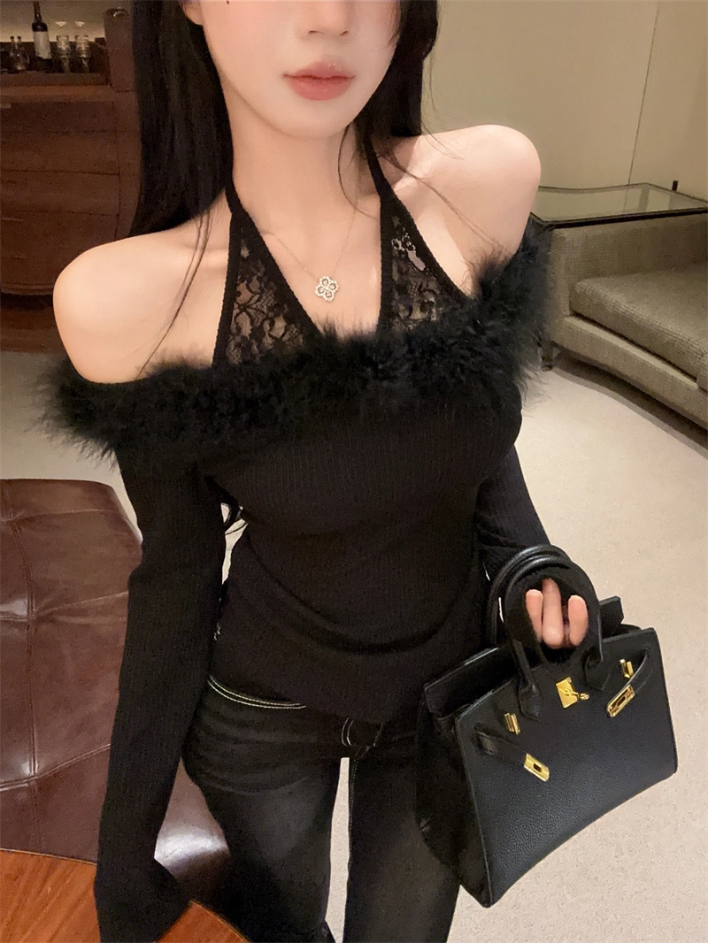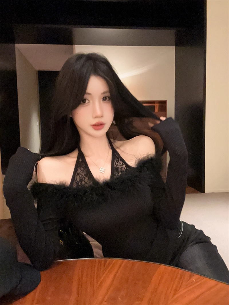 MY16948# 纯欲性感辣妹一字肩挂脖蕾丝拼接针织打底衫女修身显瘦上衣女裝貨源服裝批發