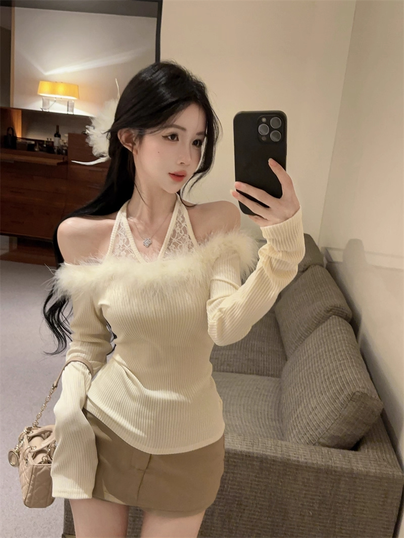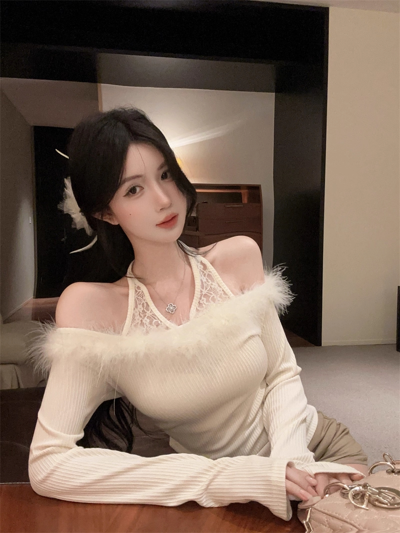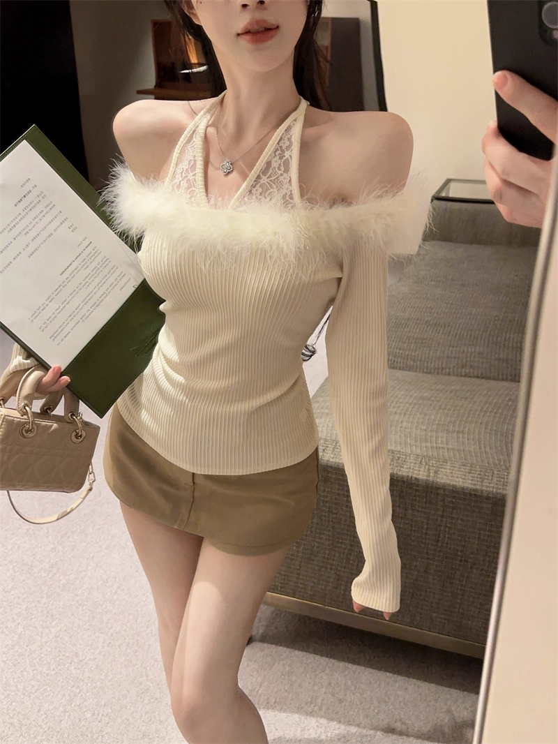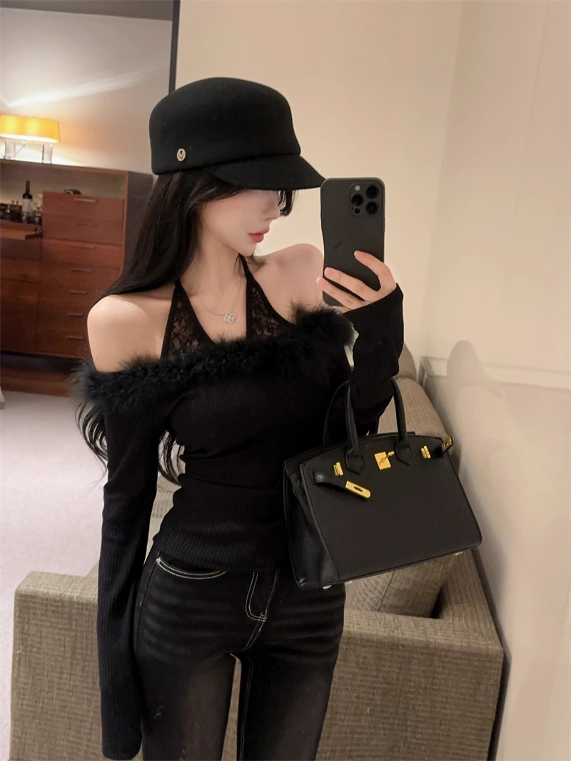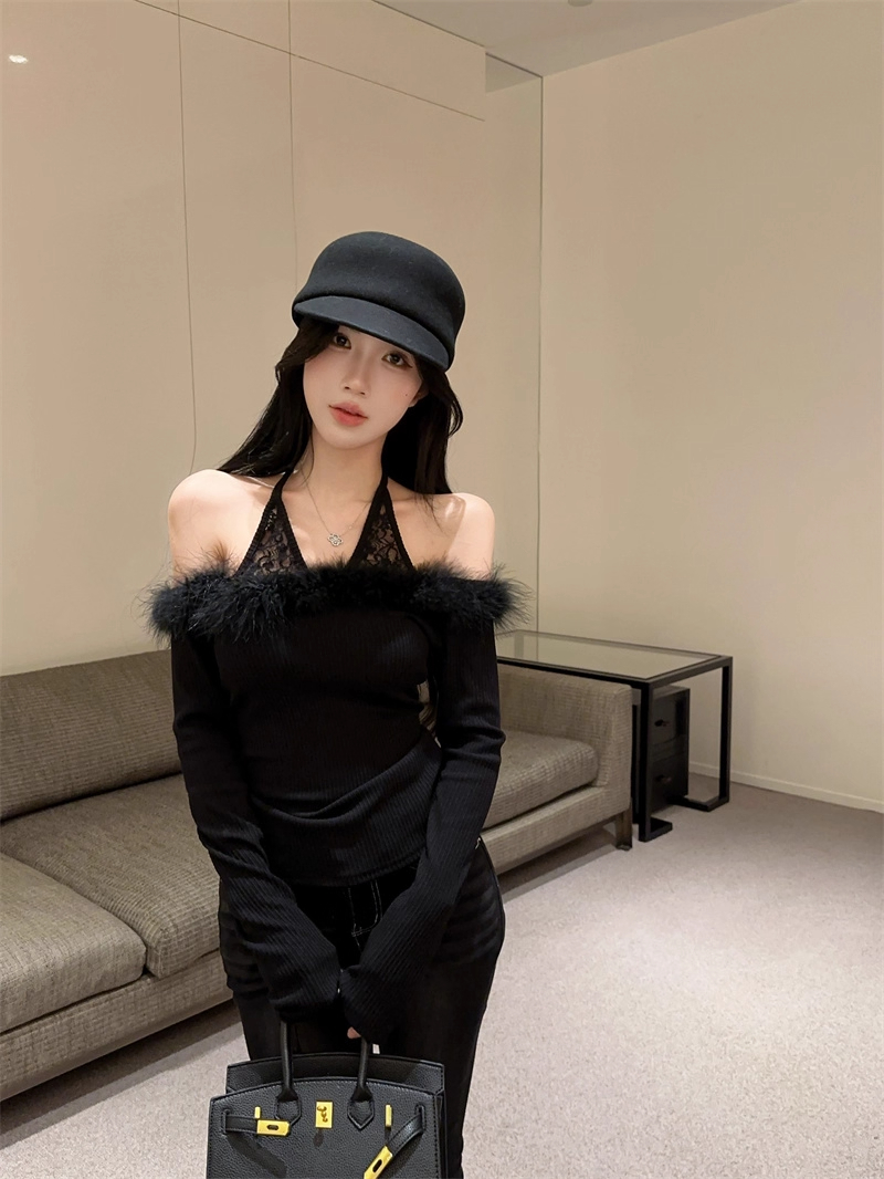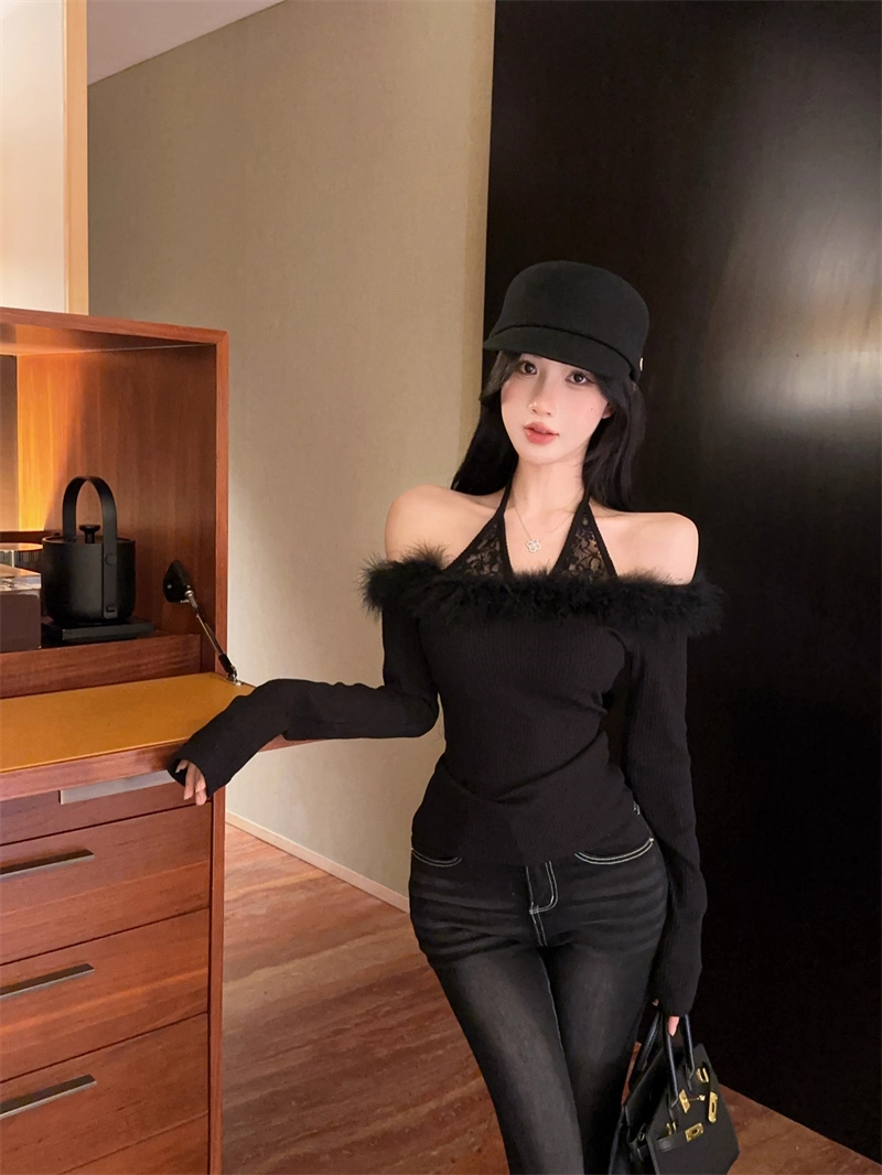 MY16948# 纯欲性感辣妹一字肩挂脖蕾丝拼接针织打底衫女修身显瘦上衣女裝貨源服裝批發
