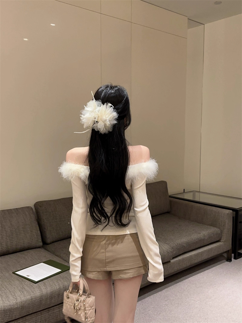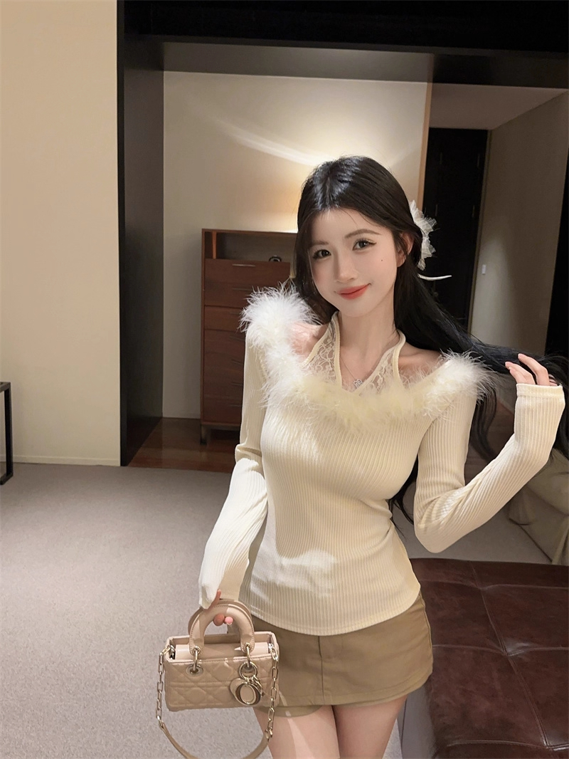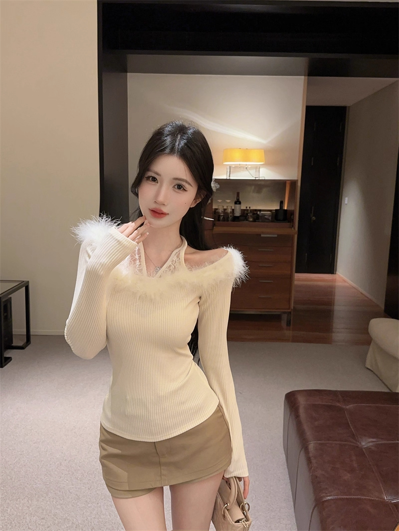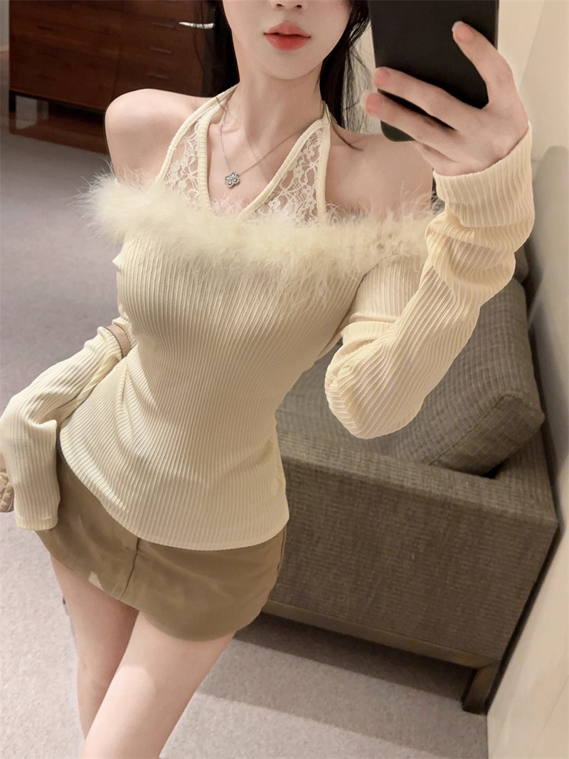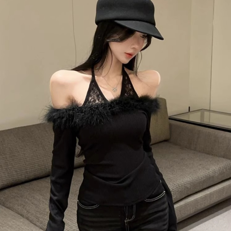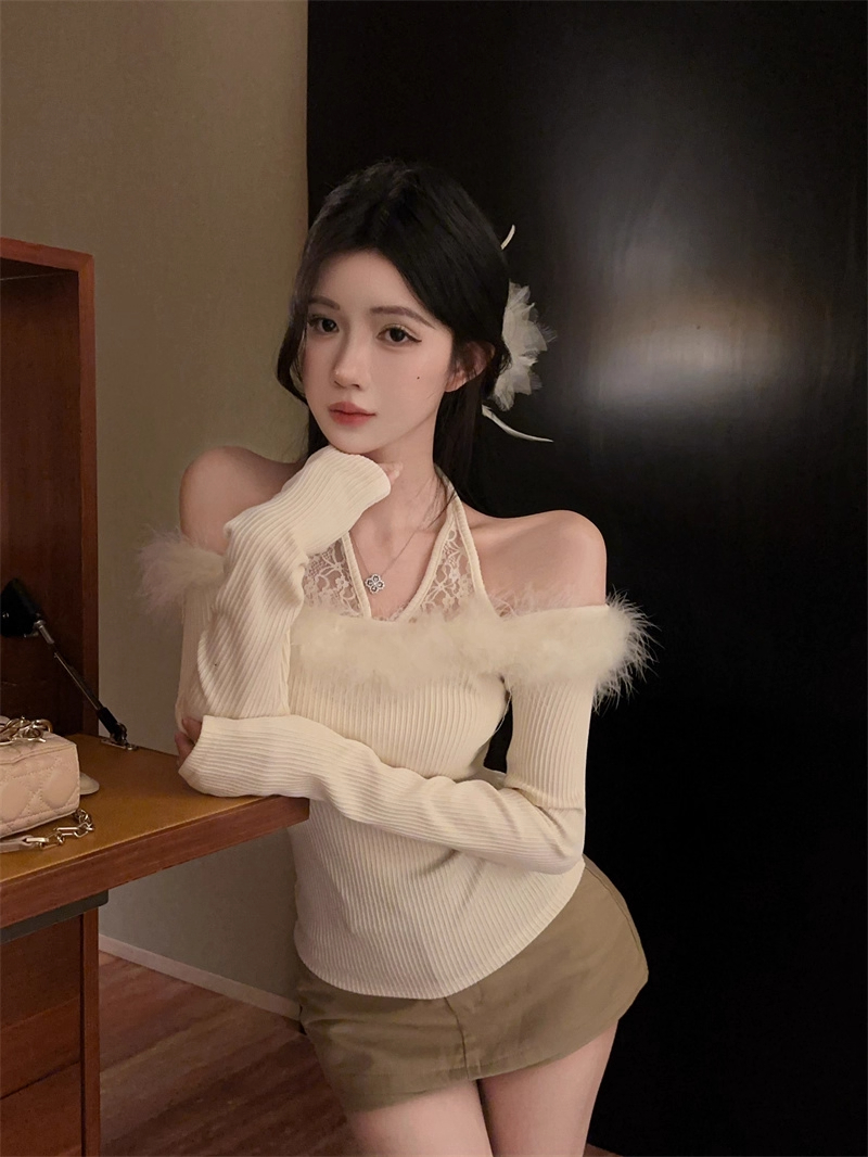 MY16948# 纯欲性感辣妹一字肩挂脖蕾丝拼接针织打底衫女修身显瘦上衣女裝貨源服裝批發