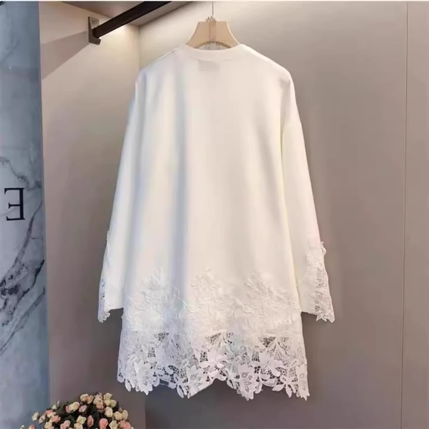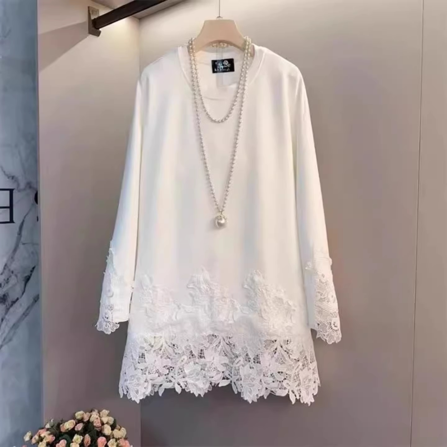 MY16953# 中长款蕾丝拼接长袖上衣胖MM正肩大码简约休闲百搭打底T恤女女裝貨源服裝批發