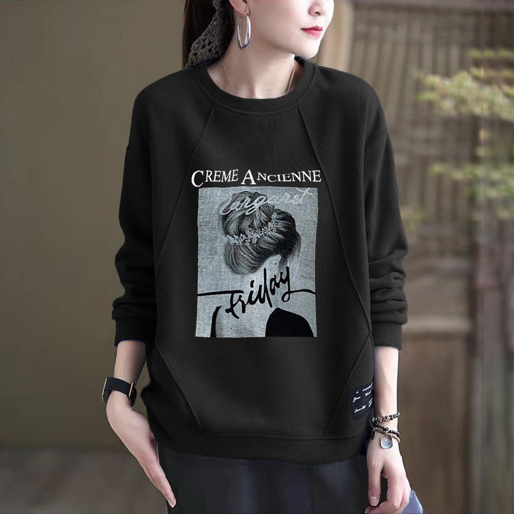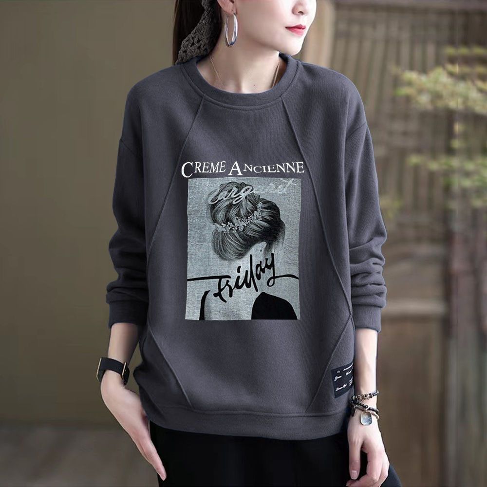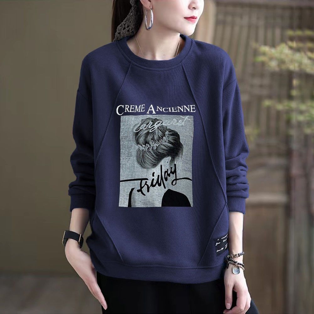 MY16960# 新款套头卫衣女大码圆领长袖胖mm韩版宽松印花洋气体恤潮女裝貨源服裝批發