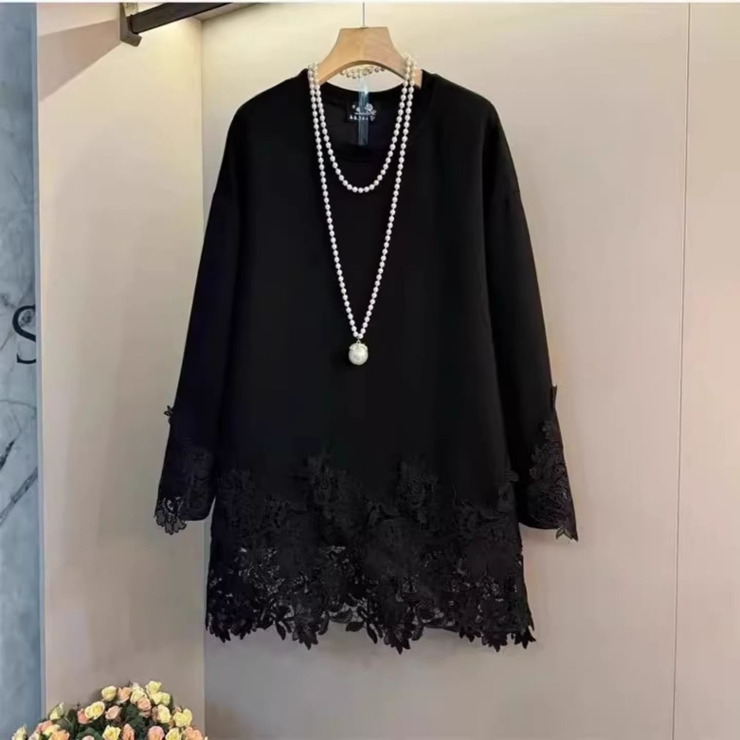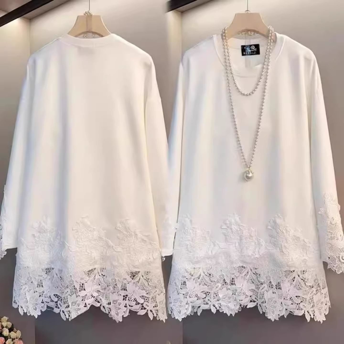 MY16962# 胖MM正肩大码韩版中长款蕾丝打底衫百搭白色简约拼接长袖上衣女裝貨源服裝批發