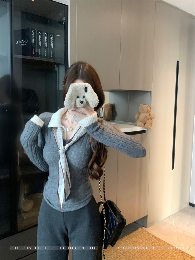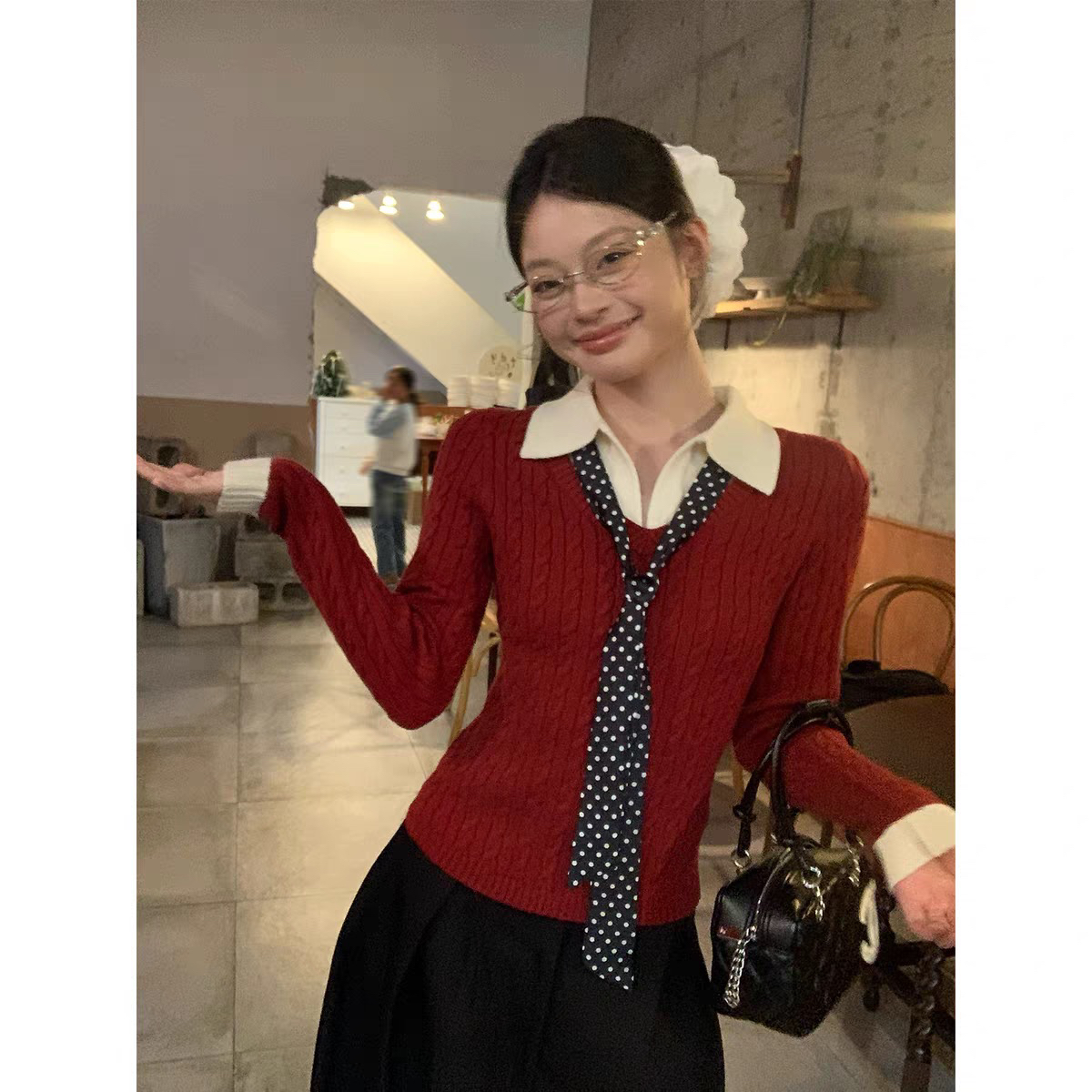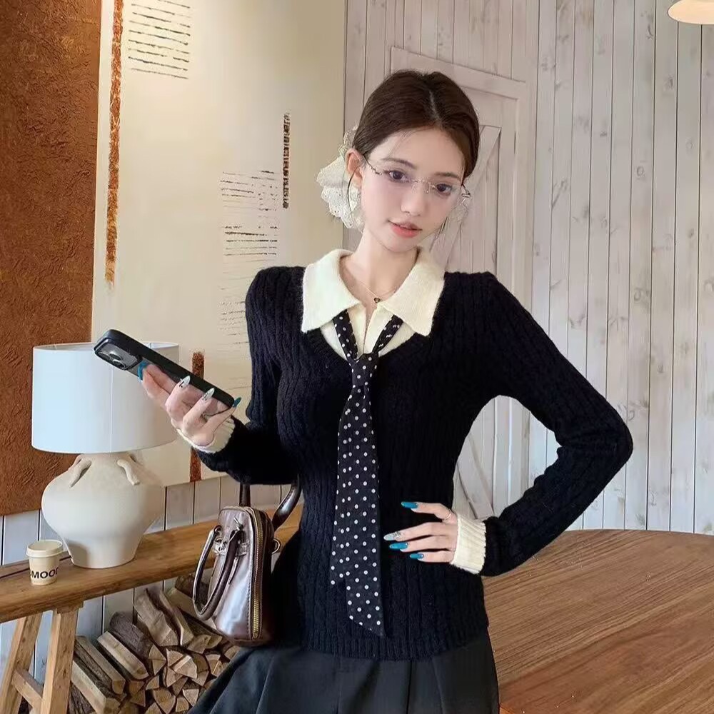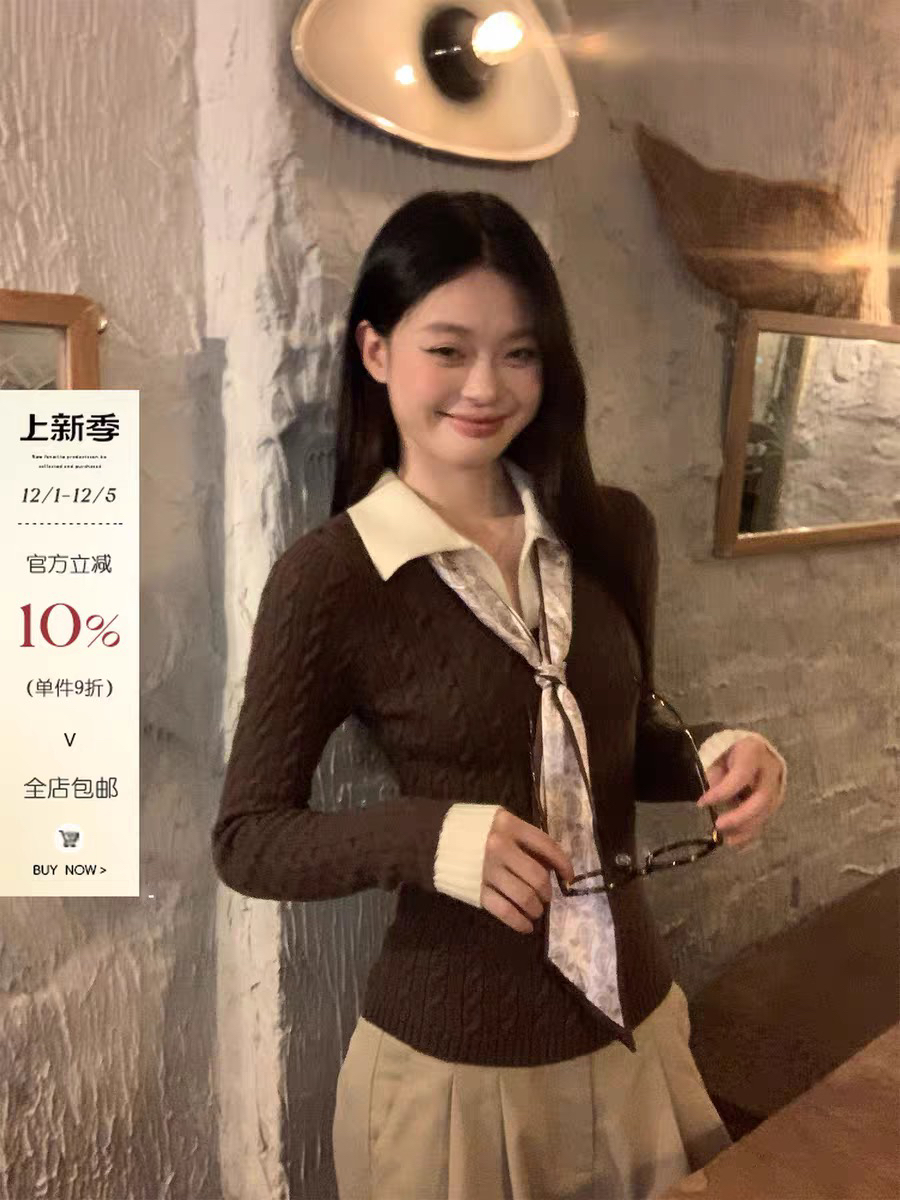MY17038# 宋正恩咖色Polo领假两件针织衫女内搭修身短款长袖小上衣女裝貨源服裝批發