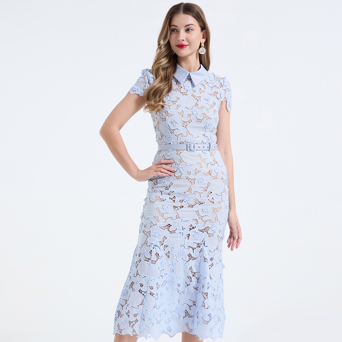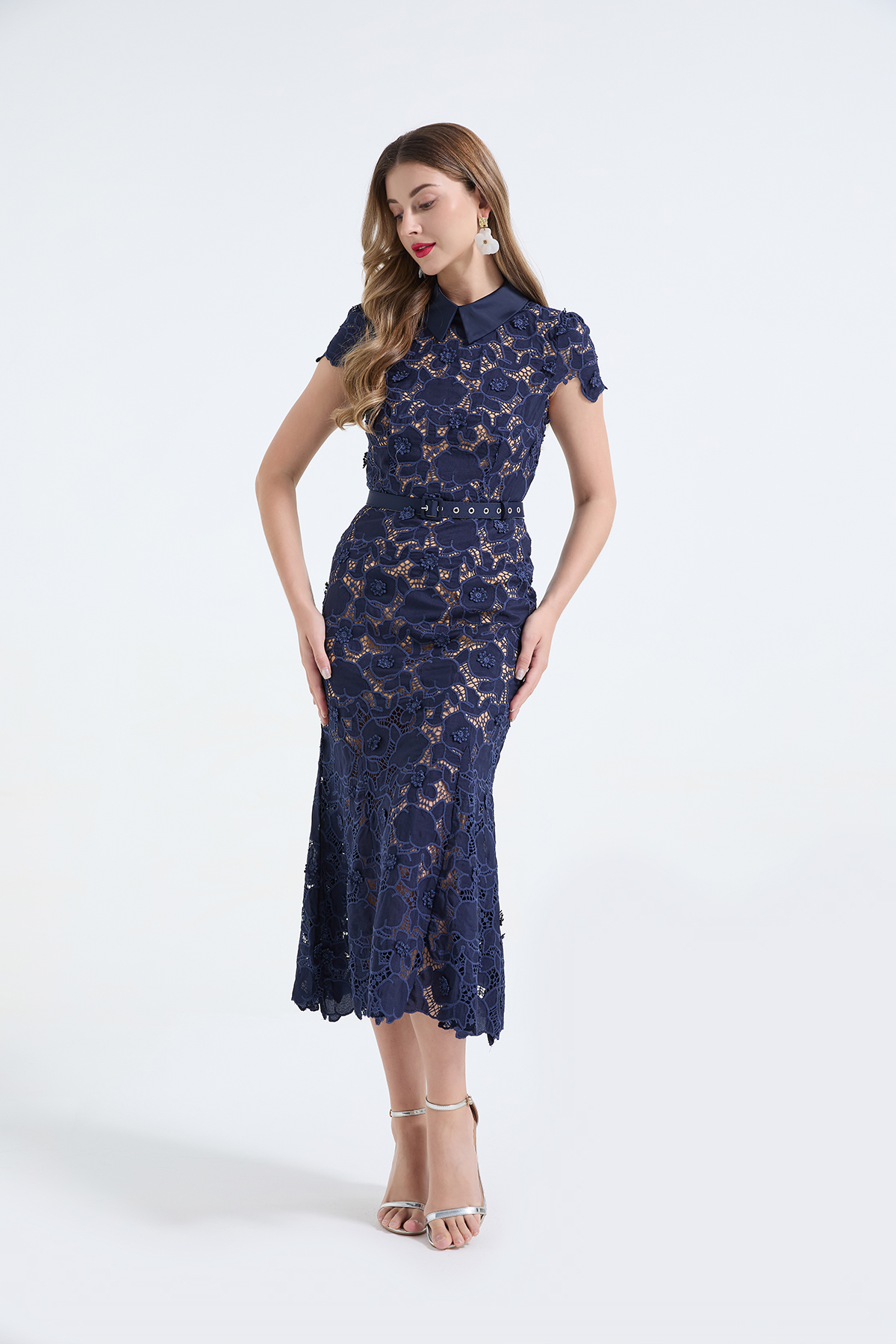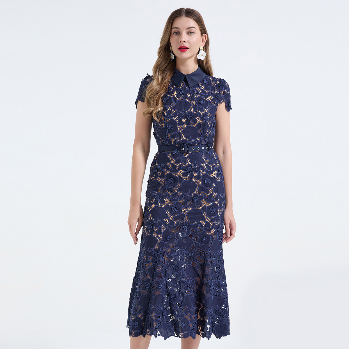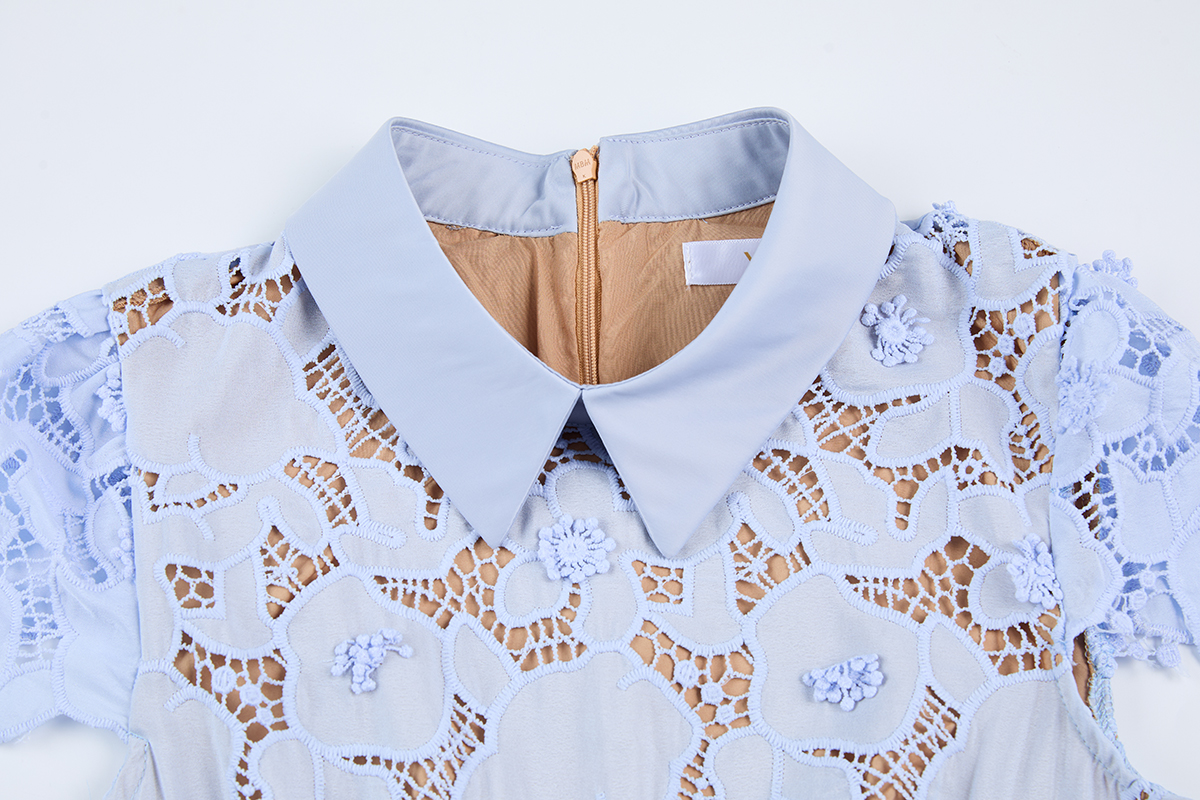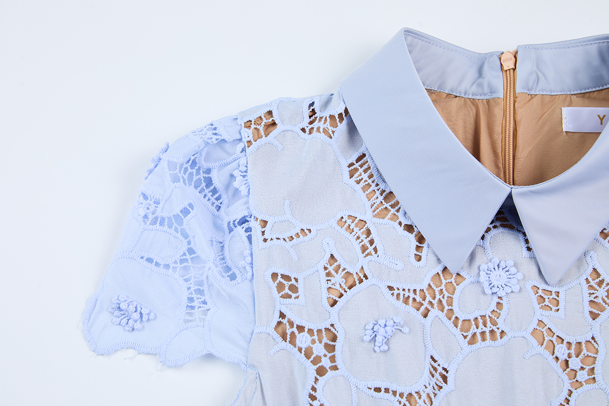 MY17621# 重工蕾丝立体镂空花朵蕾丝拼接衬衫领修身鱼尾连衣裙女裝貨源服裝批發