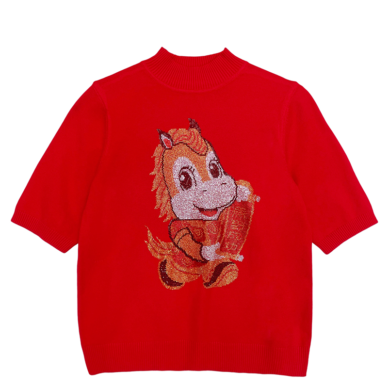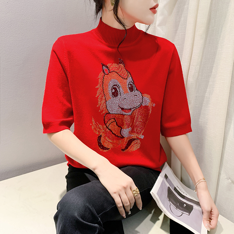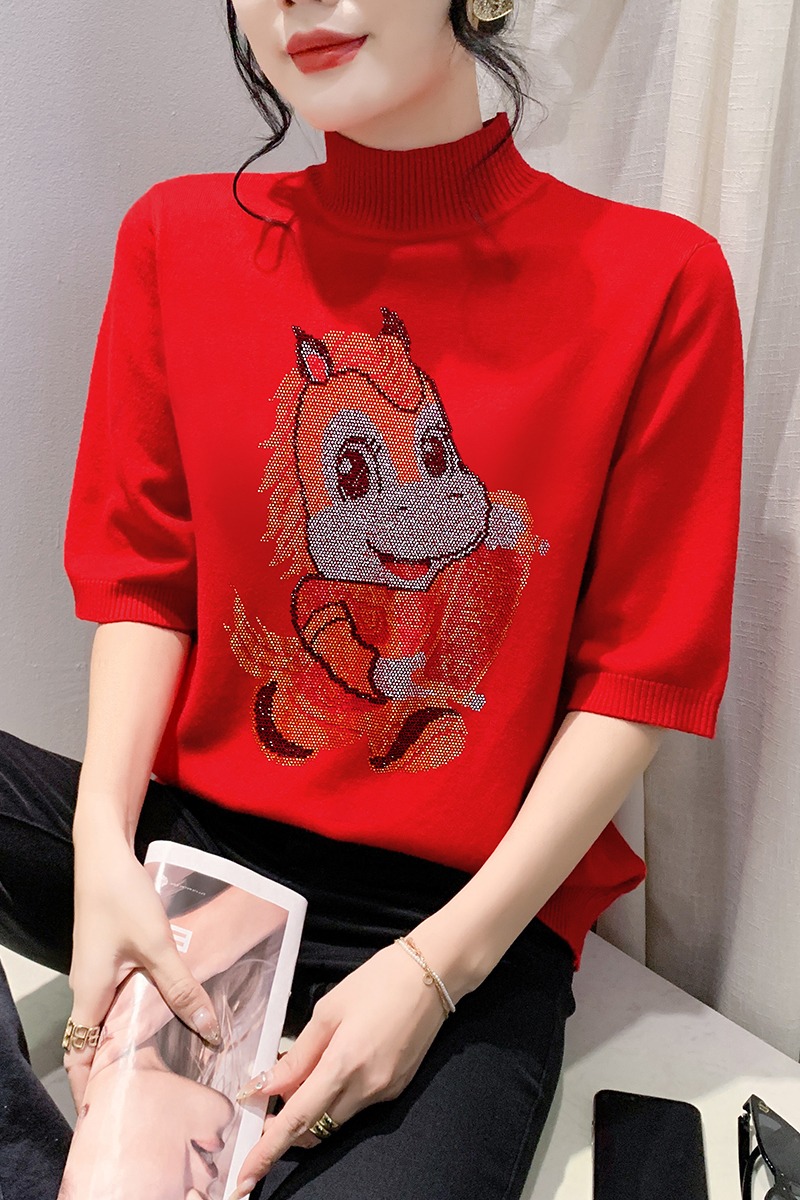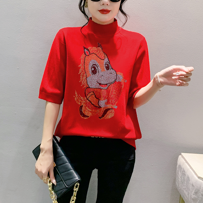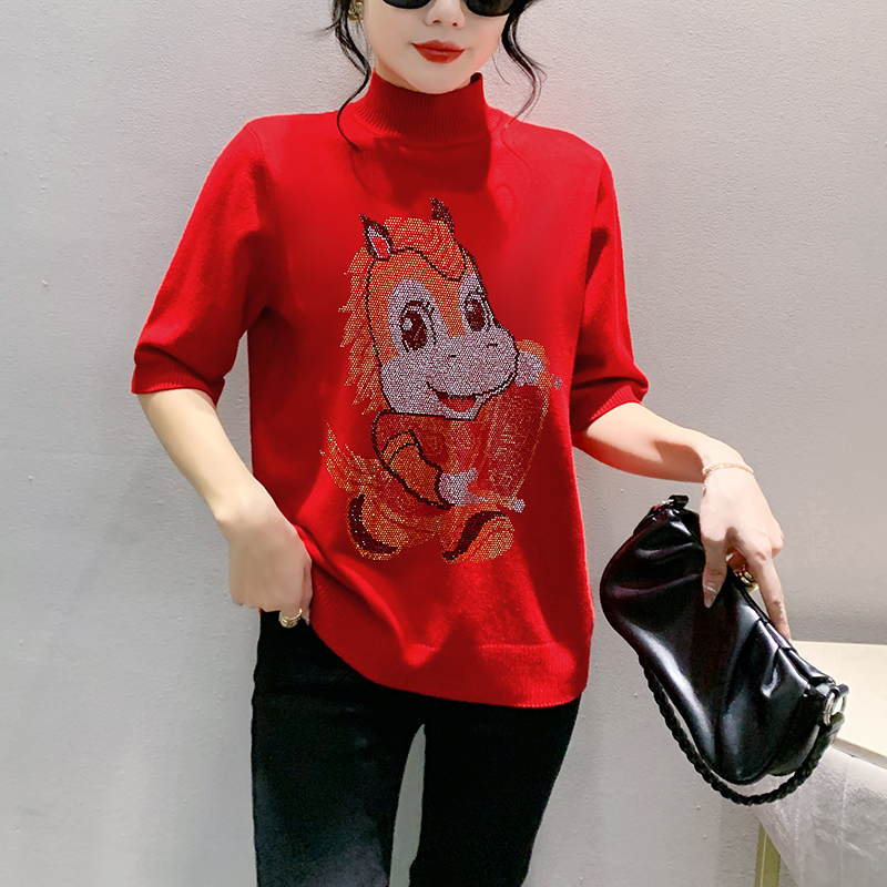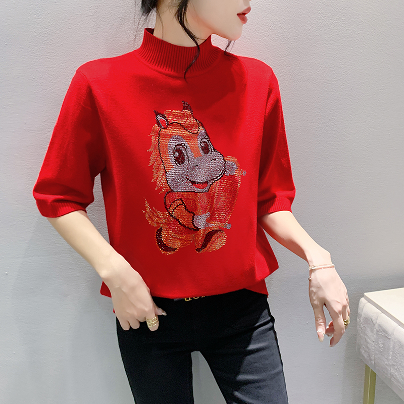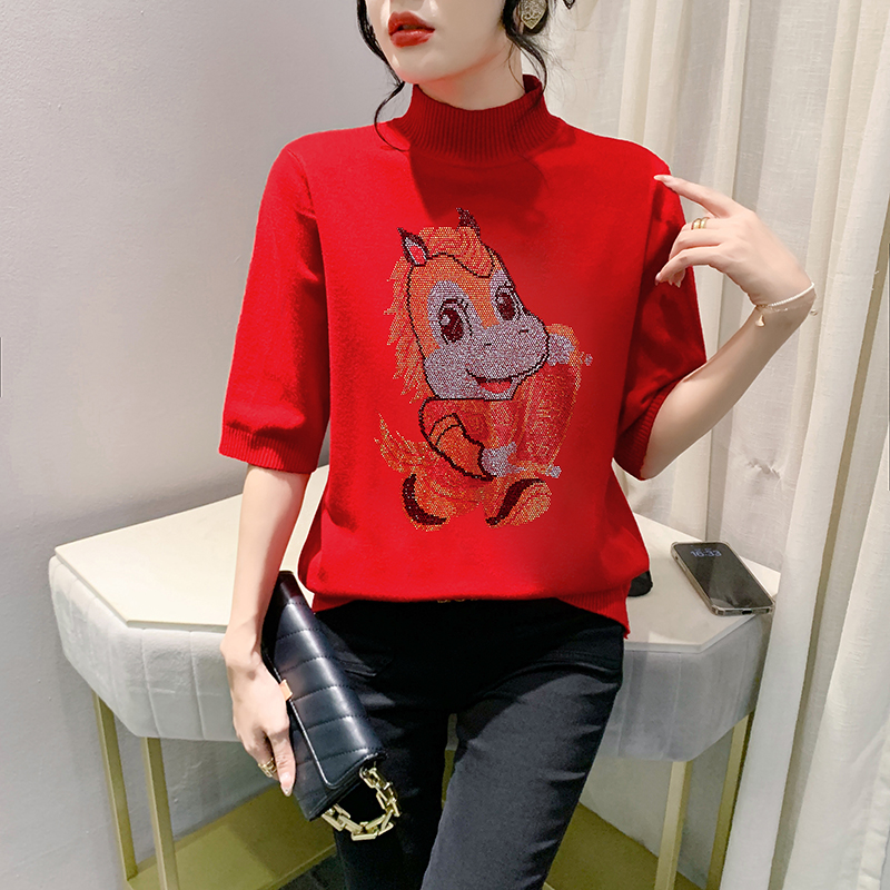 MY17636# 新款马年镶钻针织本命年大红套头毛衣女秋冬半高领打底衫女裝貨源服裝批發
