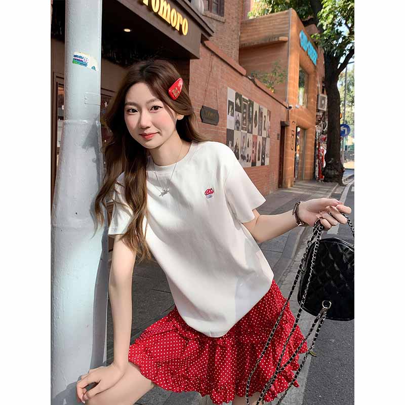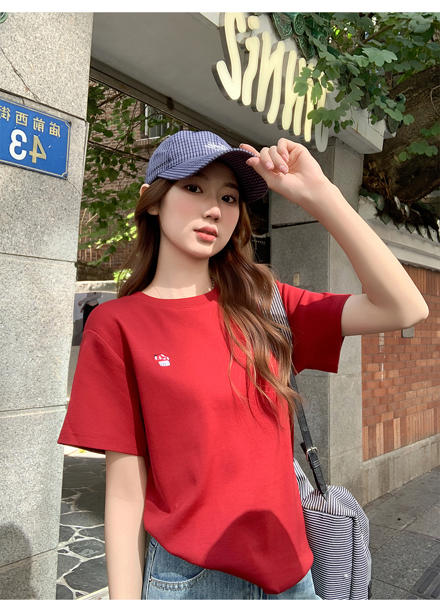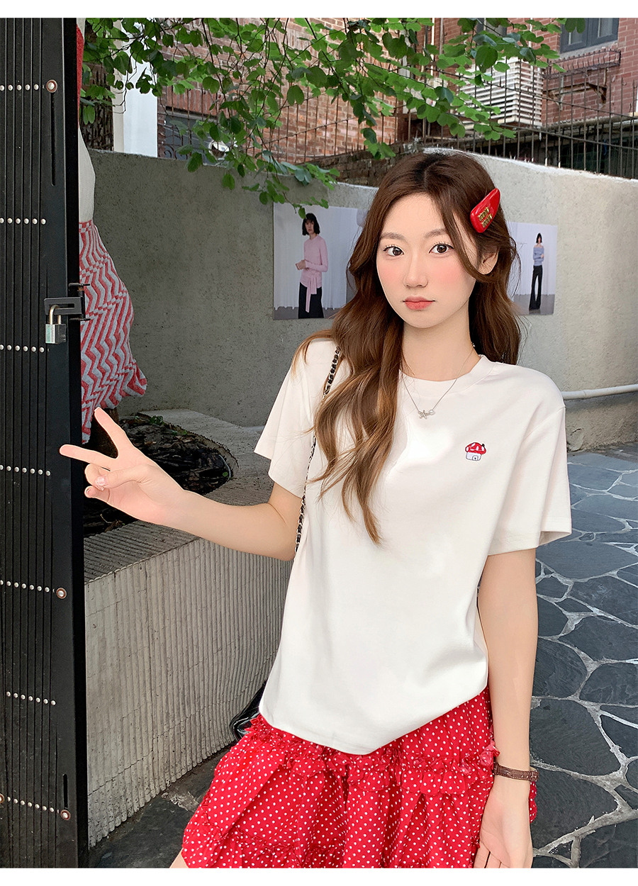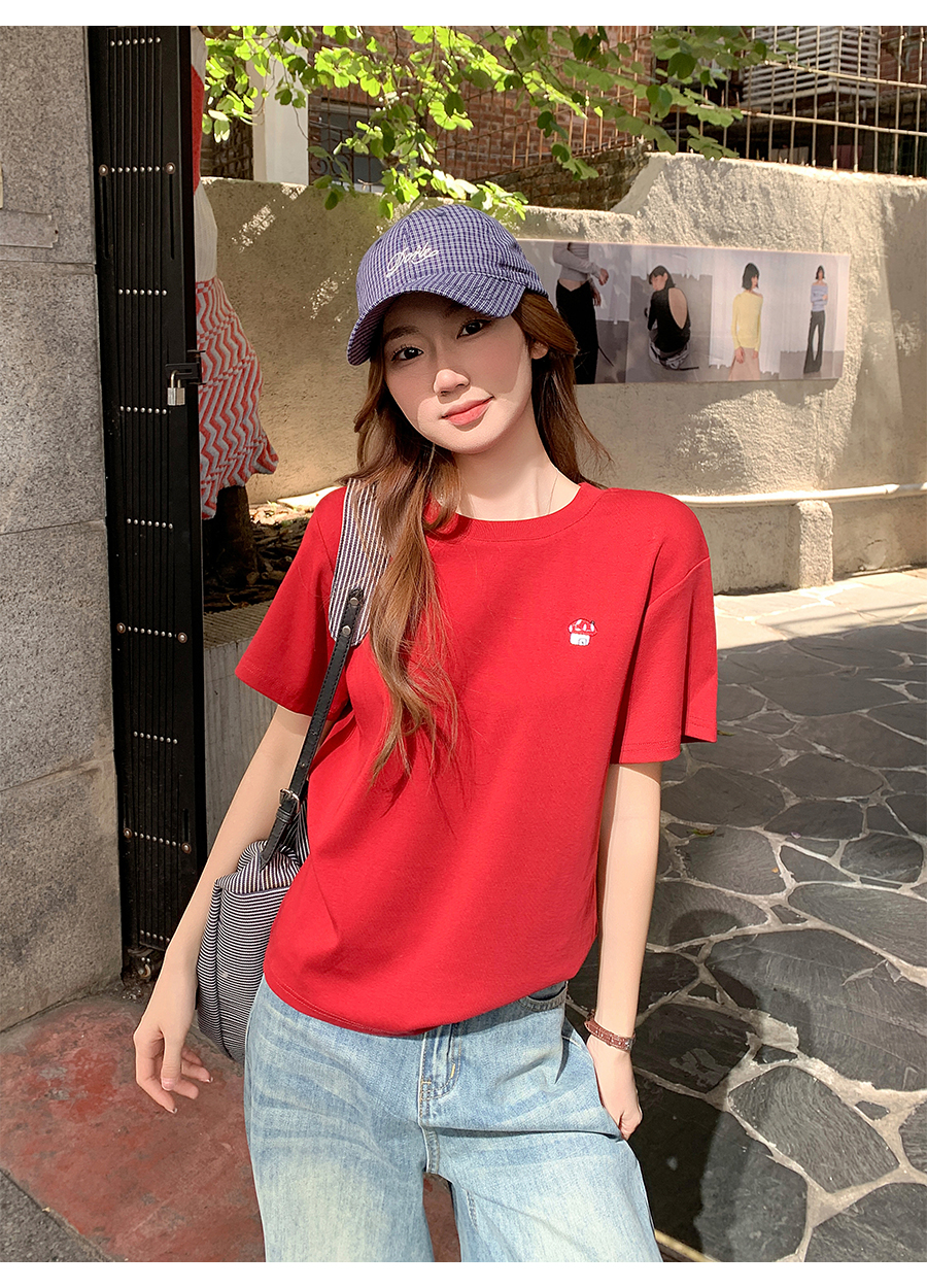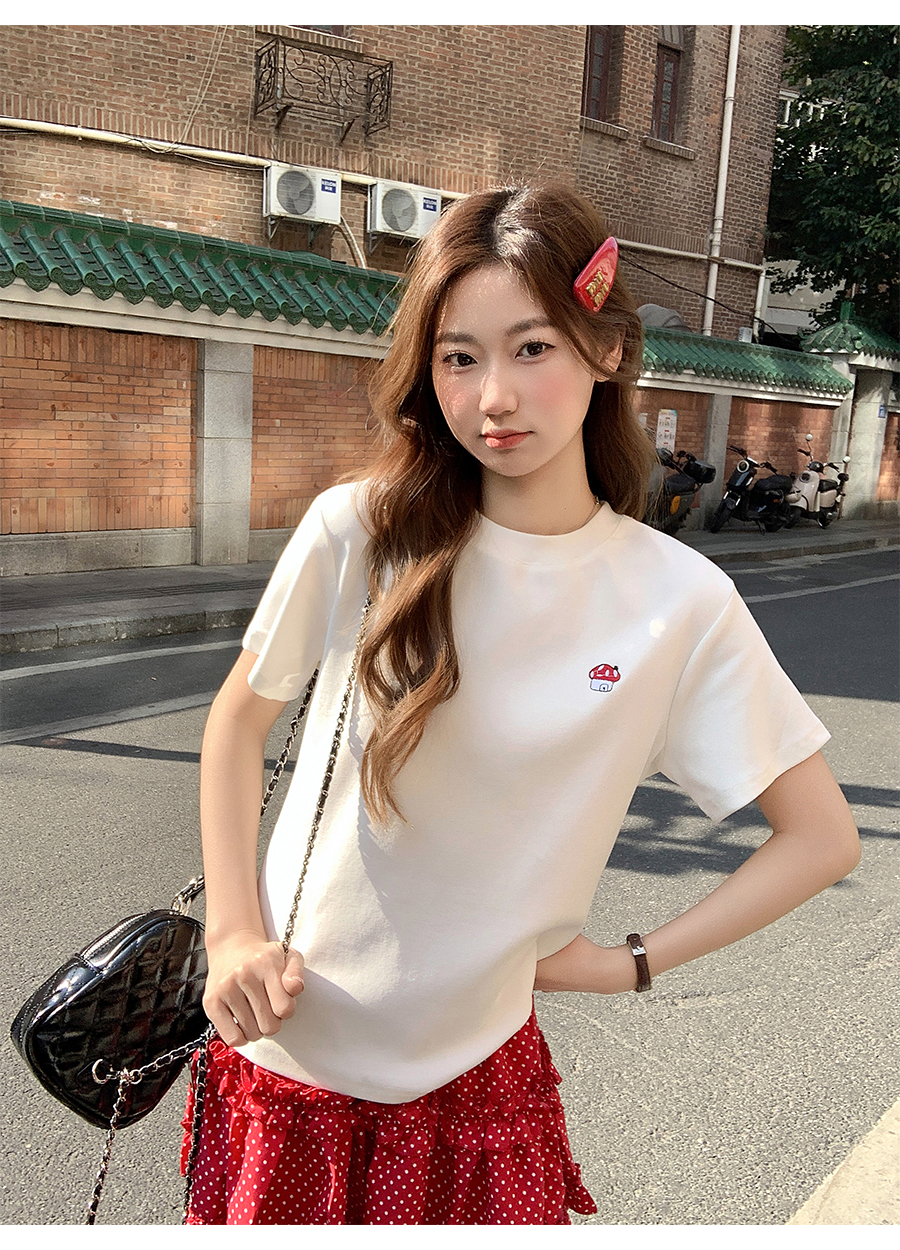 MY17639# 简约百搭圆领刺绣短袖t恤新款设计高级感修身打底小衫上衣女裝貨源服裝批發