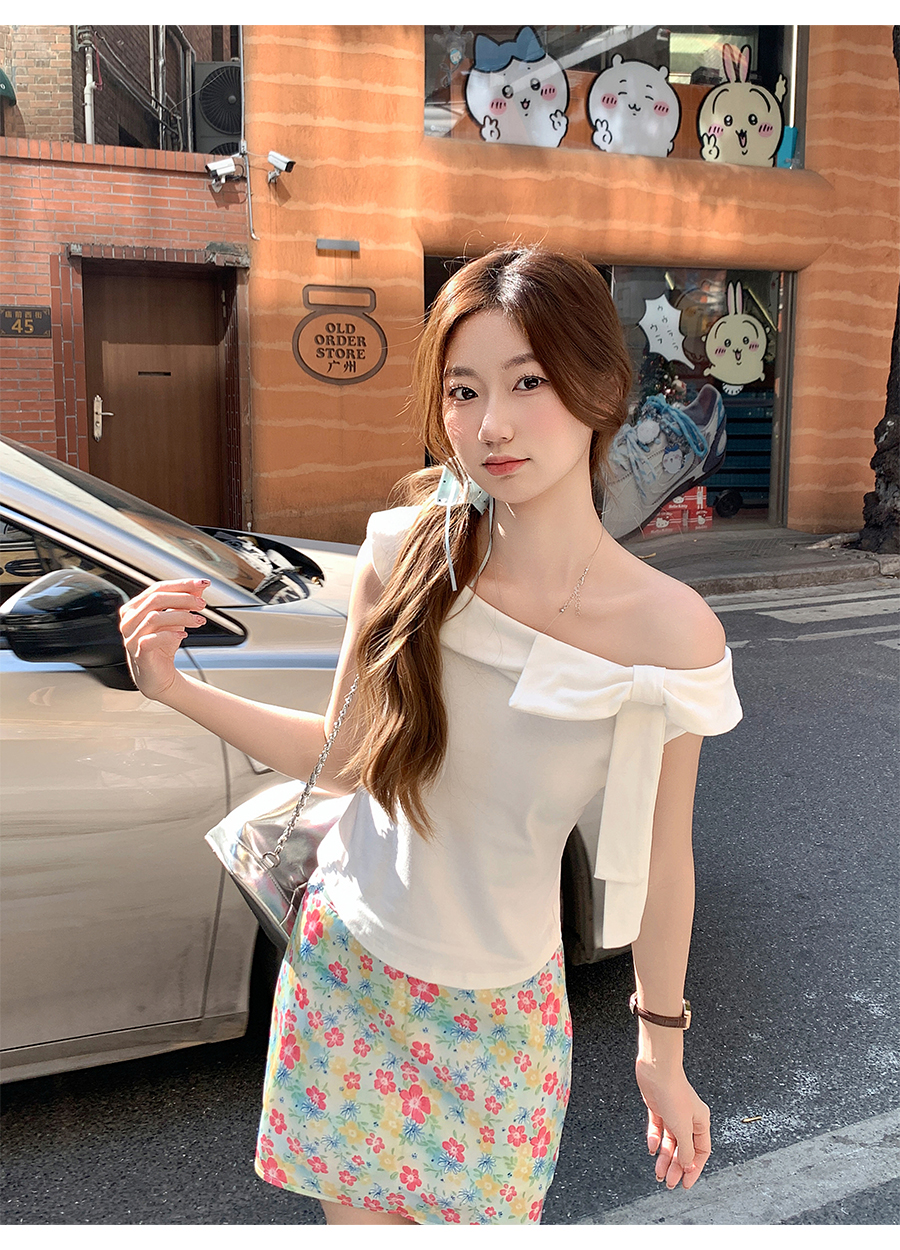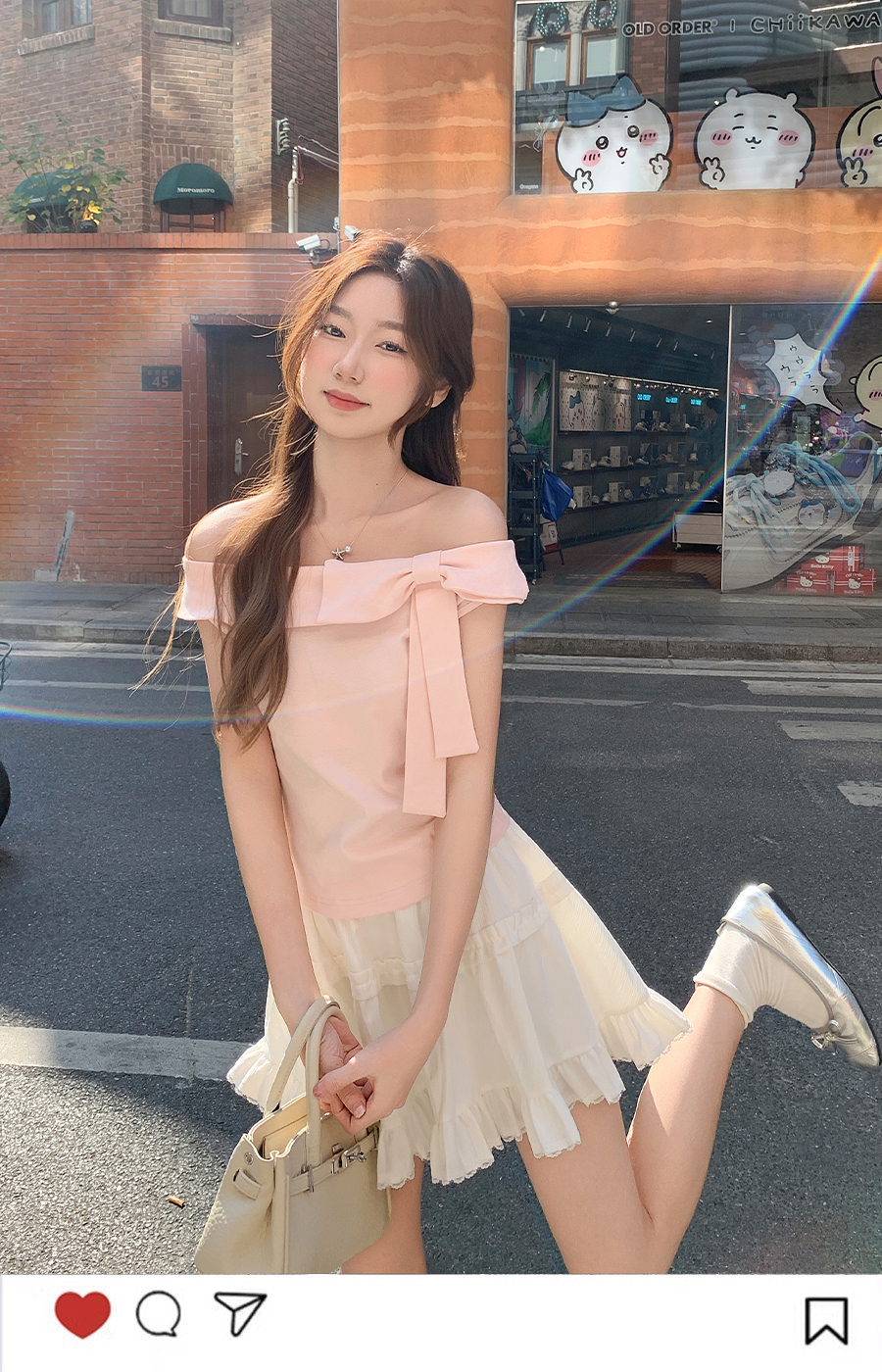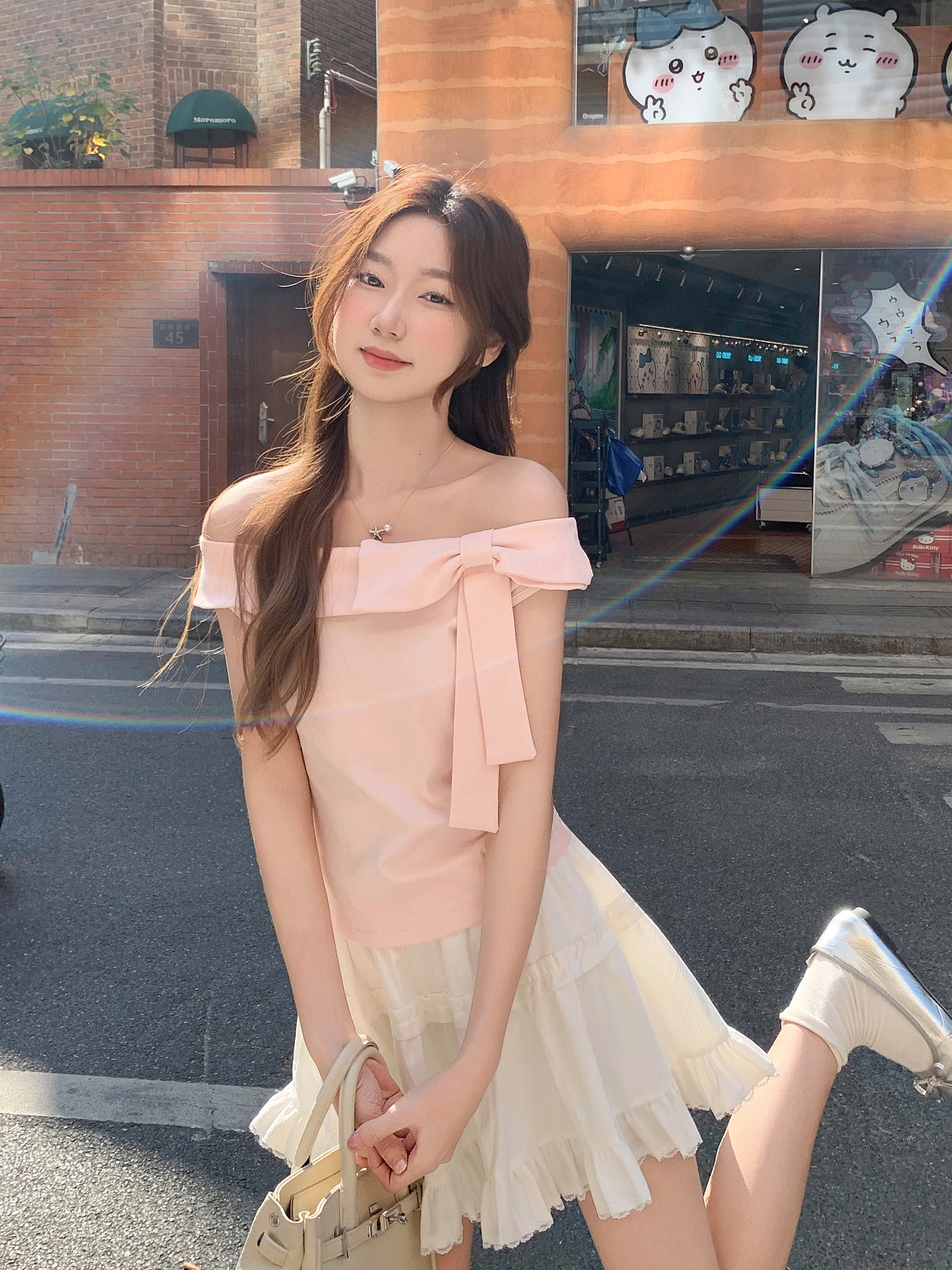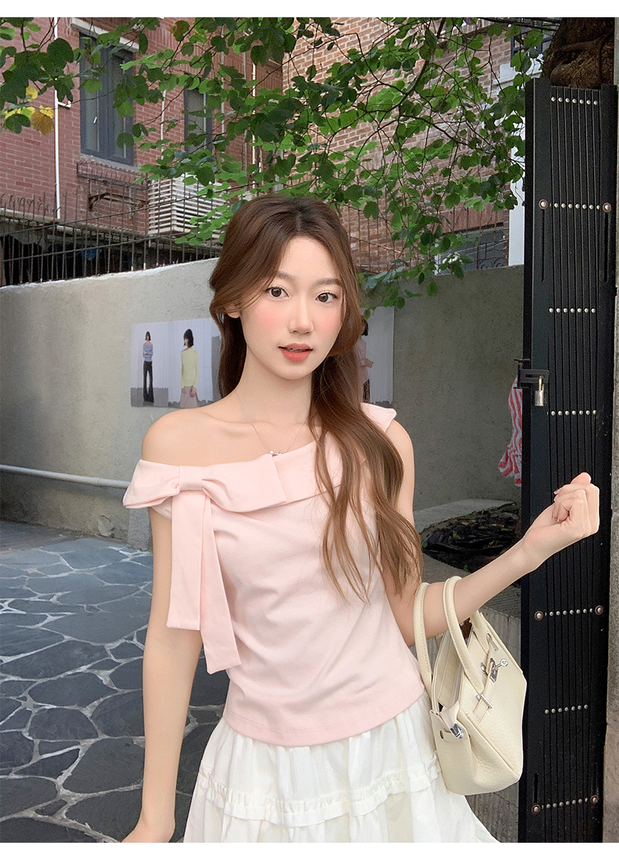 MY17644# 纯欲风蝴蝶结一字肩短袖t恤新款辣妹修身露肩短款上衣女裝貨源服裝批發