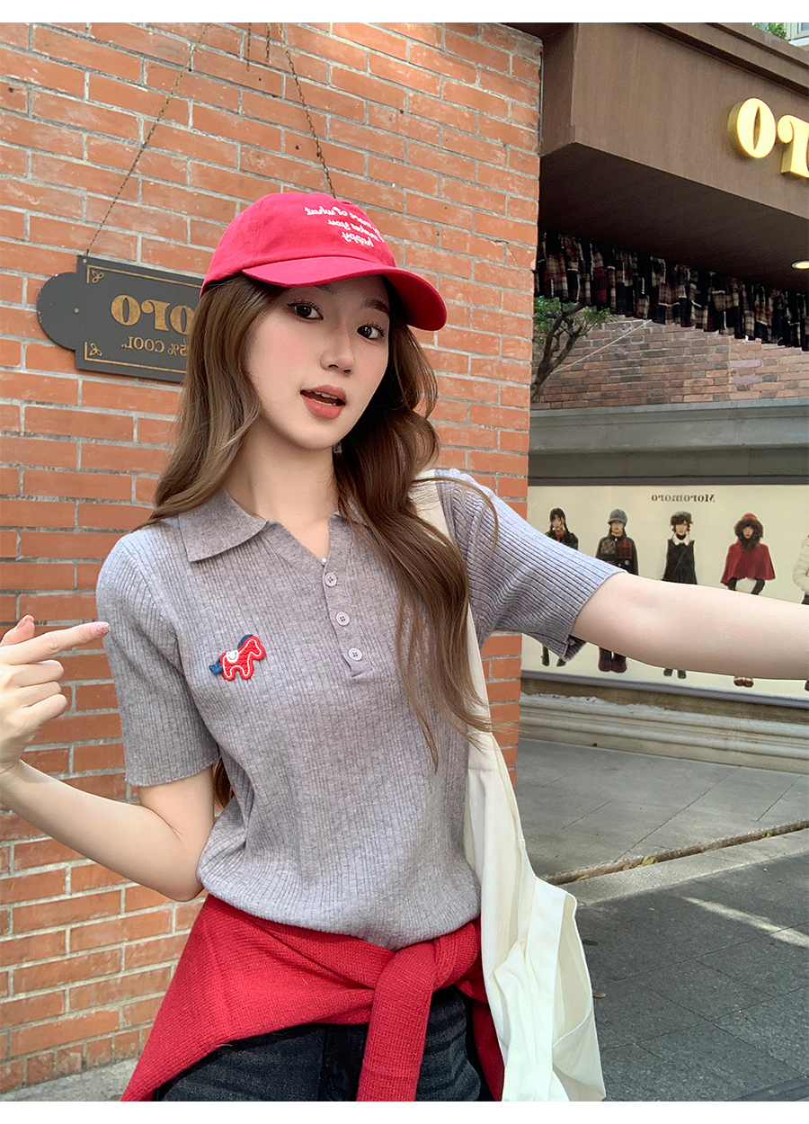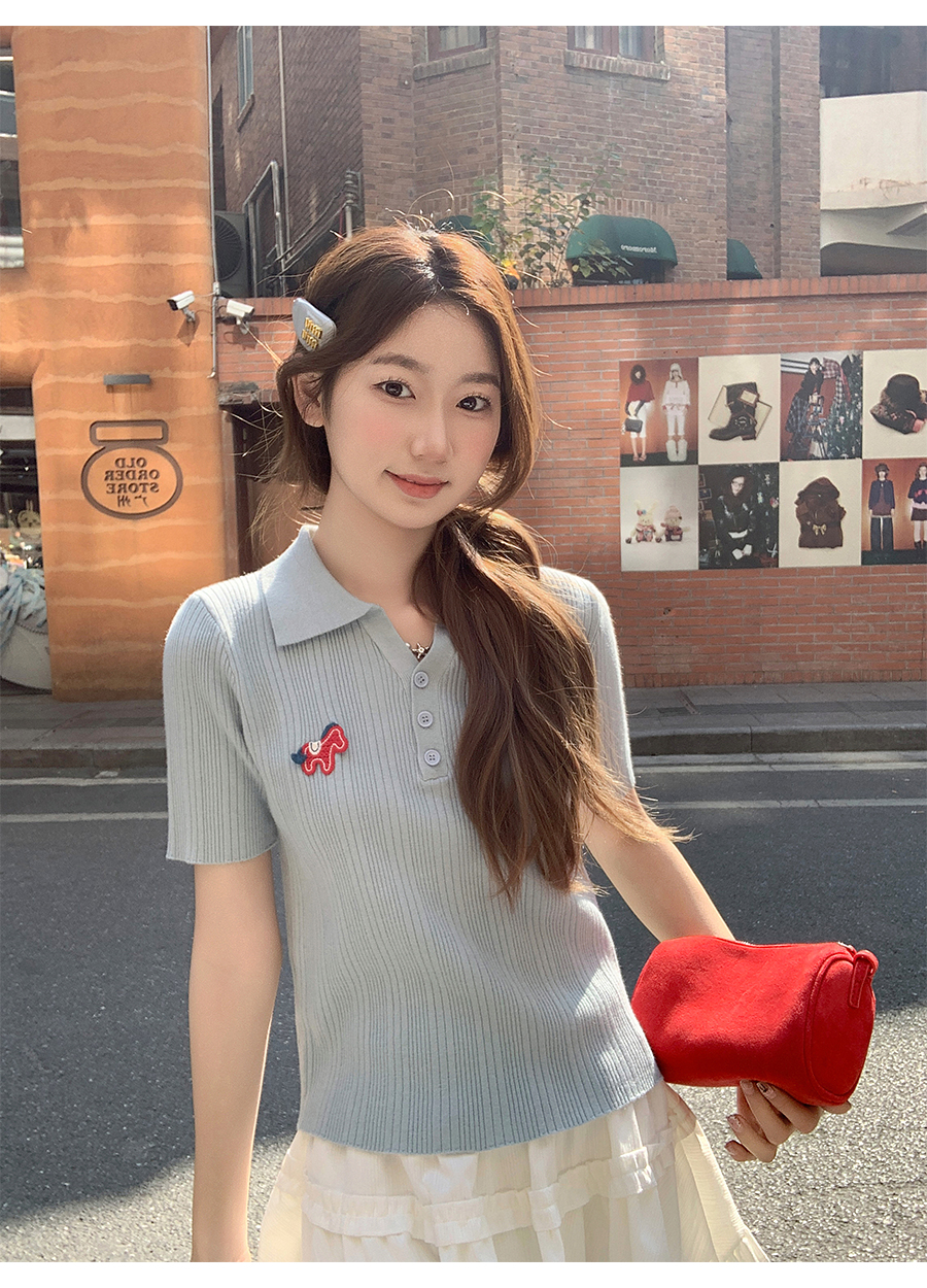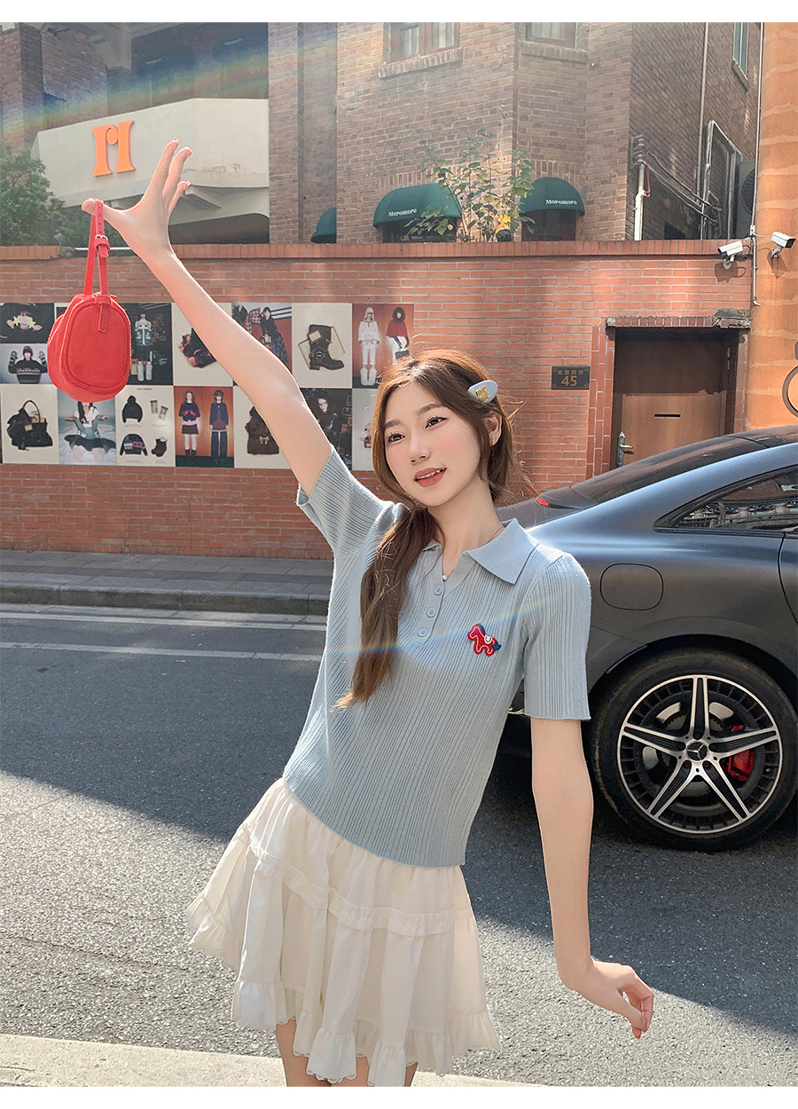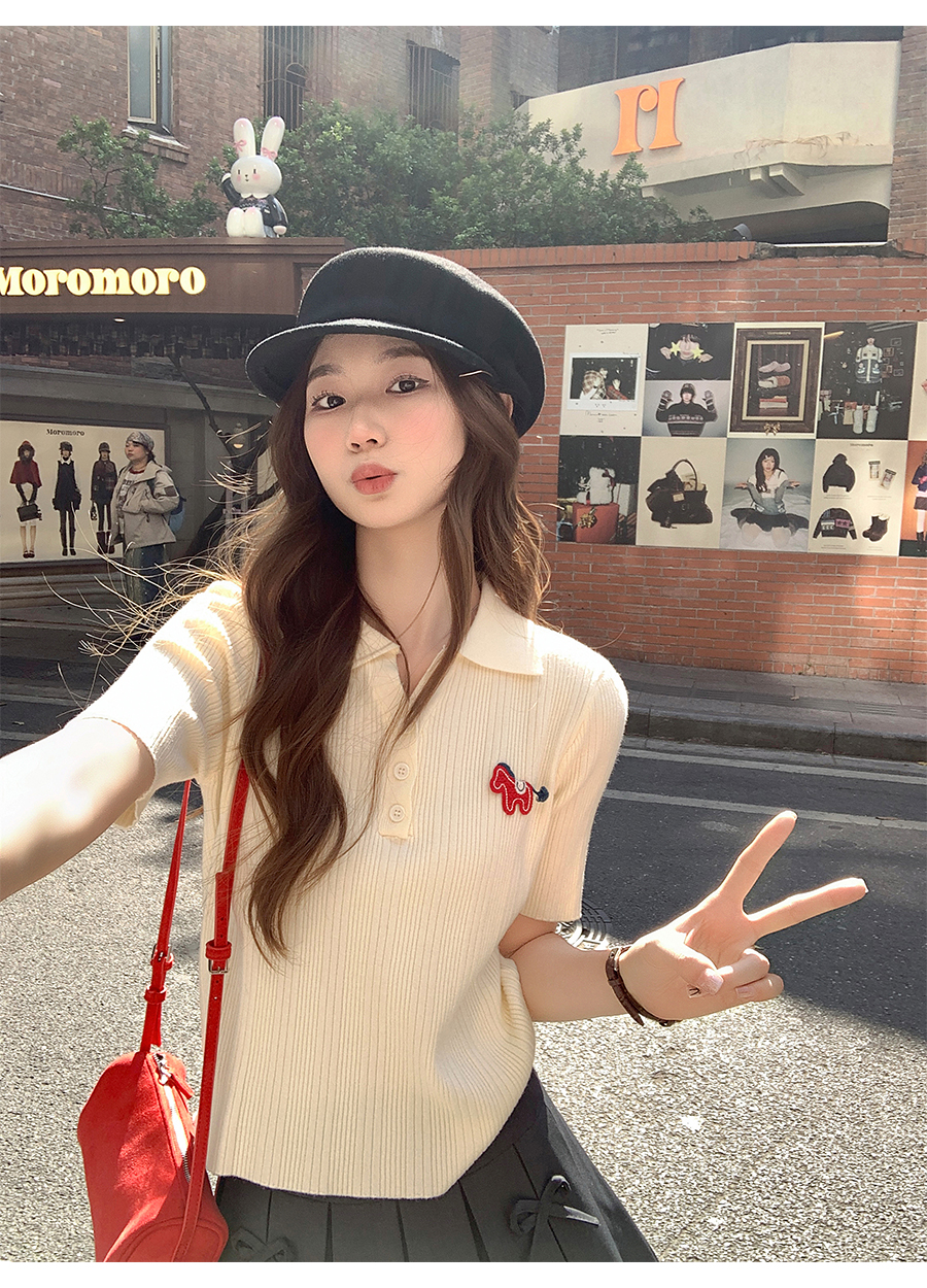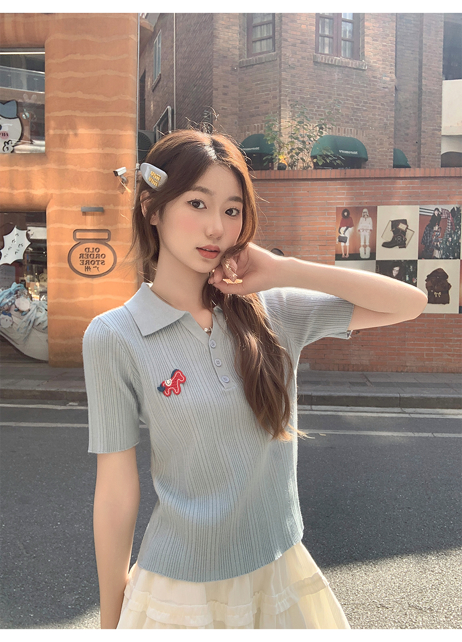 MY17646# 卡通刺绣POLO领纽扣短袖针织衫新款修身显瘦短款小上衣女裝貨源服裝批發