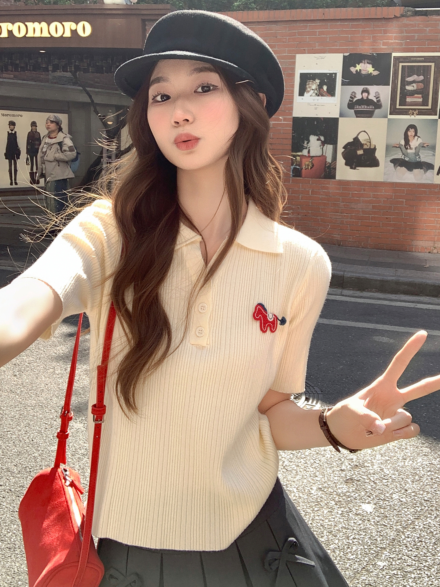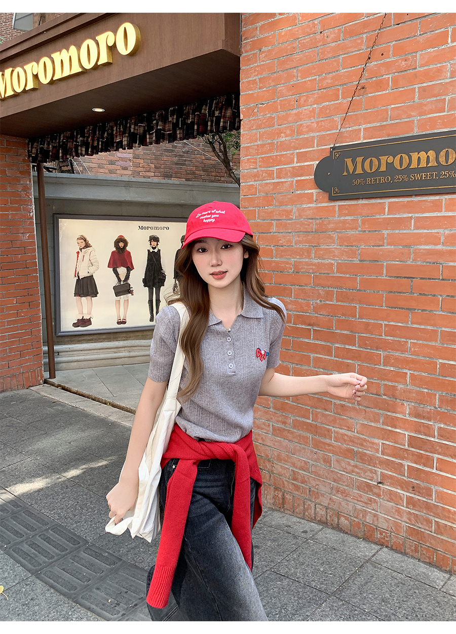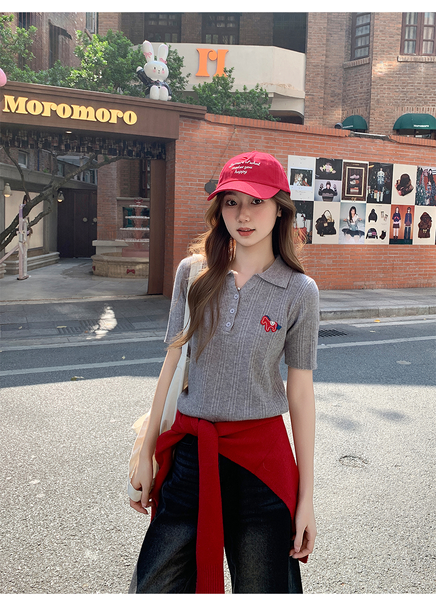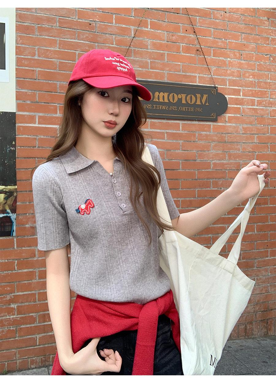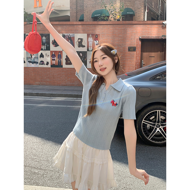 MY17646# 卡通刺绣POLO领纽扣短袖针织衫新款修身显瘦短款小上衣女裝貨源服裝批發
