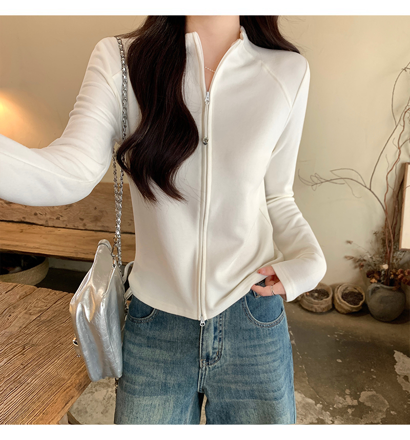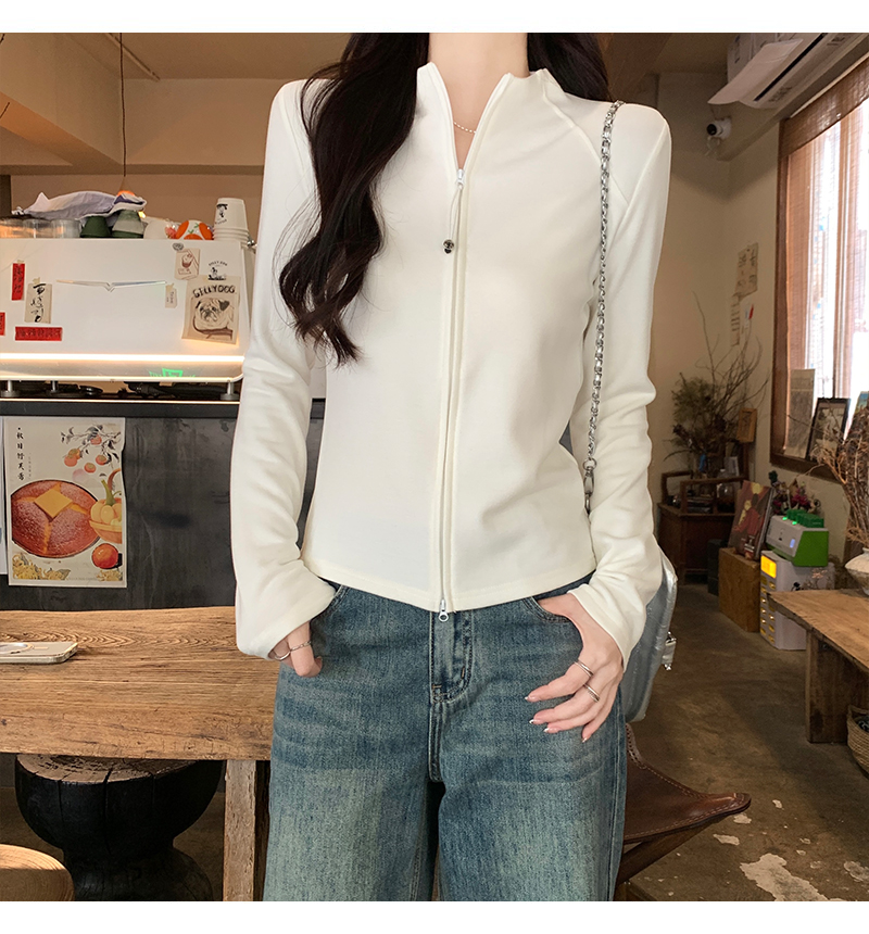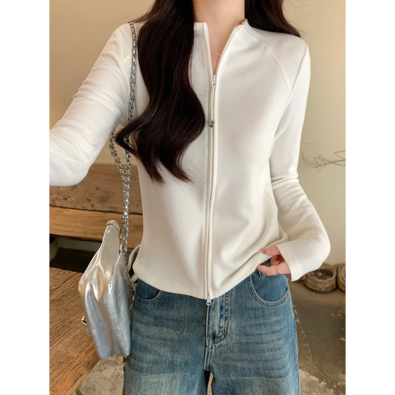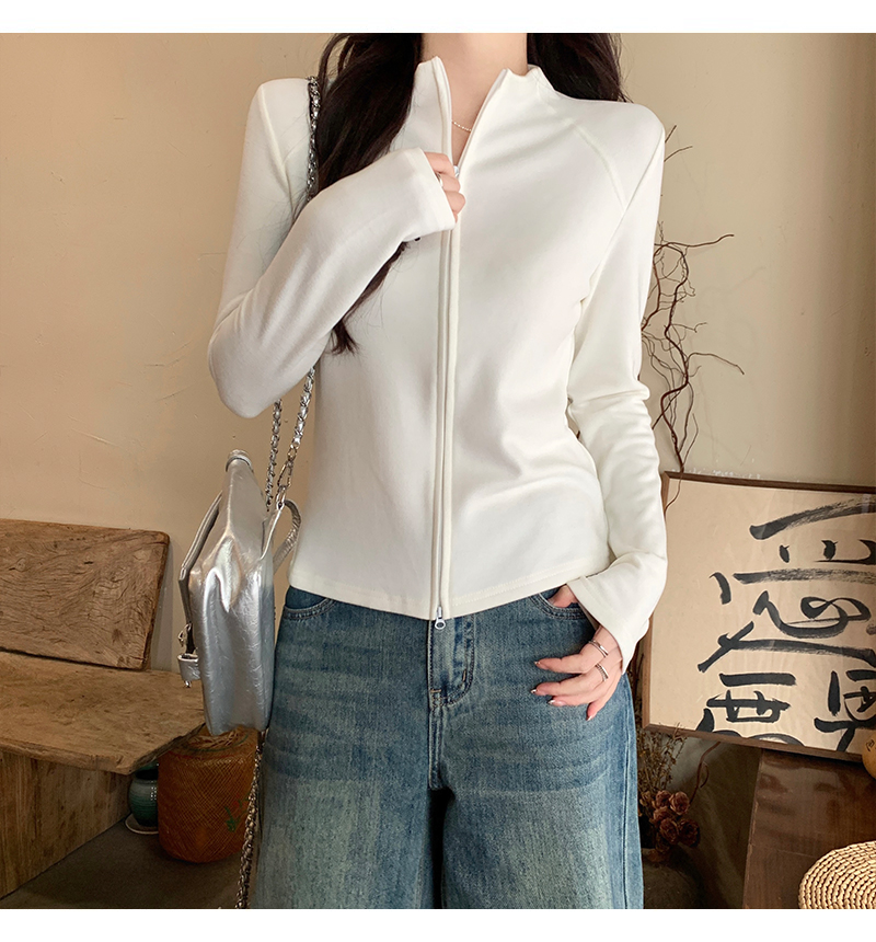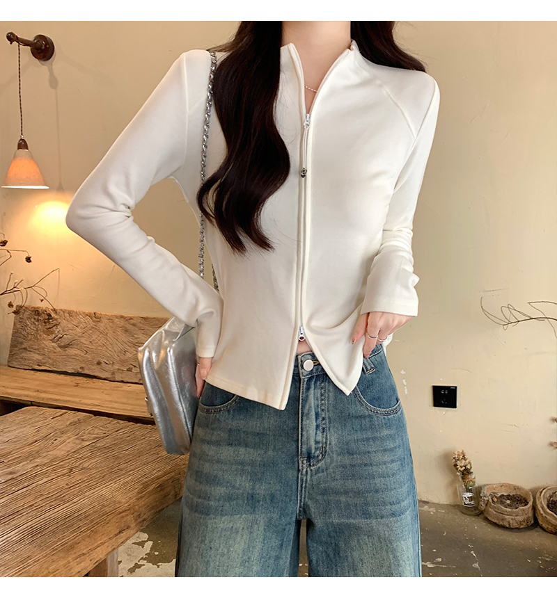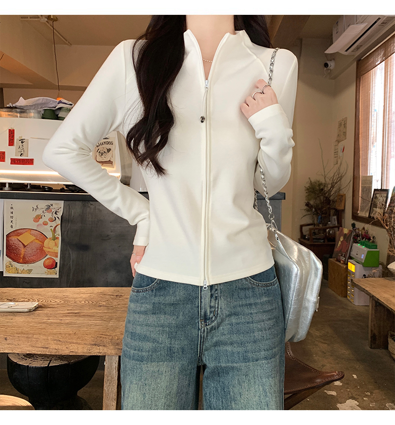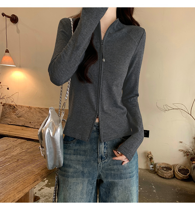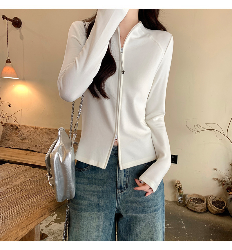 MY17649# 半高领双拉链德绒长袖开衫外套女冬季新款修身显瘦内搭打底衫上衣女裝貨源服裝批發