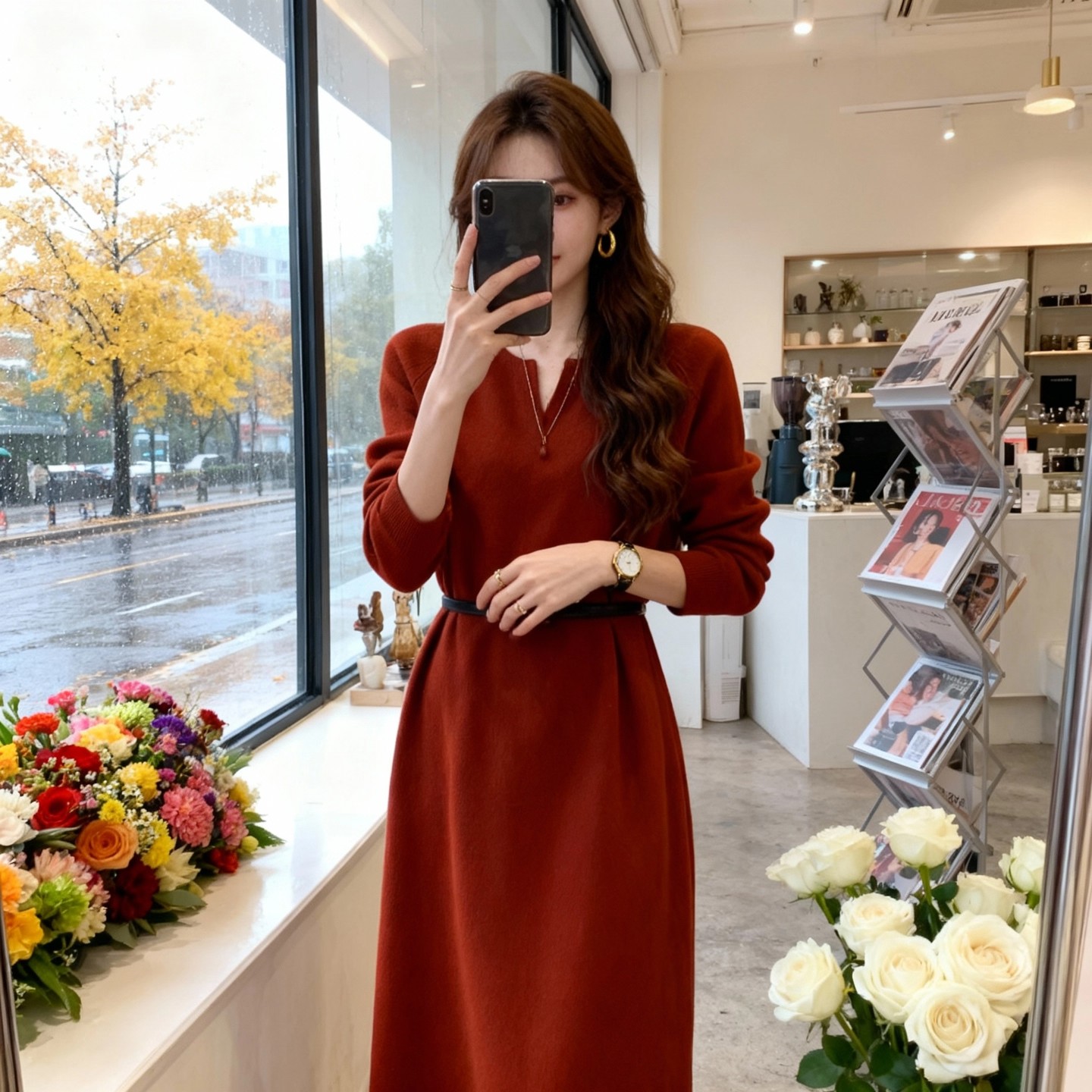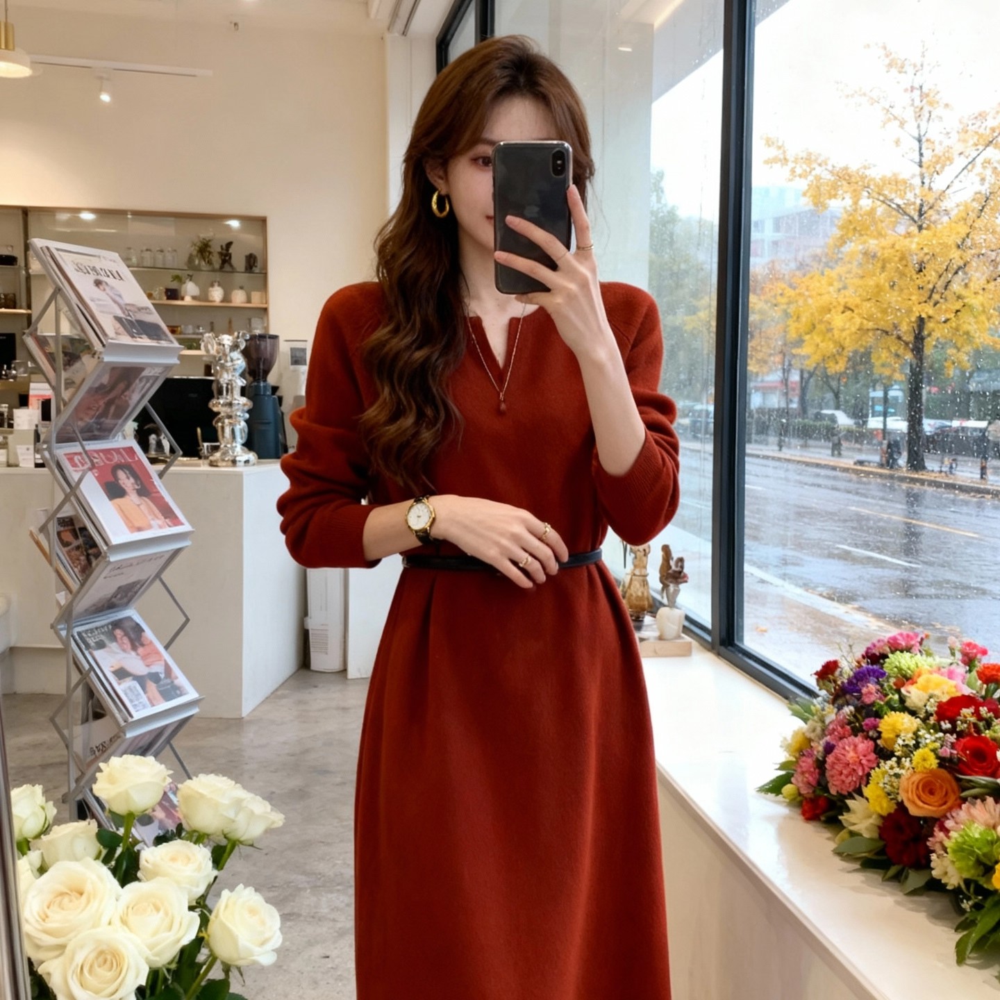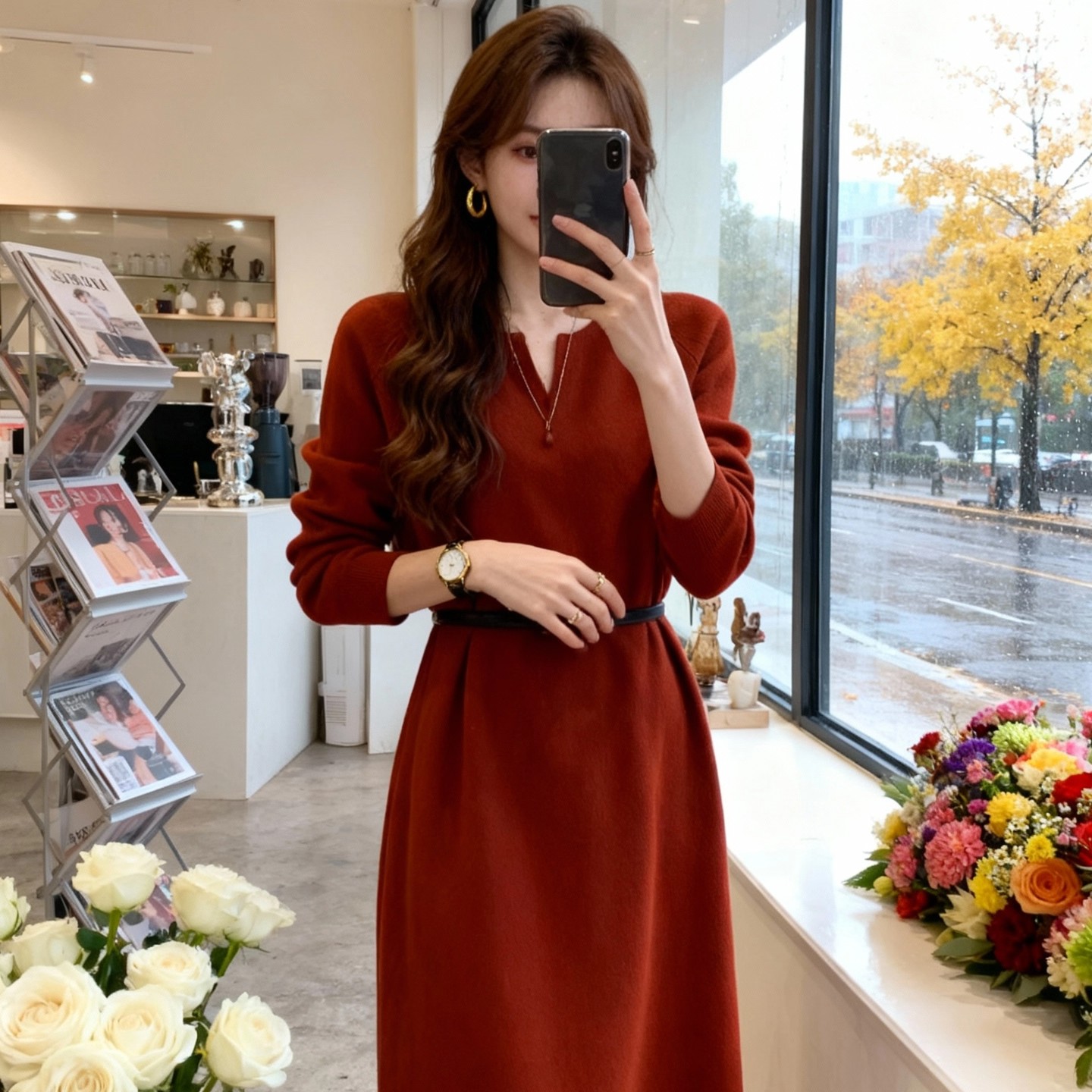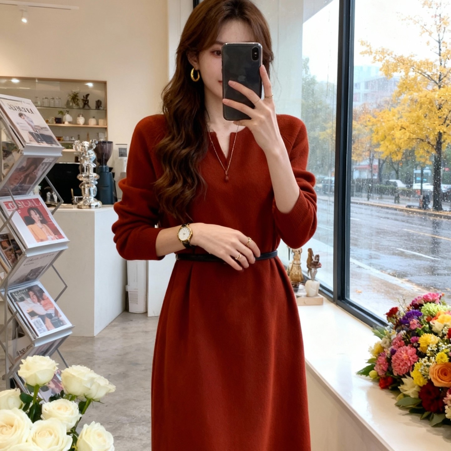 红色连衣裙+皮带