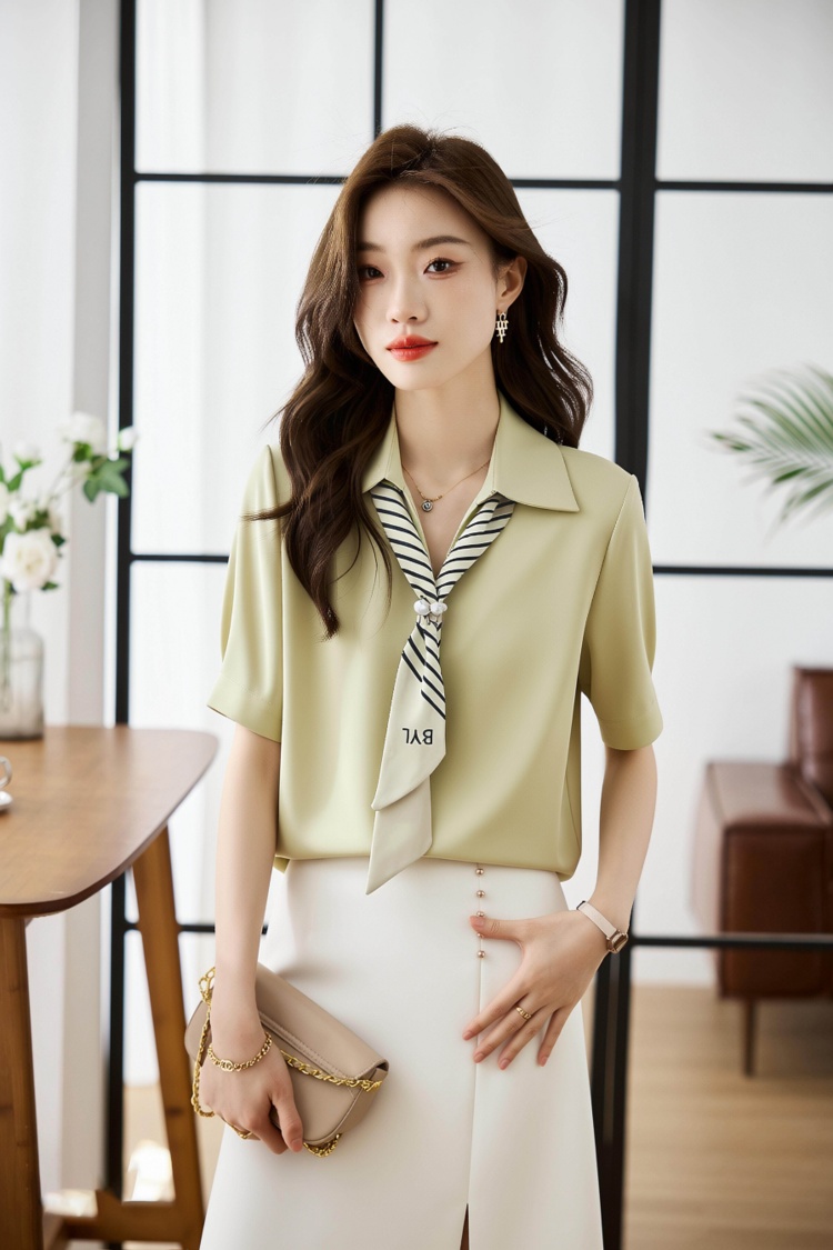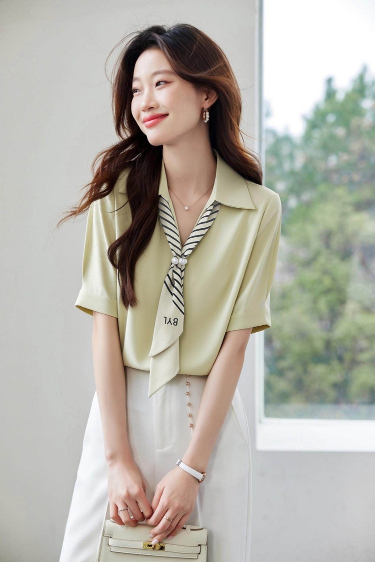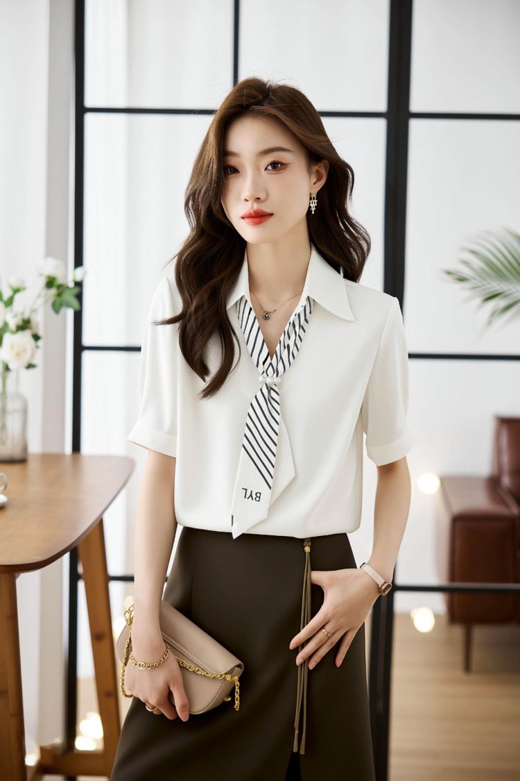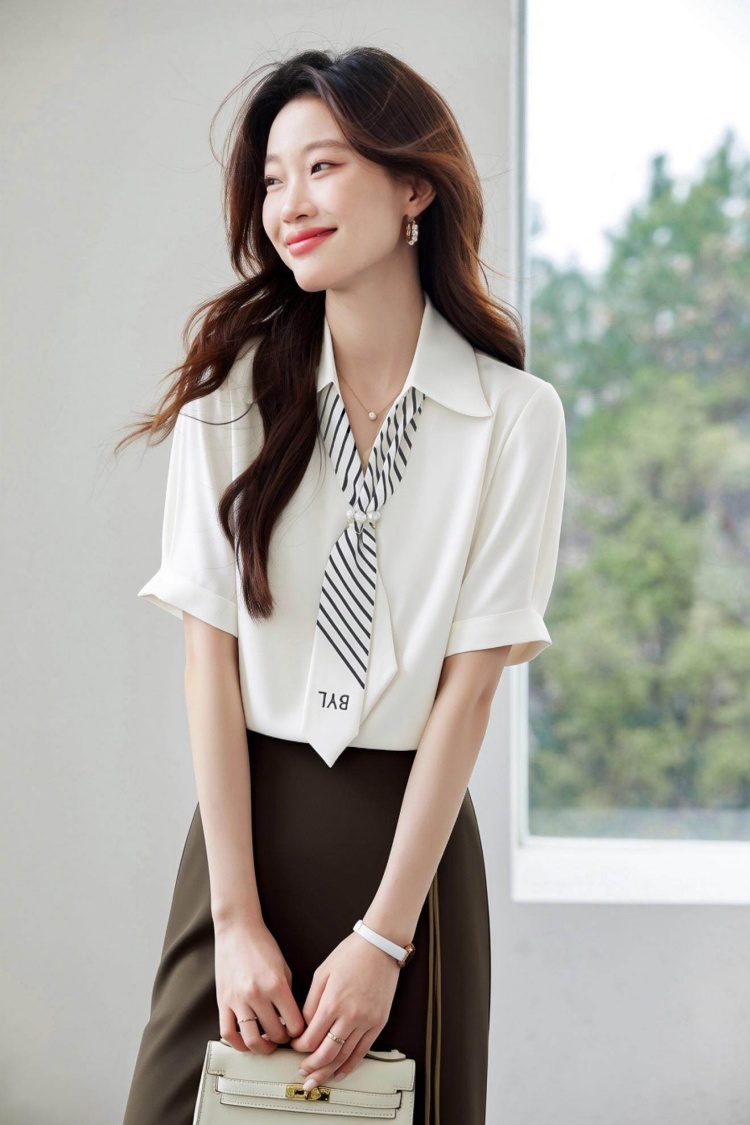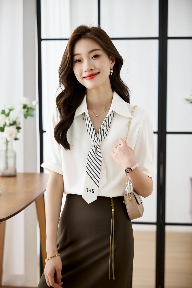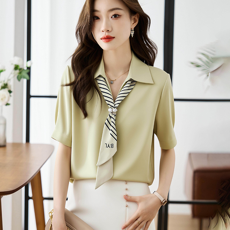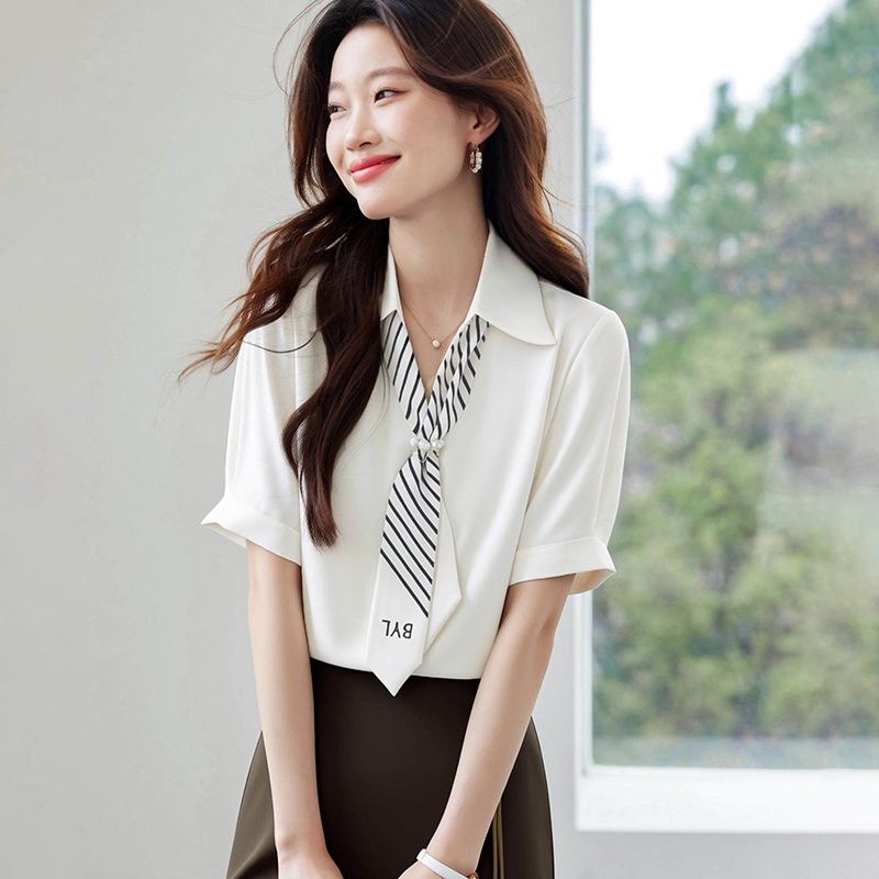 MY17678# 法式飘带短袖衬衫厅里厅气衣服新款缎面职业通勤上衣女裝貨源服裝批發