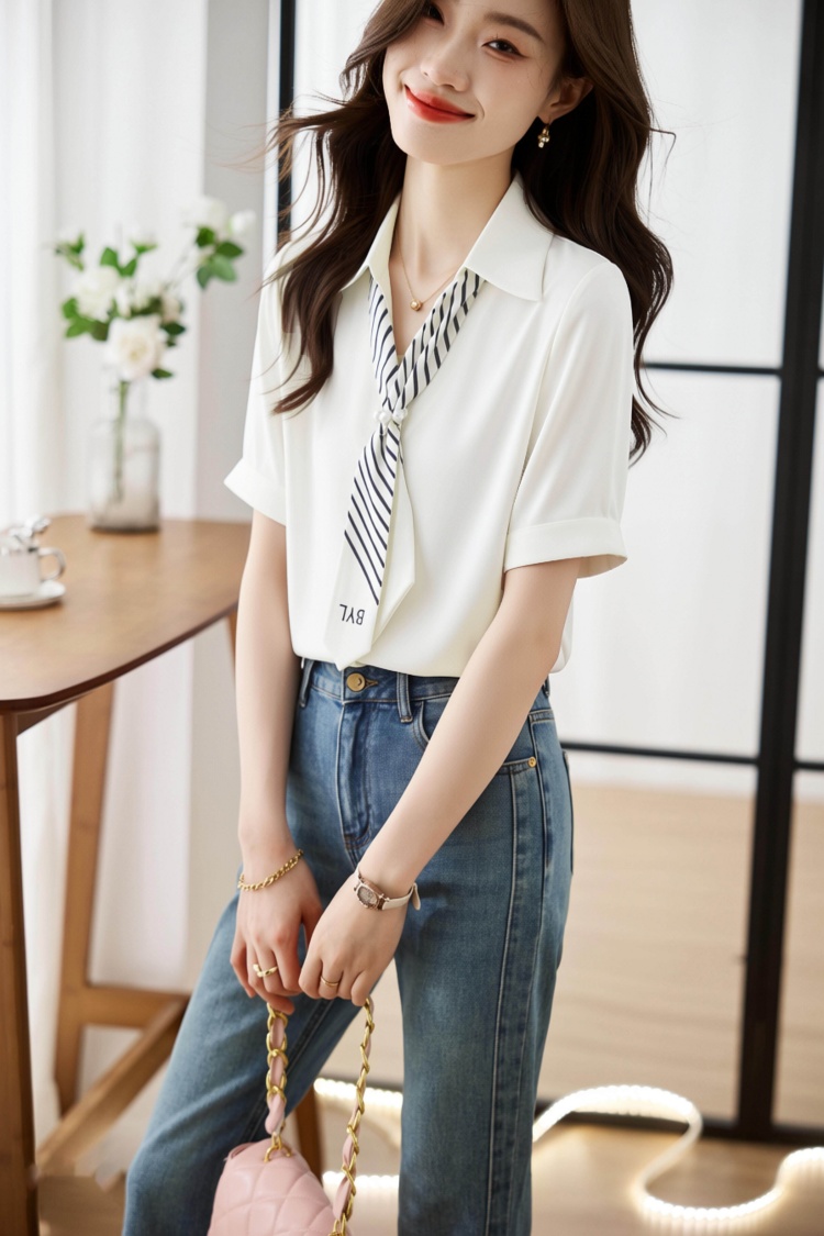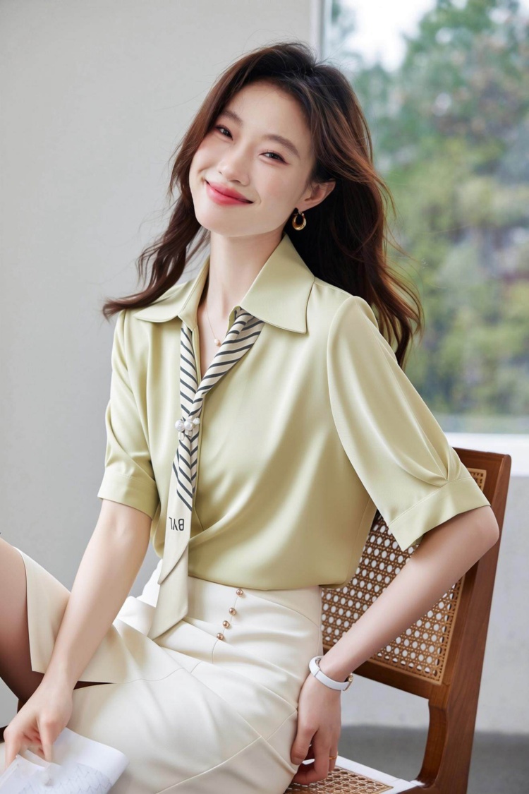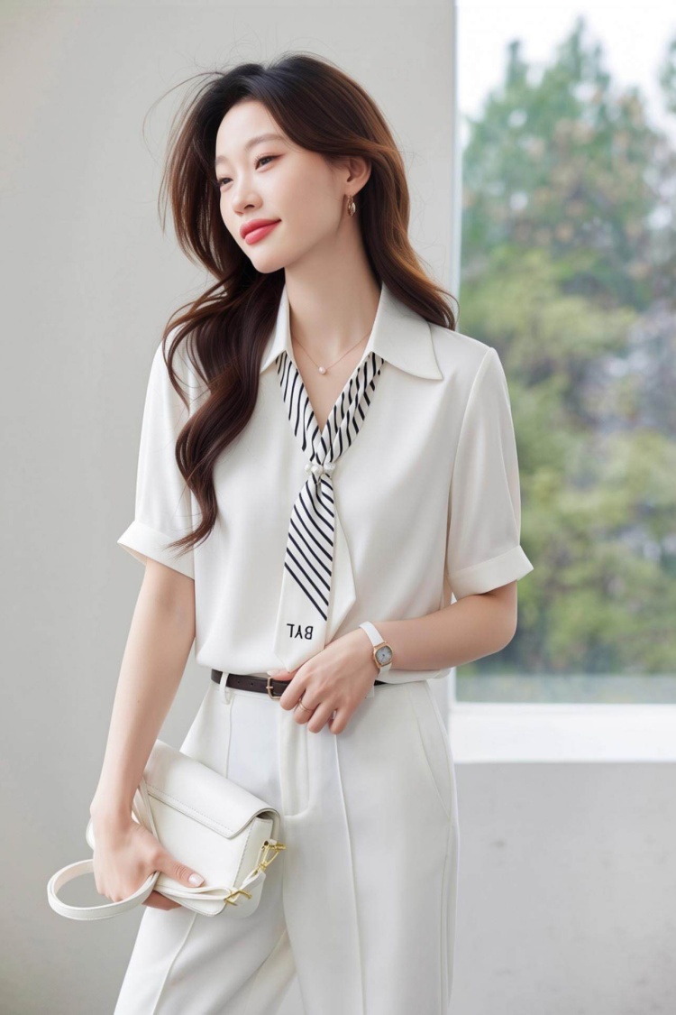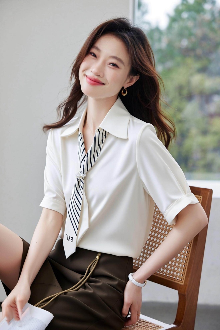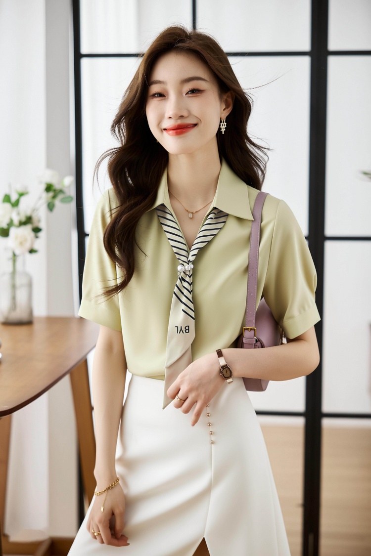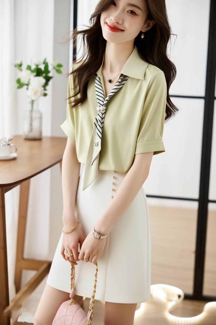 MY17678# 法式飘带短袖衬衫厅里厅气衣服新款缎面职业通勤上衣女裝貨源服裝批發