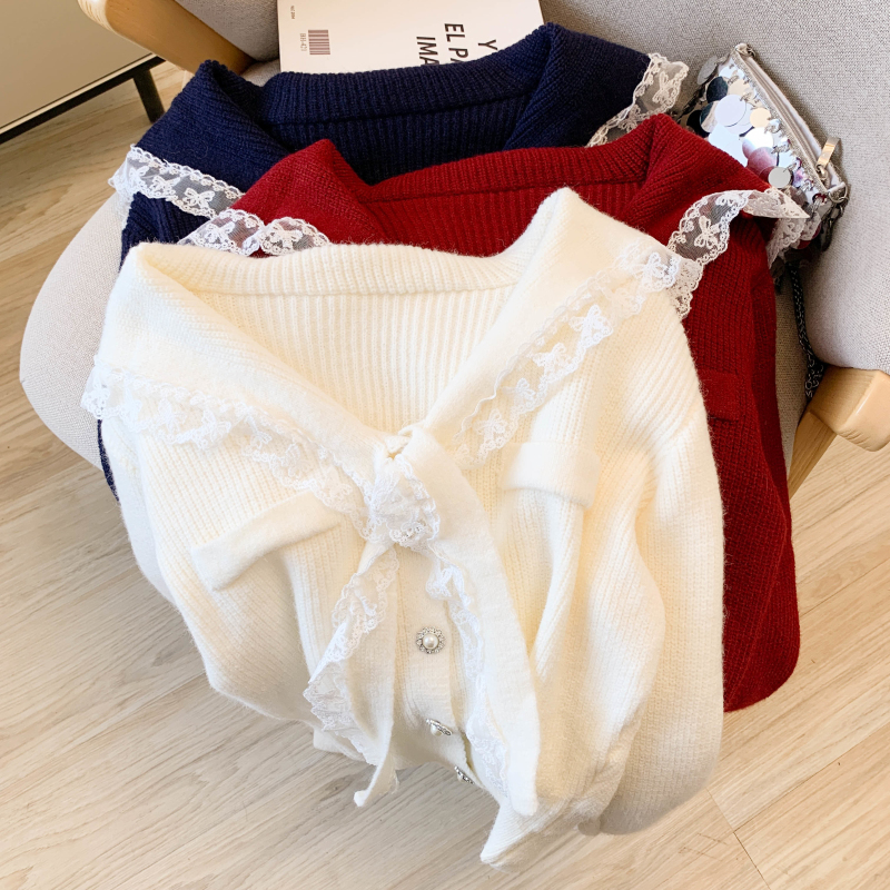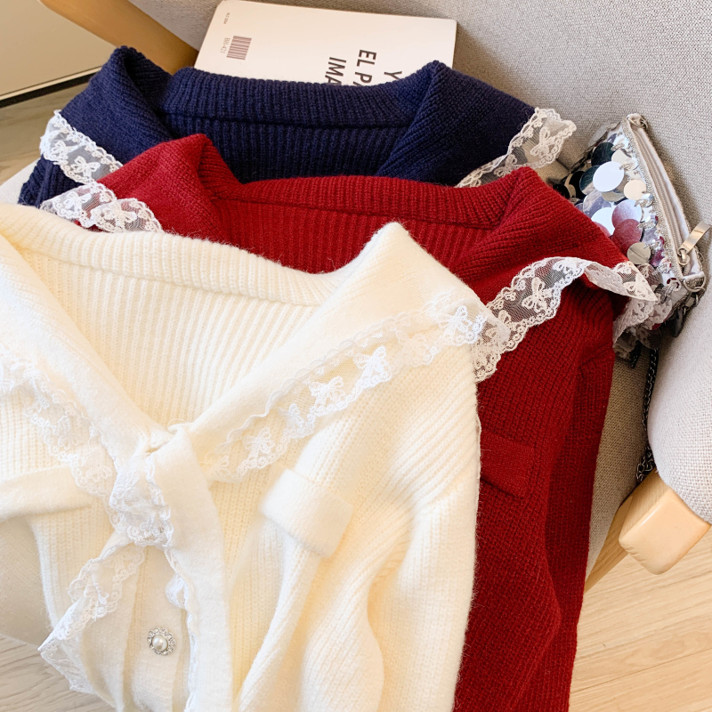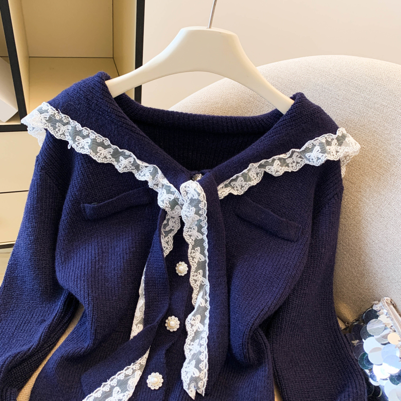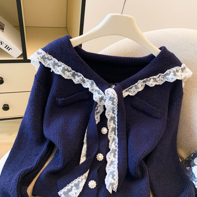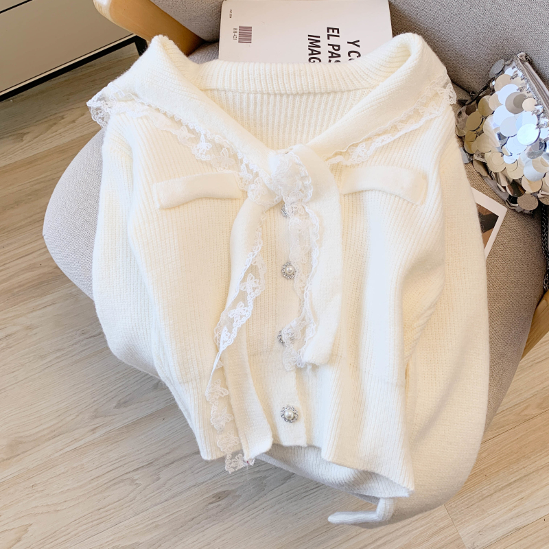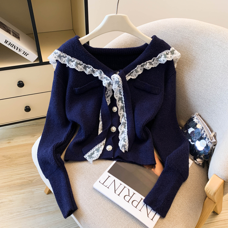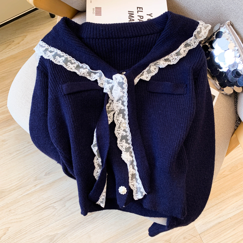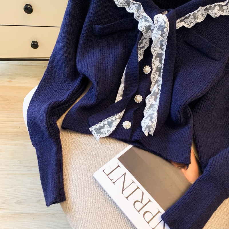 MY17683# 韩系学院风蕾丝蝴花边蝶结海军上衣女纯色单排扣针织开衫女裝貨源服裝批發