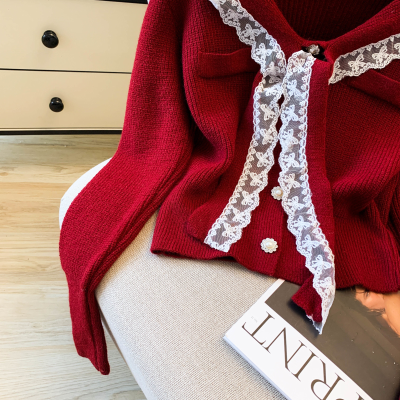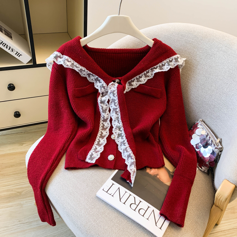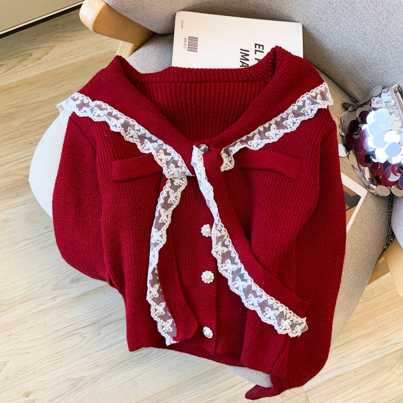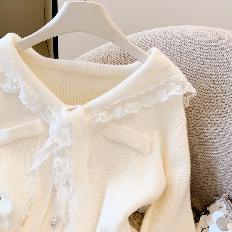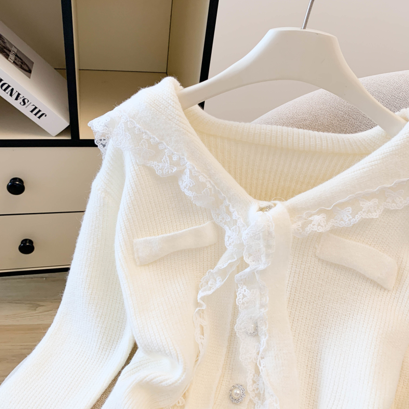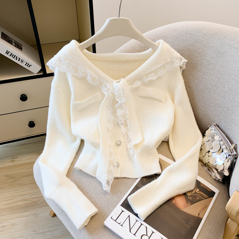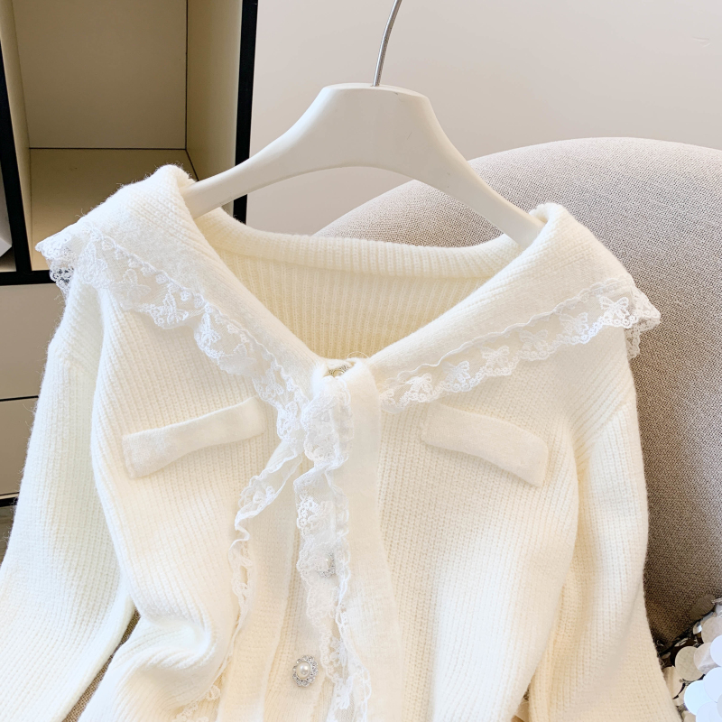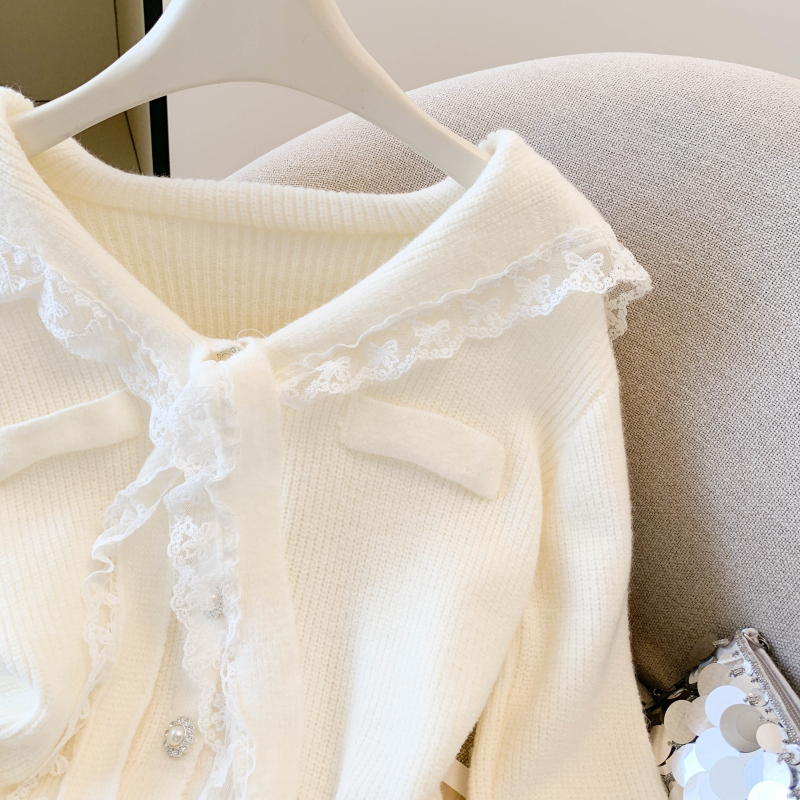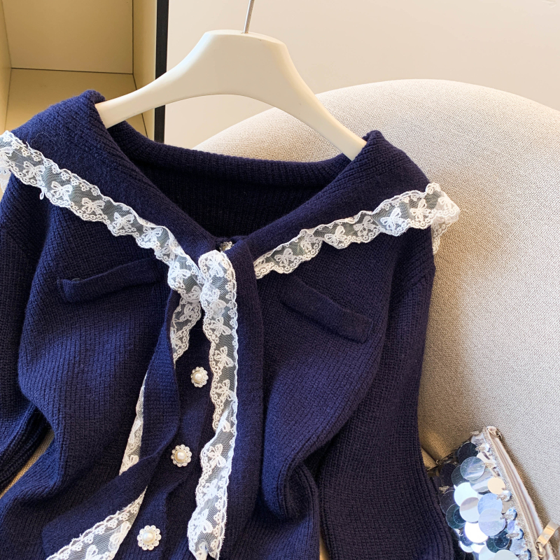 MY17683# 韩系学院风蕾丝蝴花边蝶结海军上衣女纯色单排扣针织开衫女裝貨源服裝批發