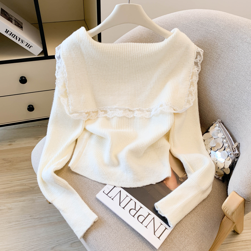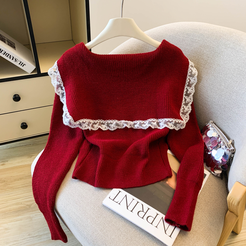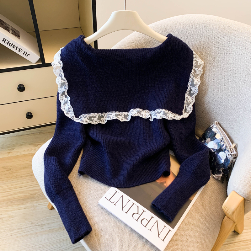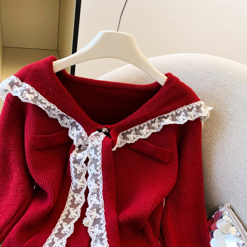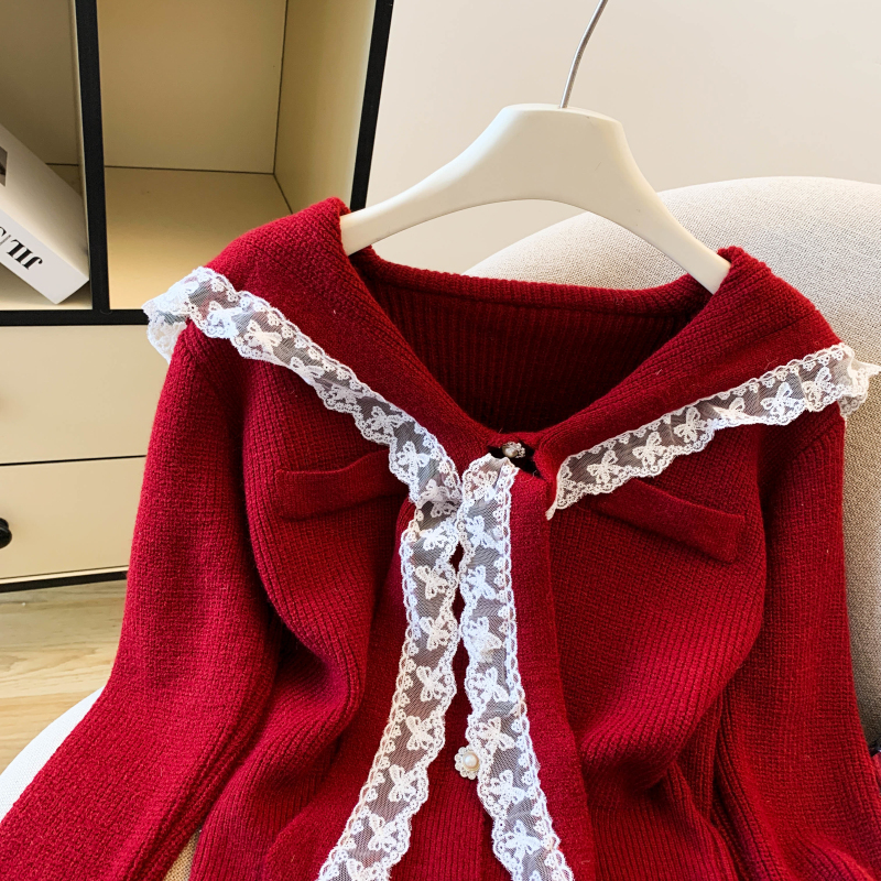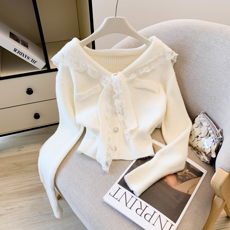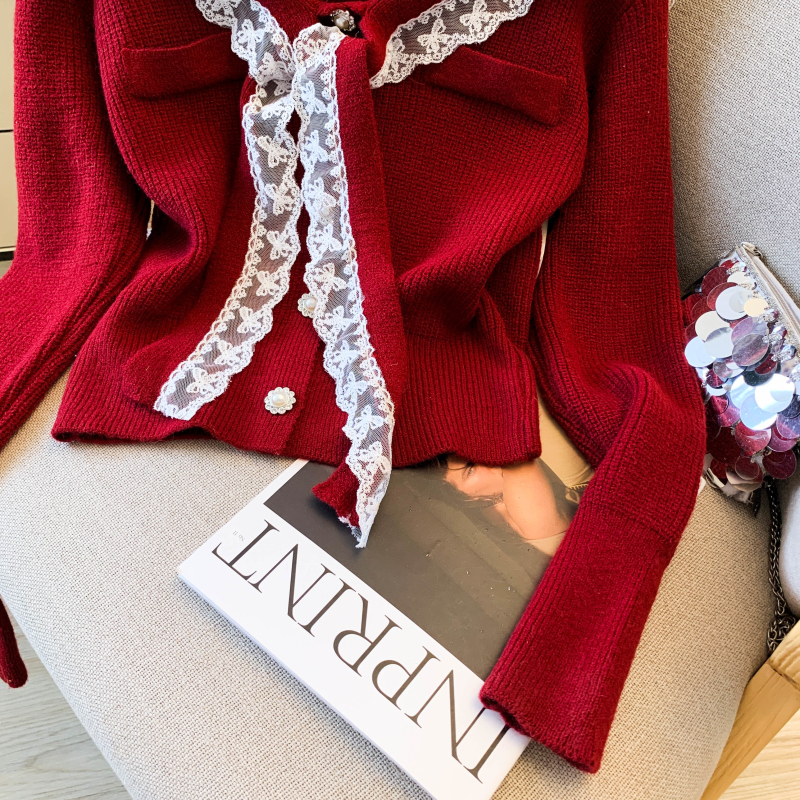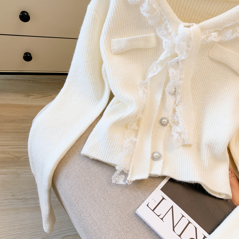 MY17683# 韩系学院风蕾丝蝴花边蝶结海军上衣女纯色单排扣针织开衫女裝貨源服裝批發
