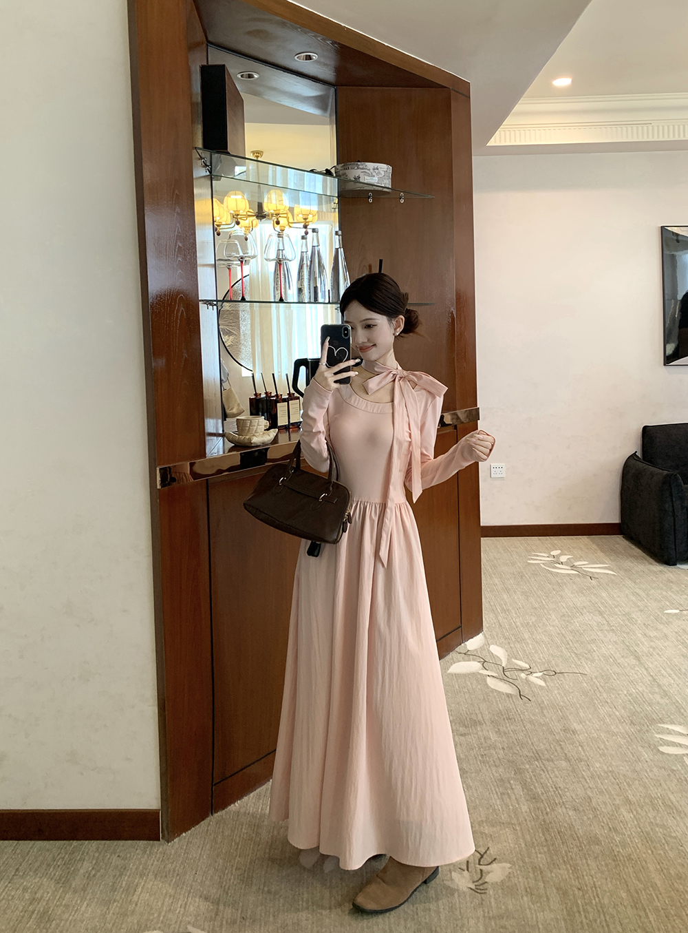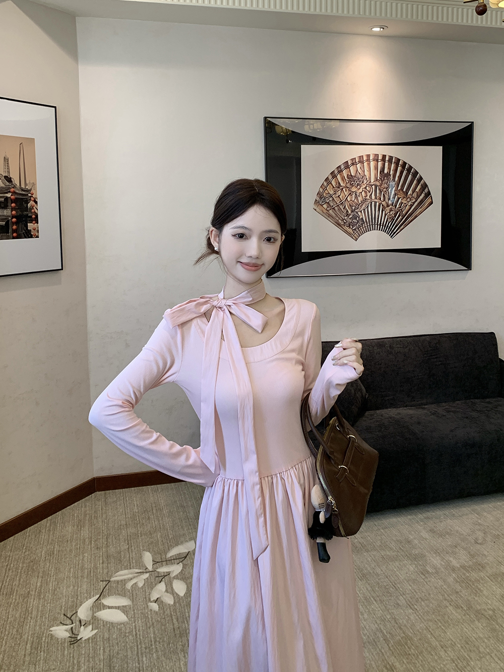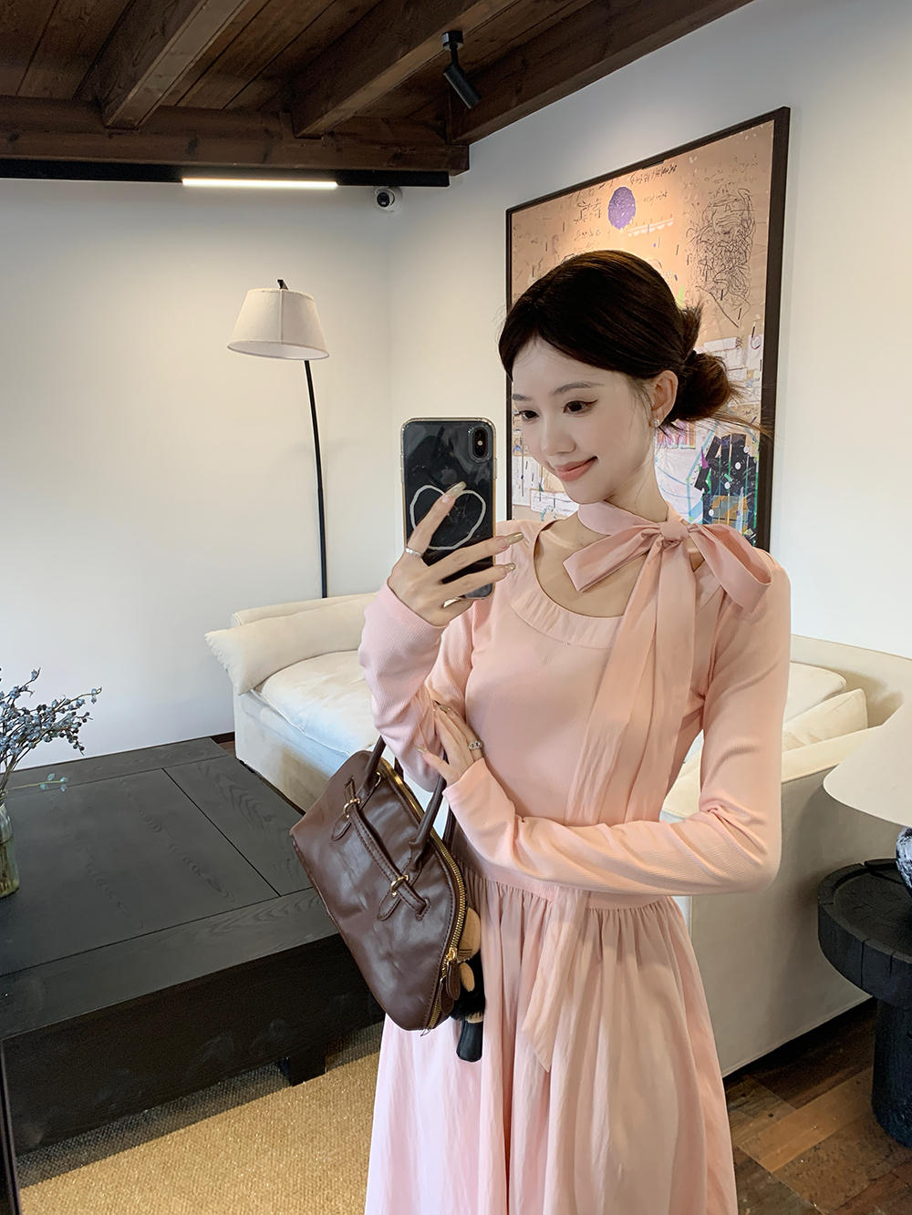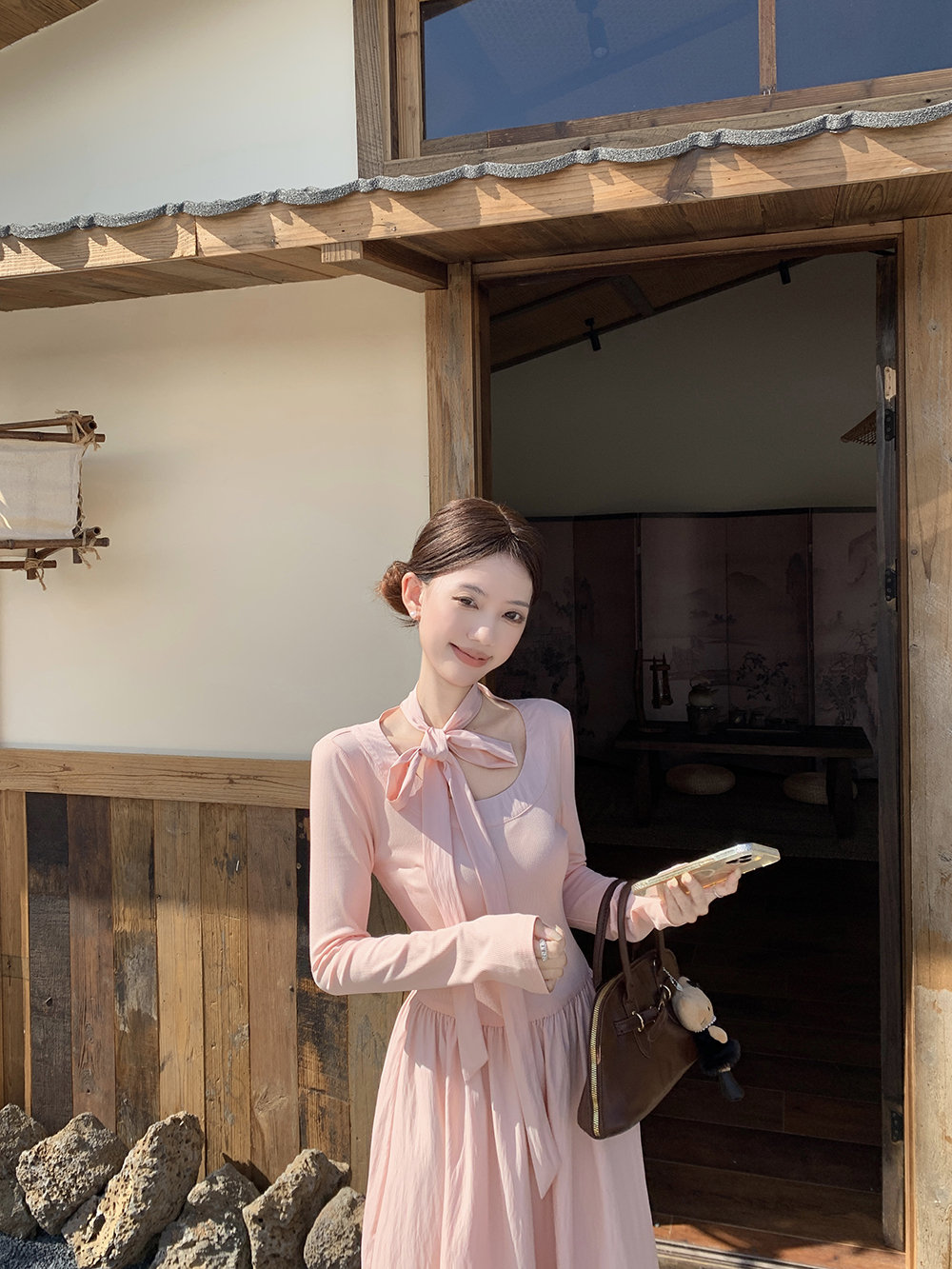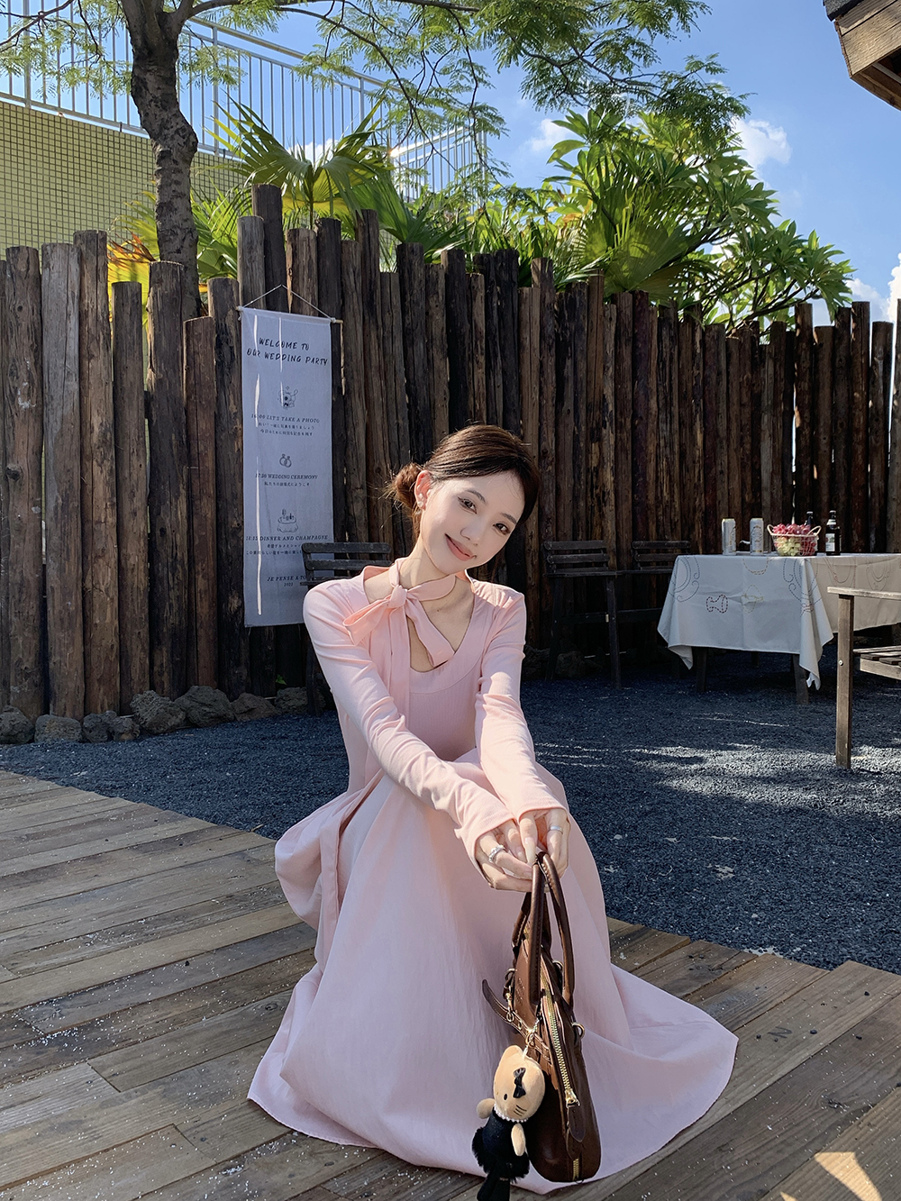 MY17684# 富家千金小香风法式蝴蝶结系带长袖粉A字裙温柔风长裙女裝貨源服裝批發
