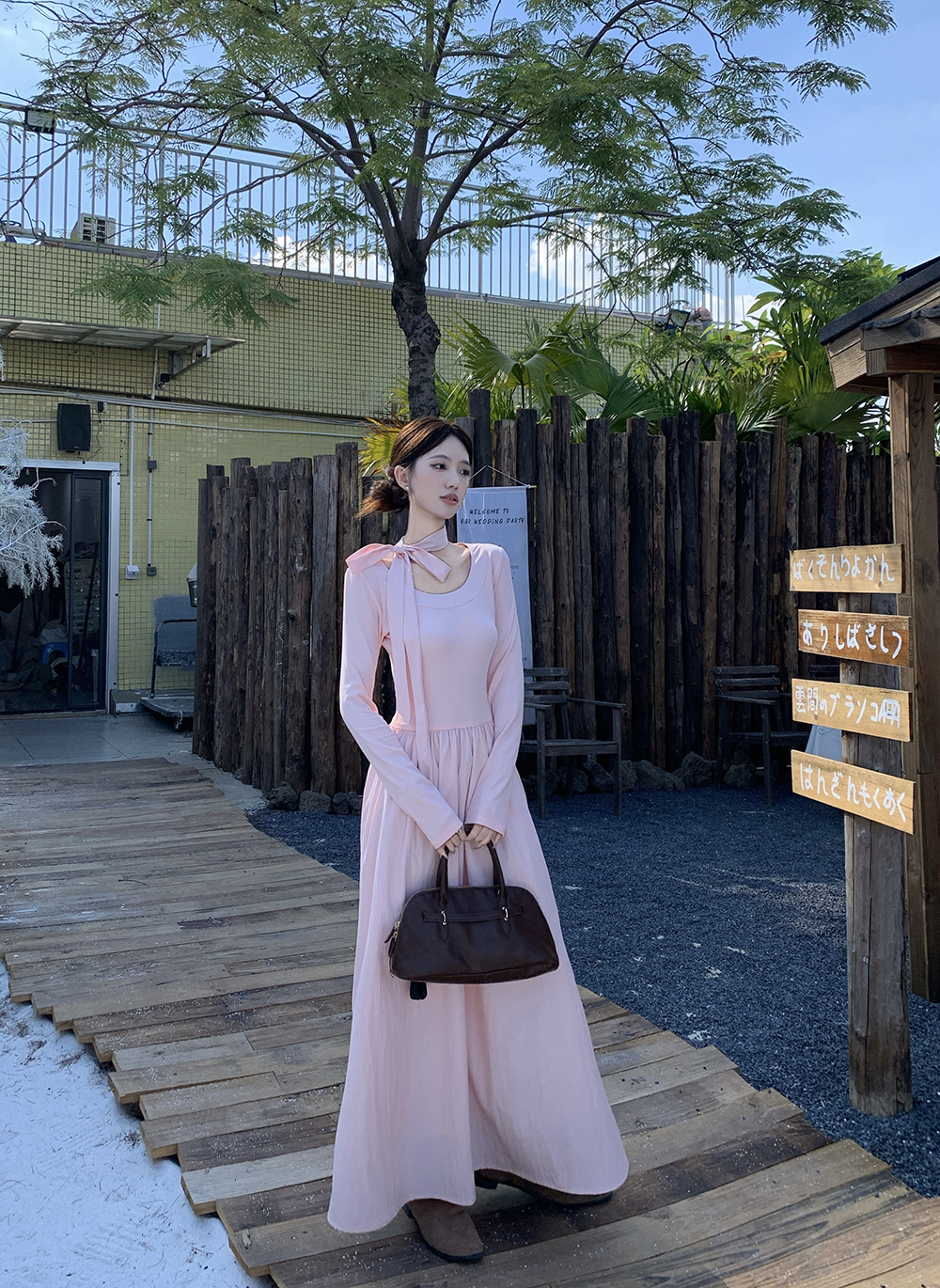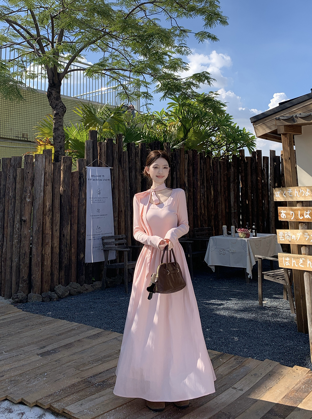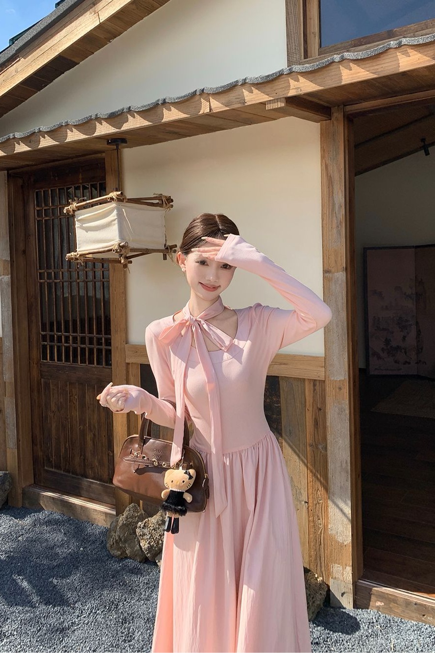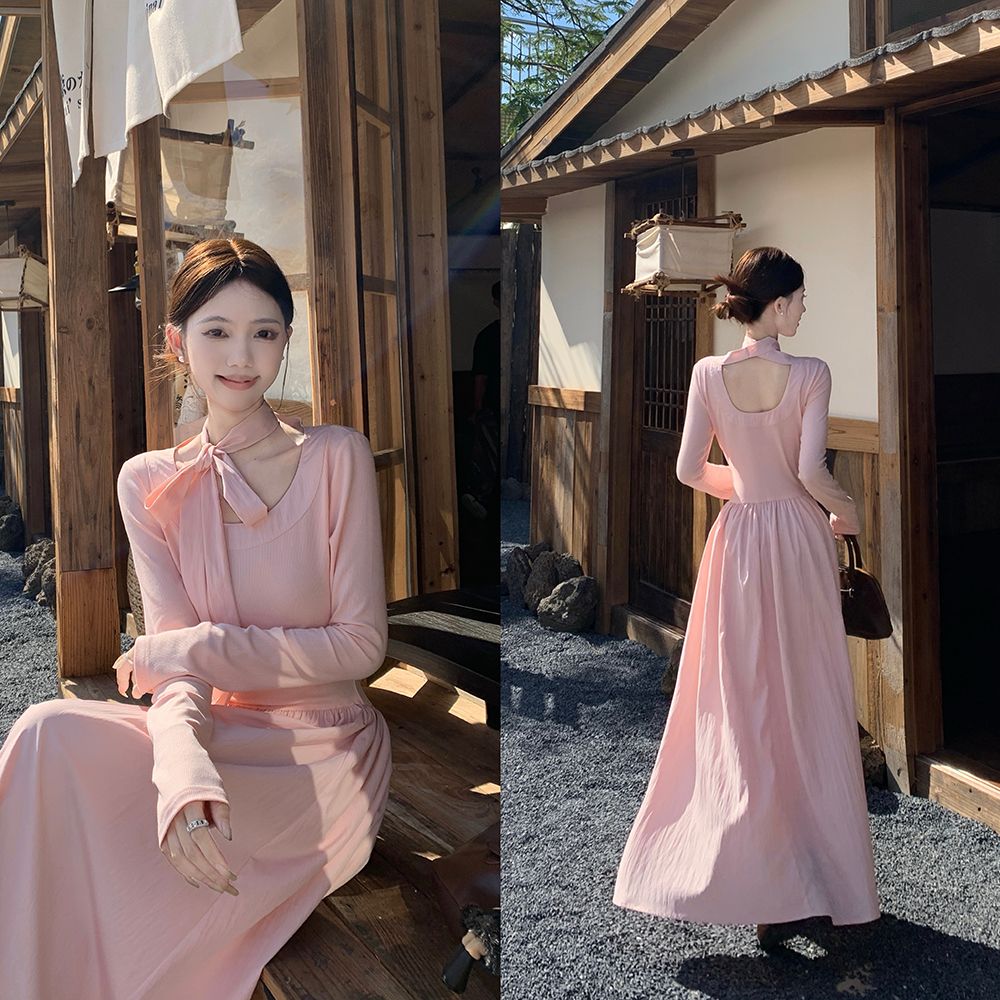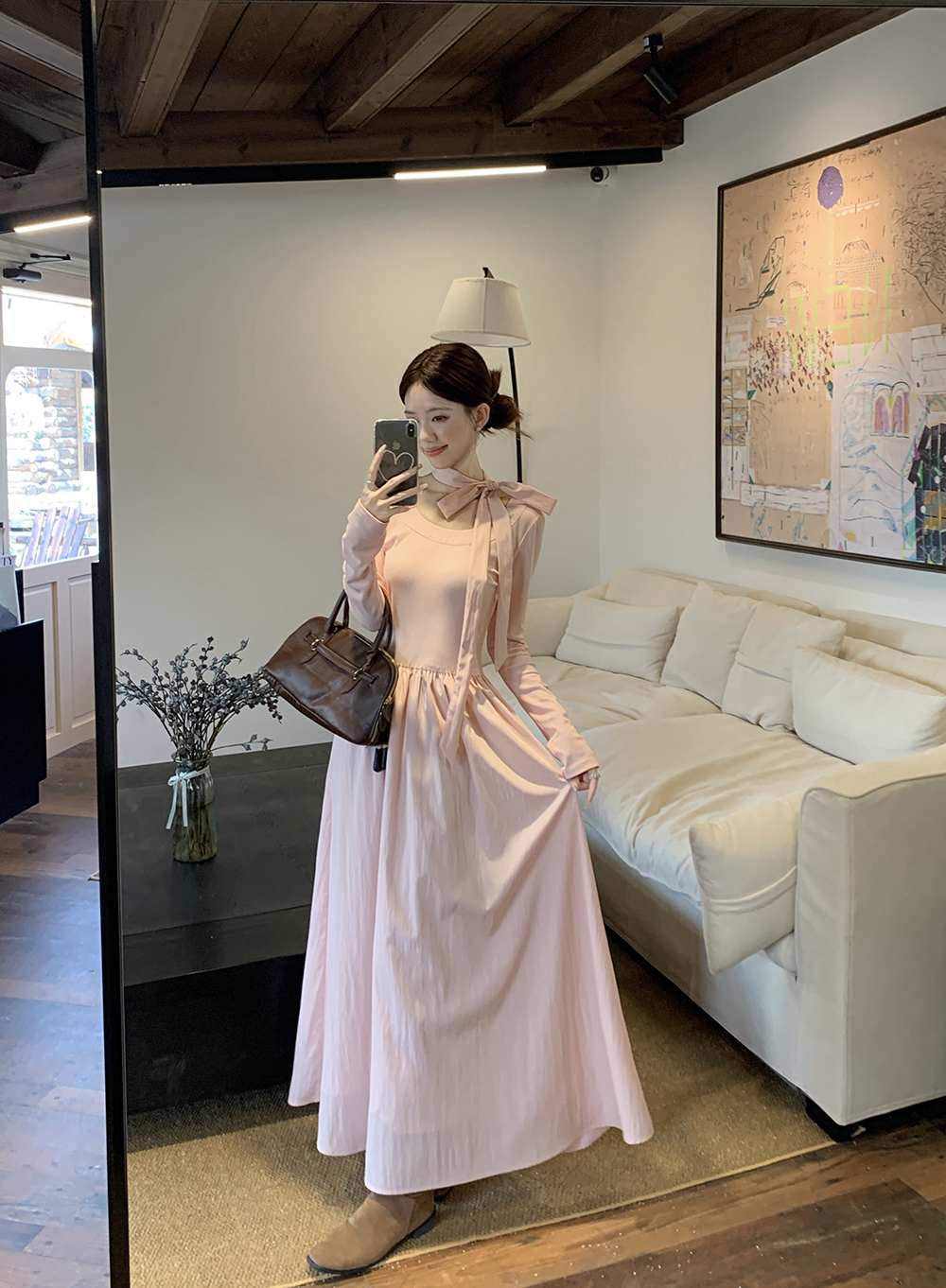MY17684# 富家千金小香风法式蝴蝶结系带长袖粉A字裙温柔风长裙女裝貨源服裝批發