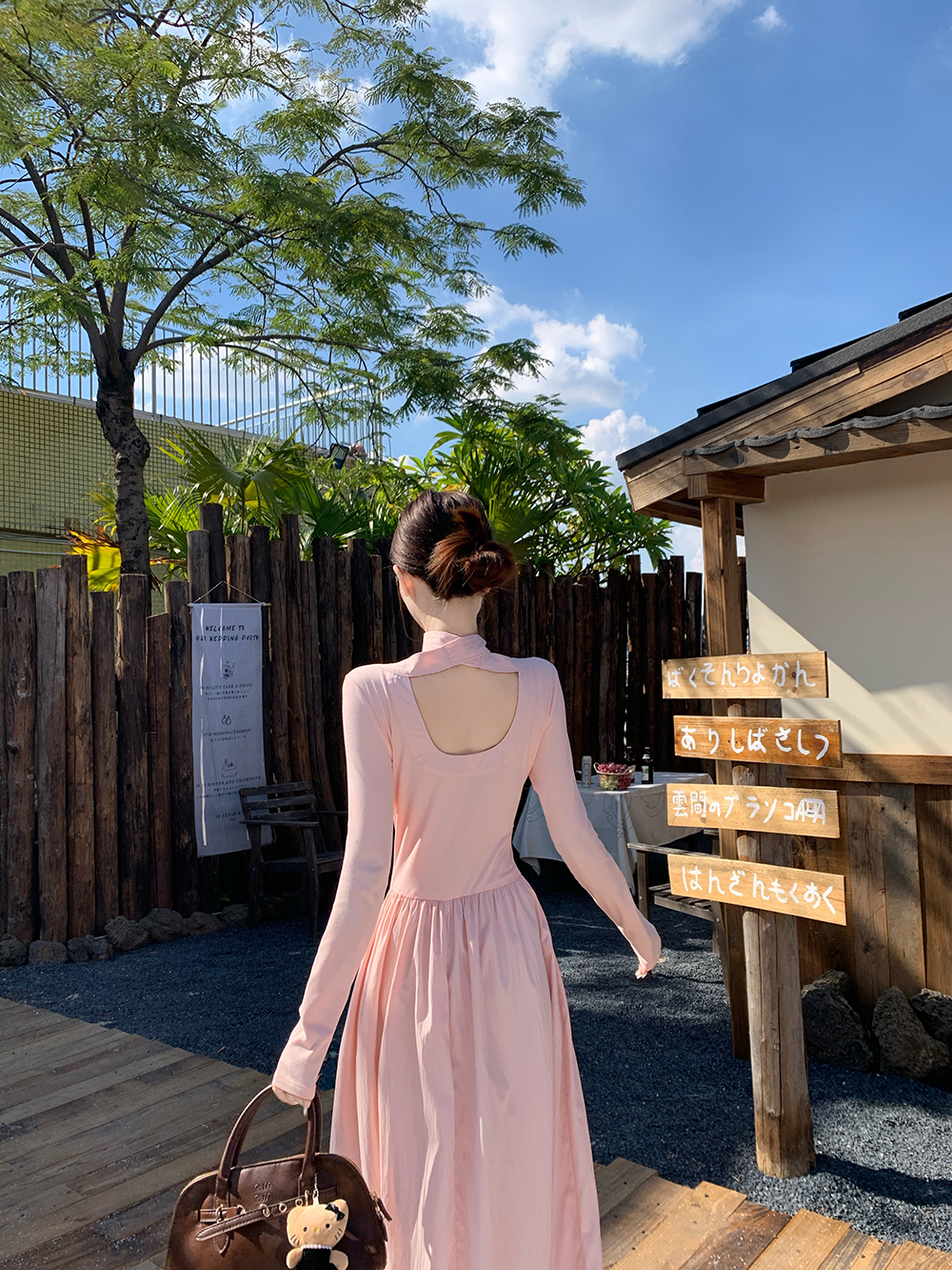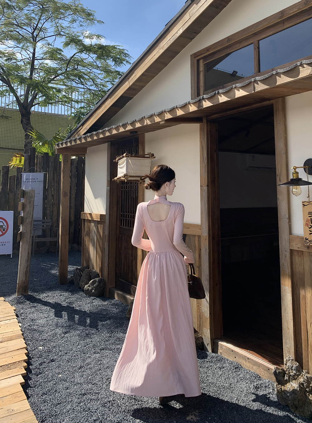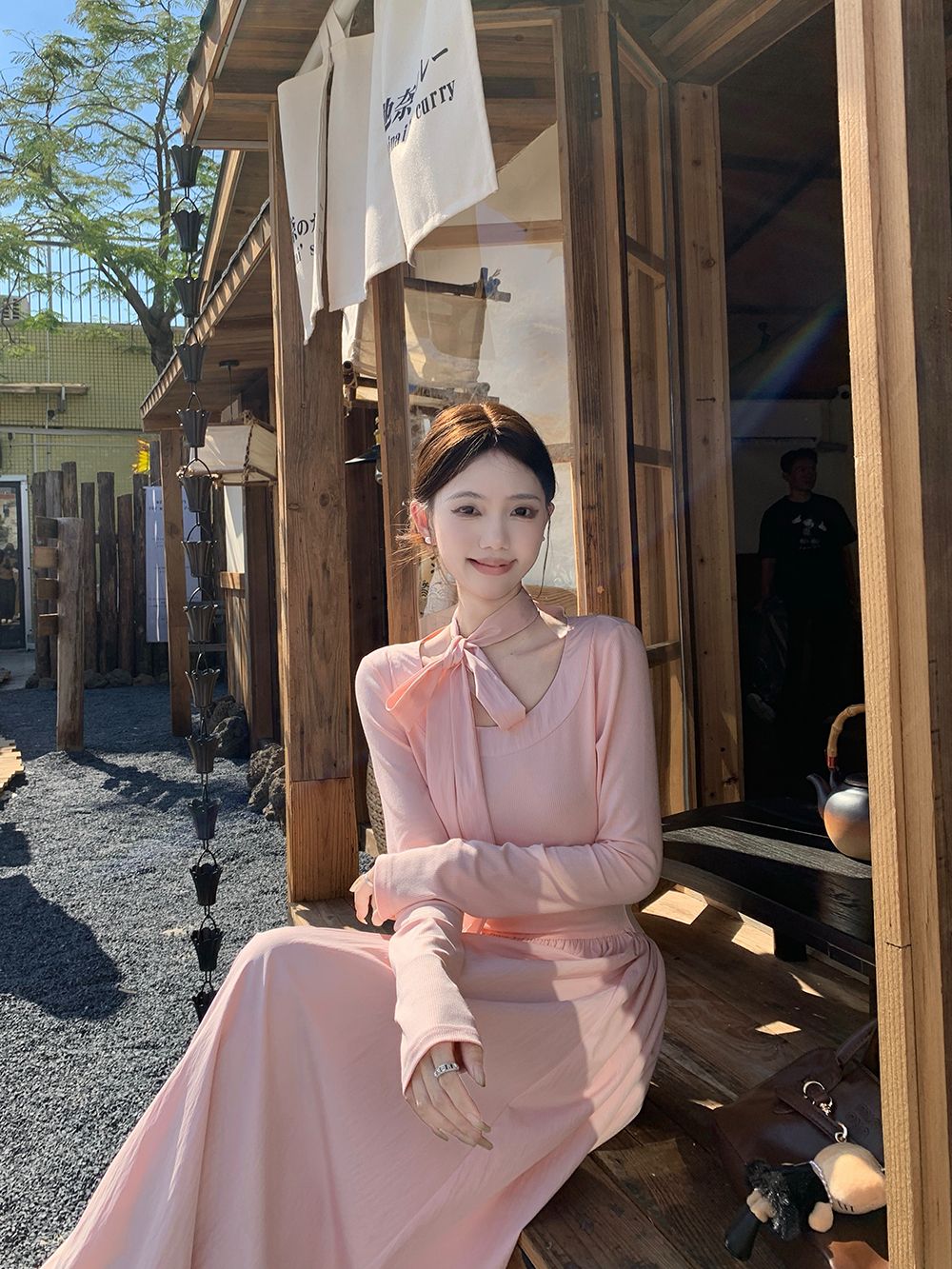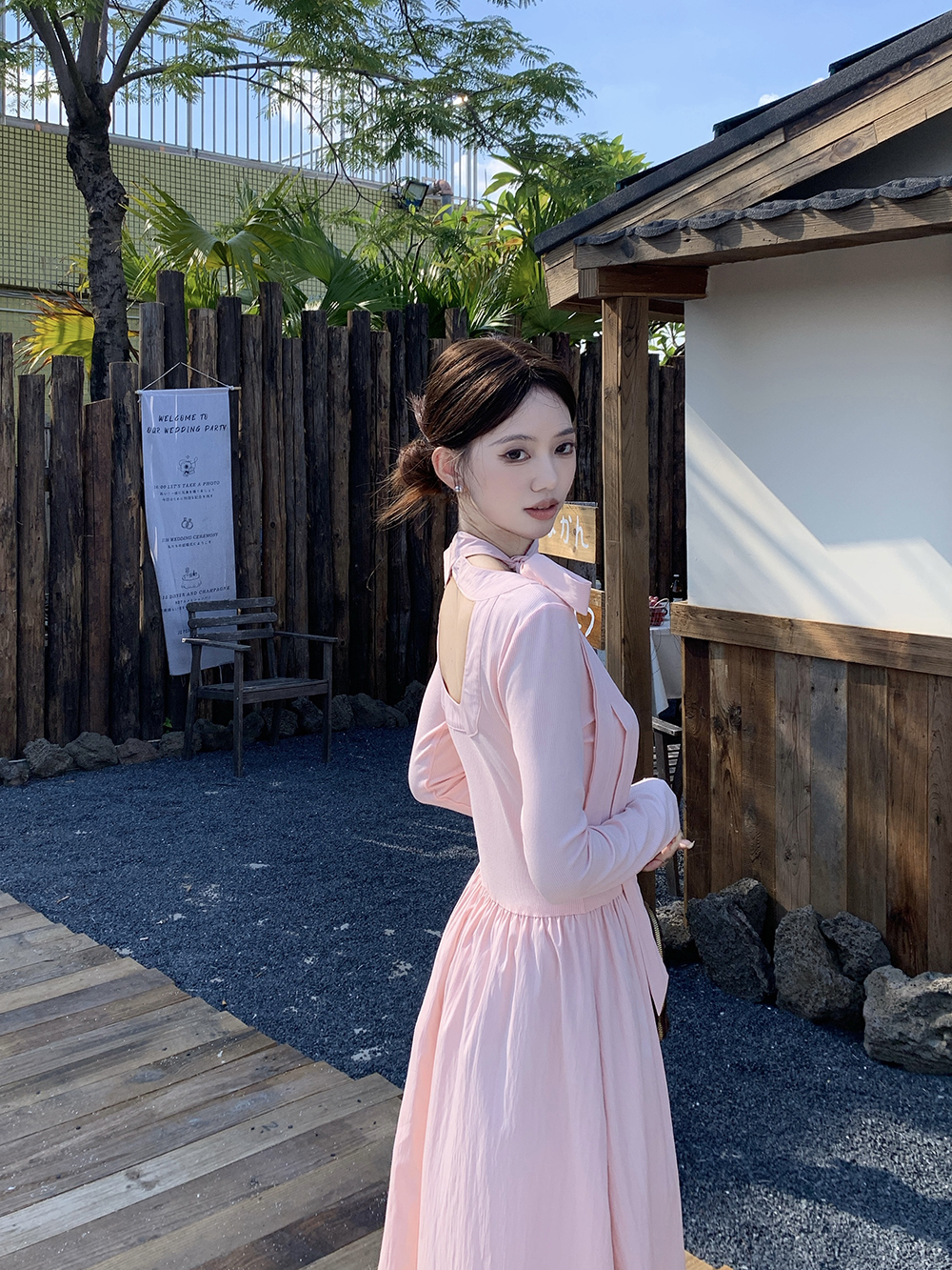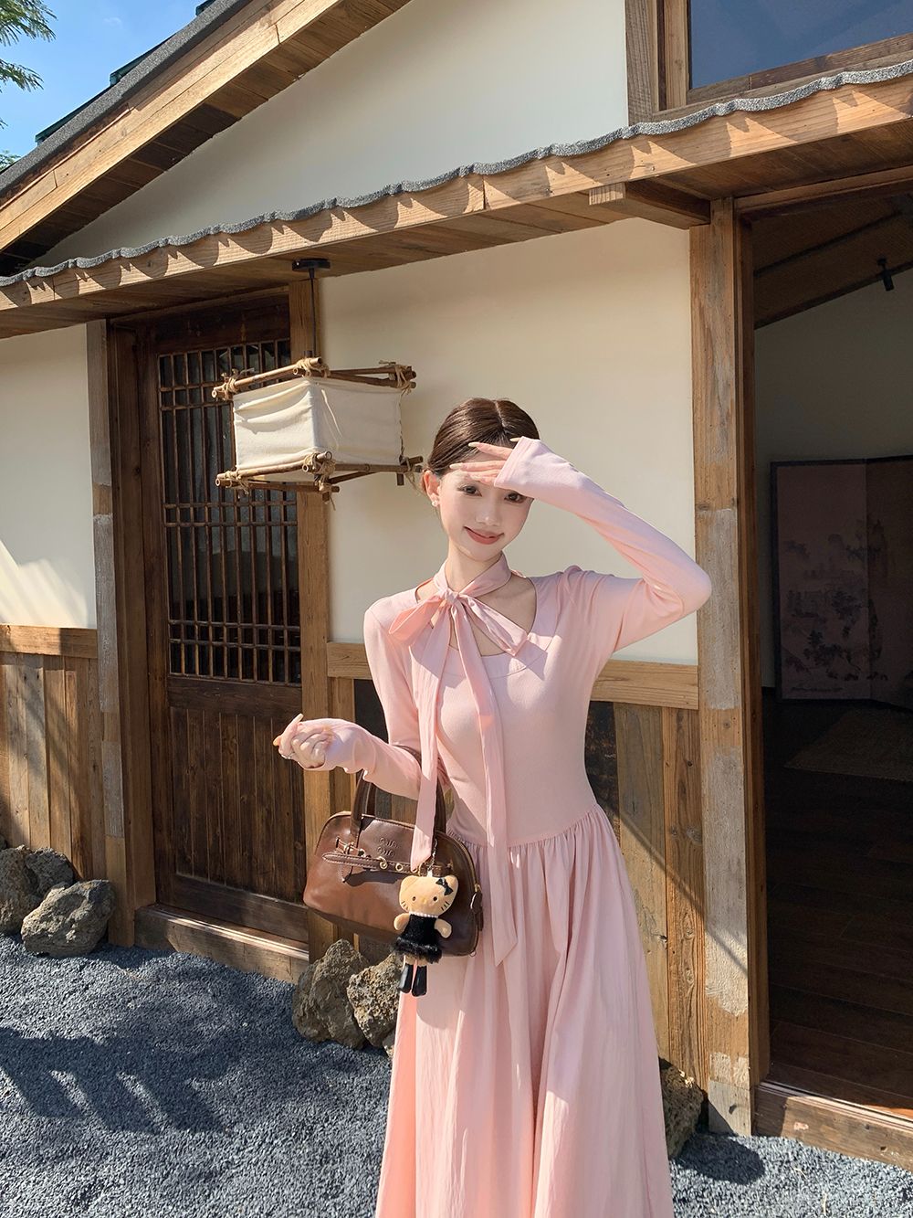 MY17684# 富家千金小香风法式蝴蝶结系带长袖粉A字裙温柔风长裙女裝貨源服裝批發
